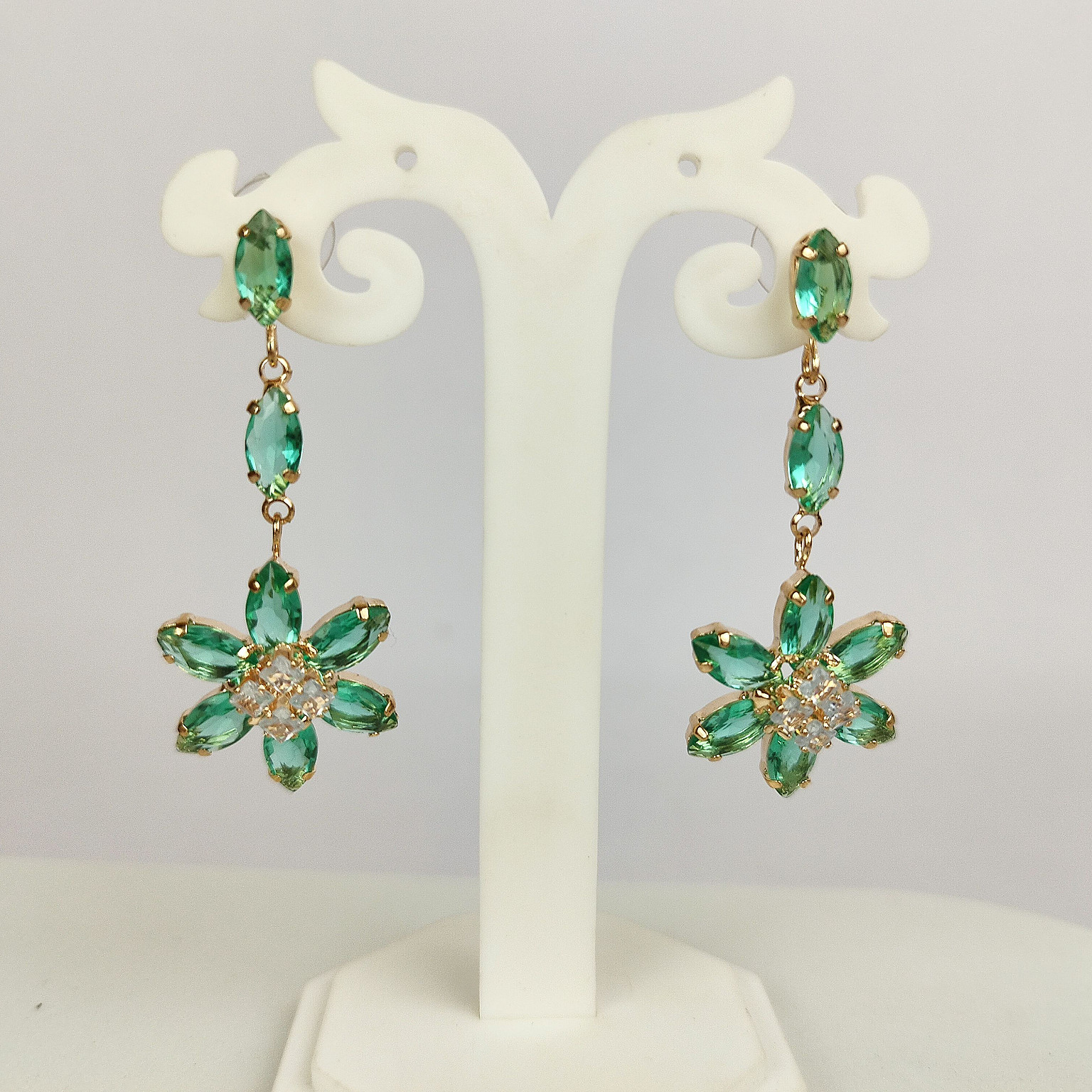 These graceful earrings feature a dangling floral design crafted from delicate green stones and accented with a sparkling center. The cascading gems create an eye-catching effect that will add a beautiful, luminous quality to your look.