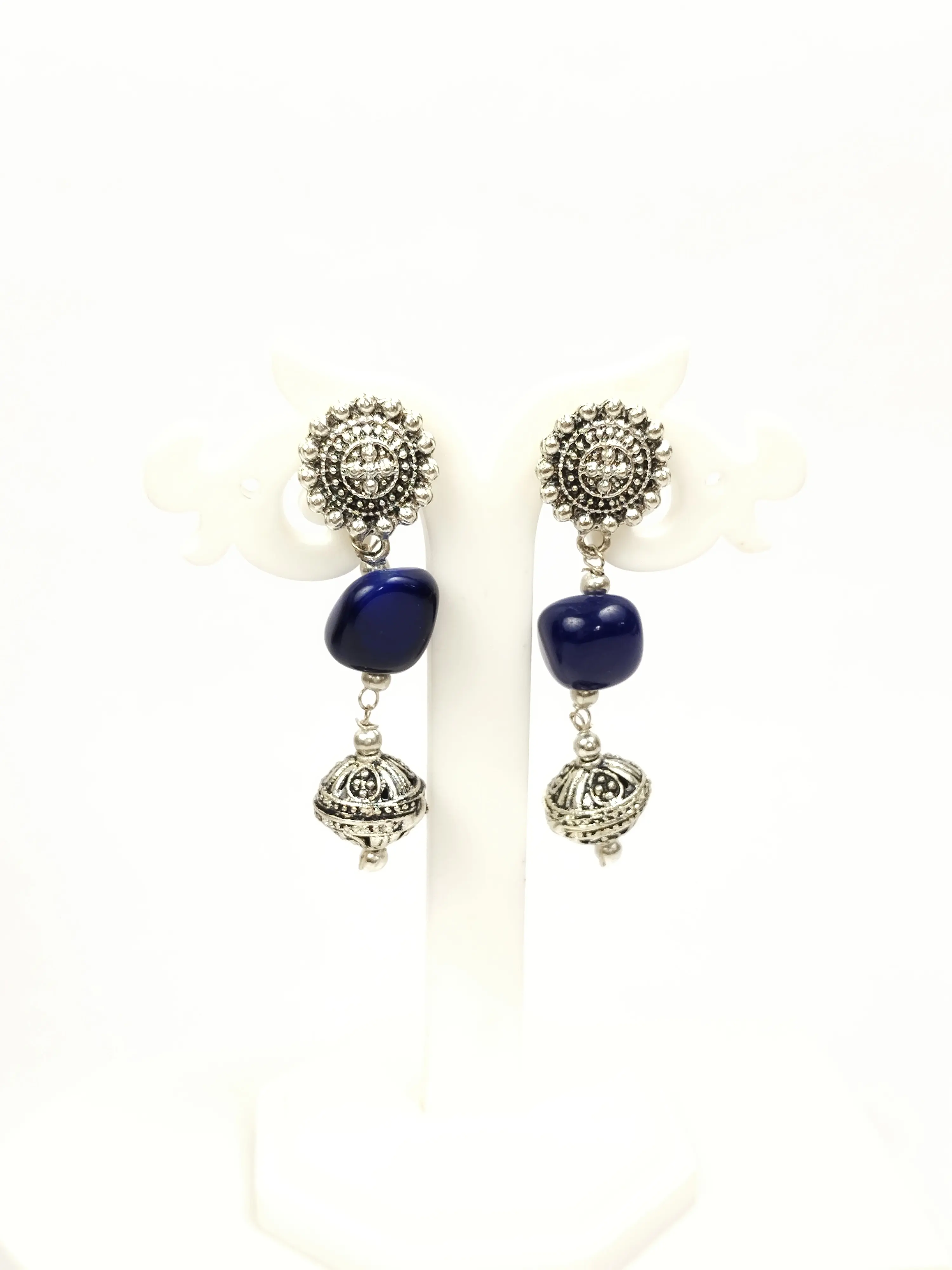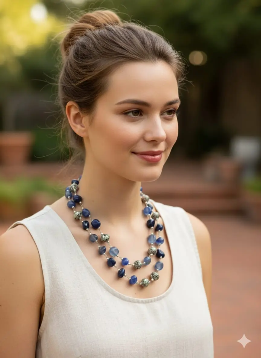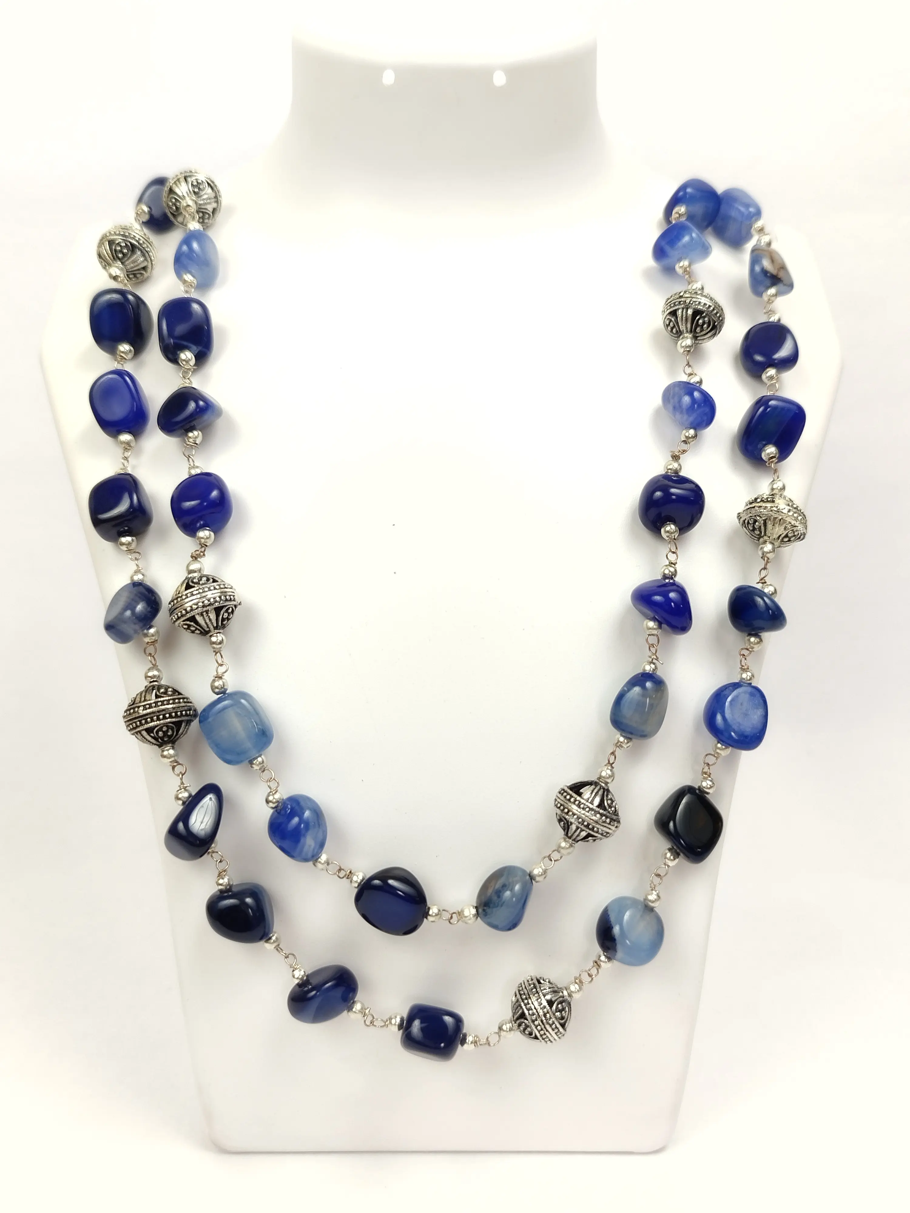 Adorn yourself with this beautiful two-layered necklace, featuring polished blue stones and oxidized beads. The set comes with matching earrings for a complete, elegant look.