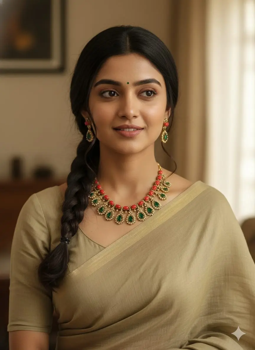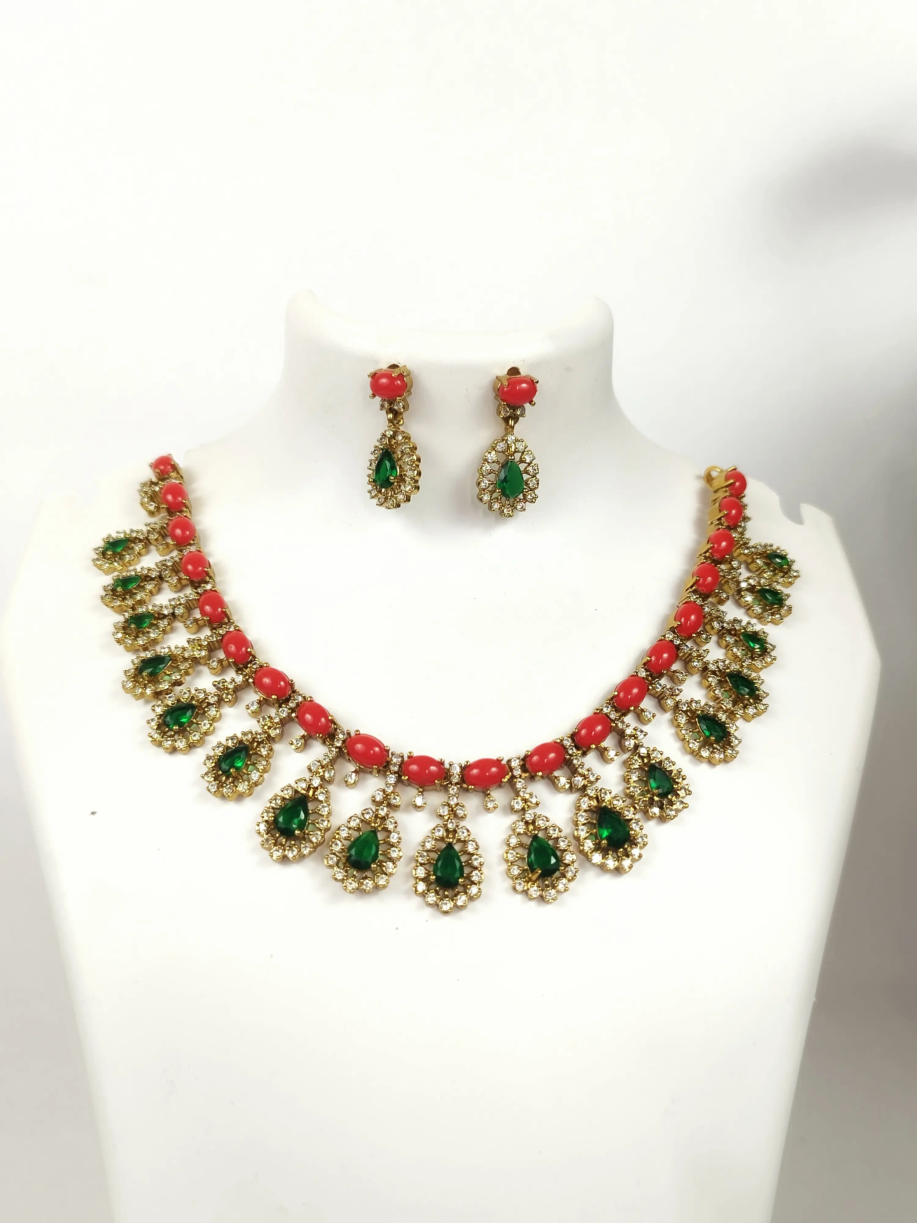 A vibrant, eye-catching gold-toned necklace featuring rich coral beads alternating with dazzling emerald-green teardrop stones set in a halo of white accents. Perfect for adding a festive pop of color to any ethnic ensemble.