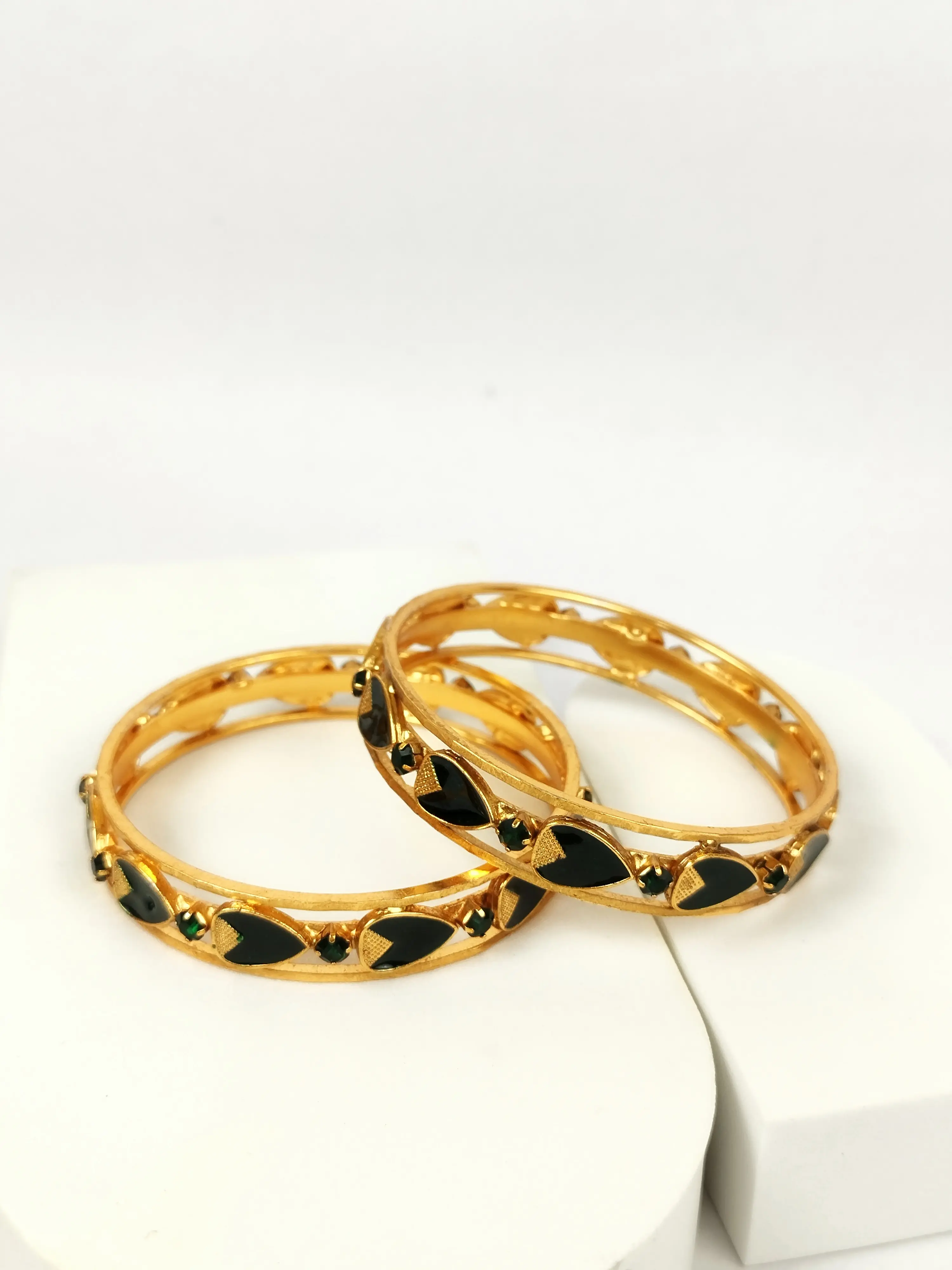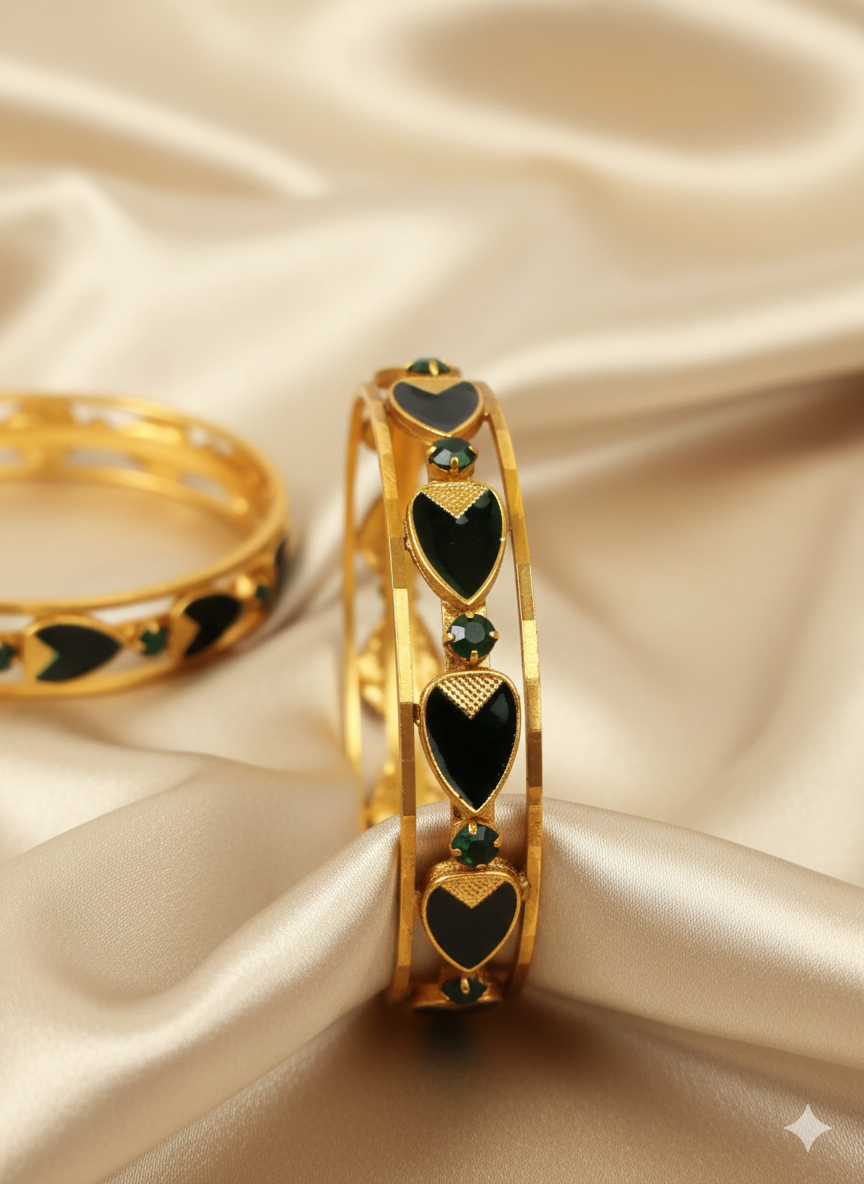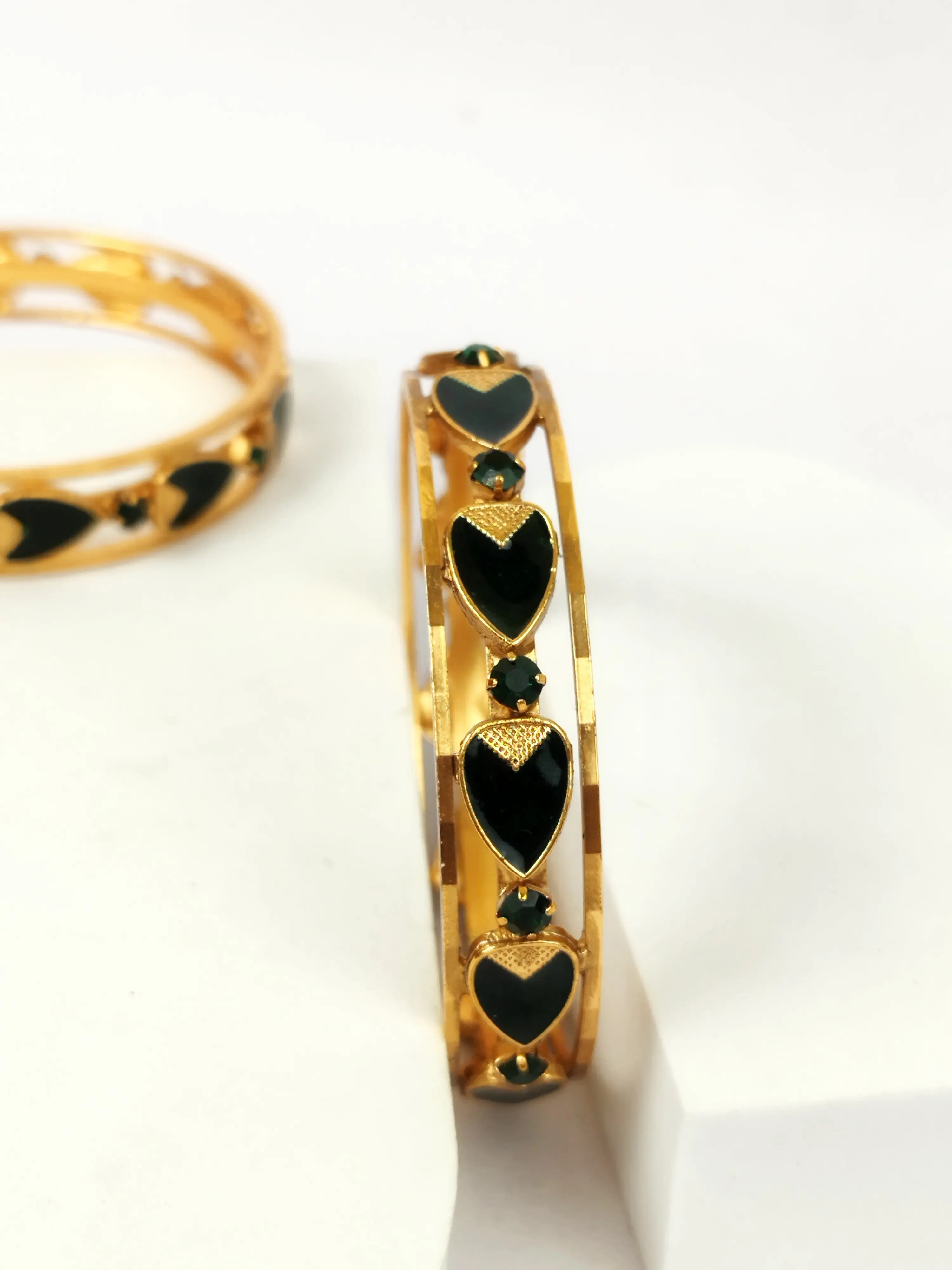 A stylish and modern gold-tone bangle showcasing beautiful dark green enamel heart motifs set against a polished gold frame, accented with small green stones. Perfect for stacking or adding a unique, contemporary touch to your look