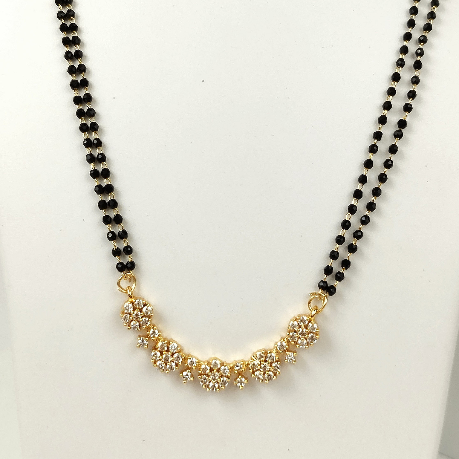 A chic and lightweight double-line mangalsutra featuring a charming centerpiece of sparkling AD (American Diamond) stone flower clusters. Perfect for modern brides seeking daily-wear elegance and traditional meaning.