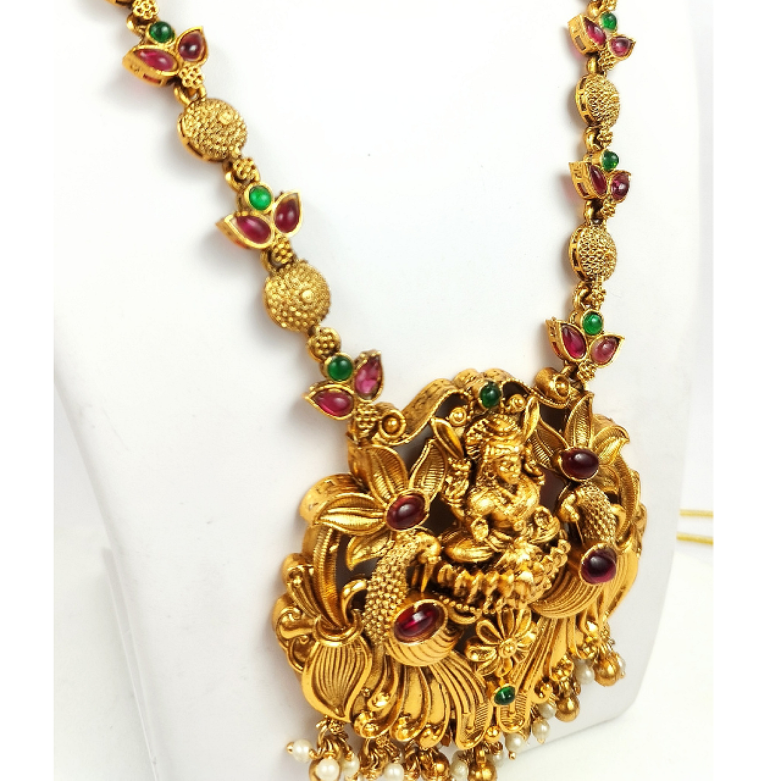 A magnificent long chain necklace in rich matte gold finish, featuring a grand, intricately carved Lakshmi pendant. The chain is accented with traditional gold beads and ruby-green stone motifs, making it a perfect heirloom-quality piece for weddings and major festivals.