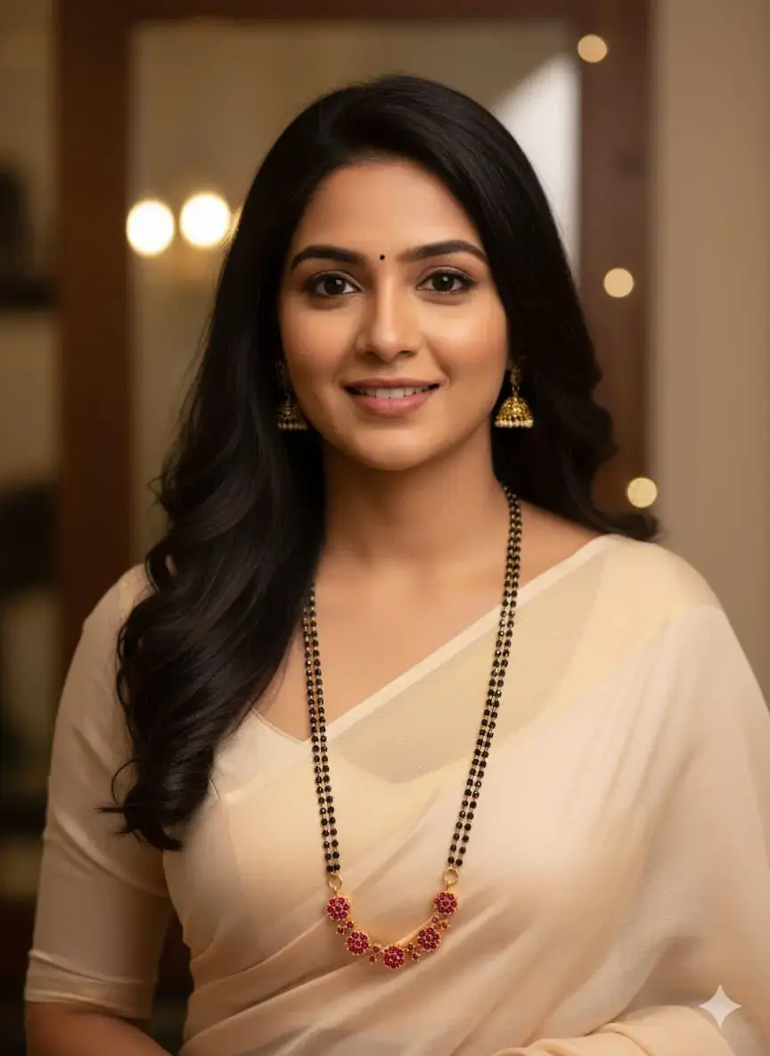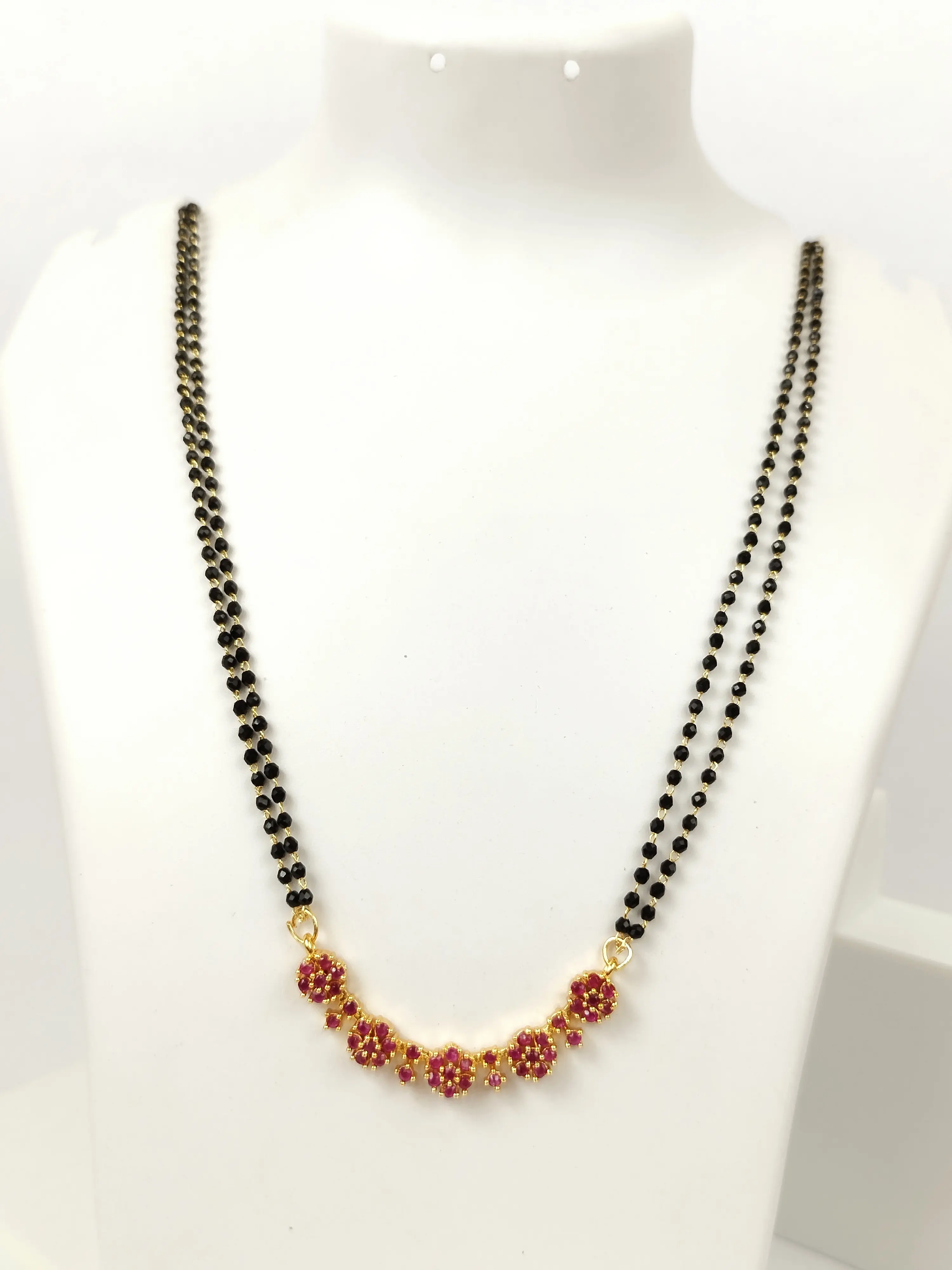 This beautiful double-line black bead chain features a centerpiece of rich ruby-red flower clusters. The vibrant color adds a traditional yet sophisticated touch, making it ideal for daily wear or small functions.