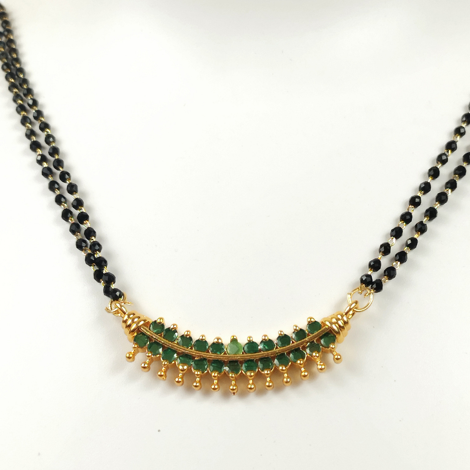 A stunning contemporary mangalsutra featuring a sleek double-line black bead chain and a unique centerpiece. The gold-toned arc is beautifully detailed with a row of luminous emerald green stones and finished with delicate gold bead danglers, offering a chic yet meaningful look for everyday wear
