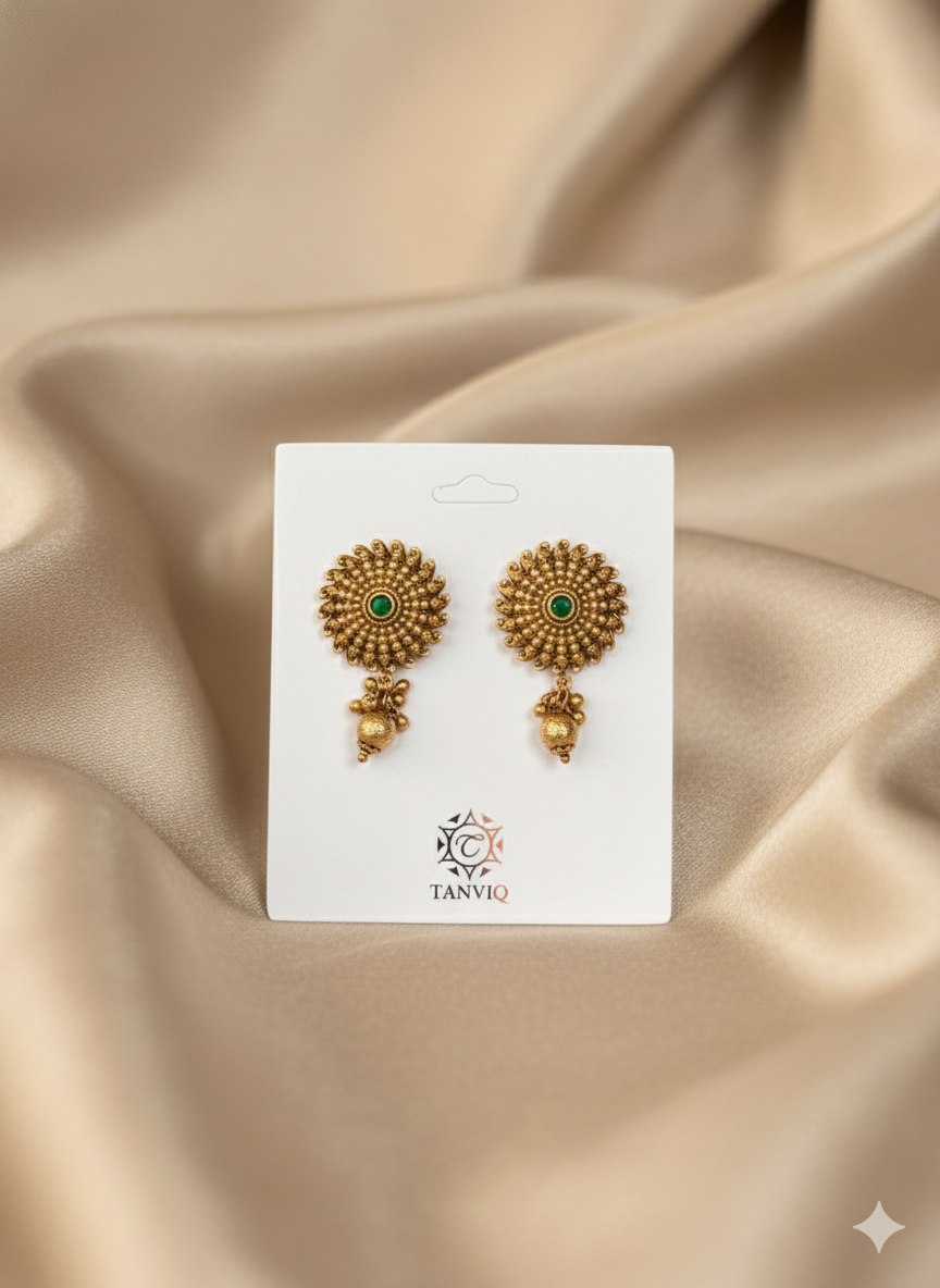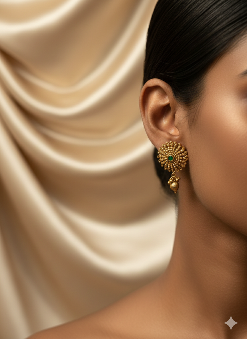 A pop of rich color for your traditional attire. These golden stud earrings feature a detailed floral filigree design with a vibrant green stone at the heart and a classic pearl drop.
