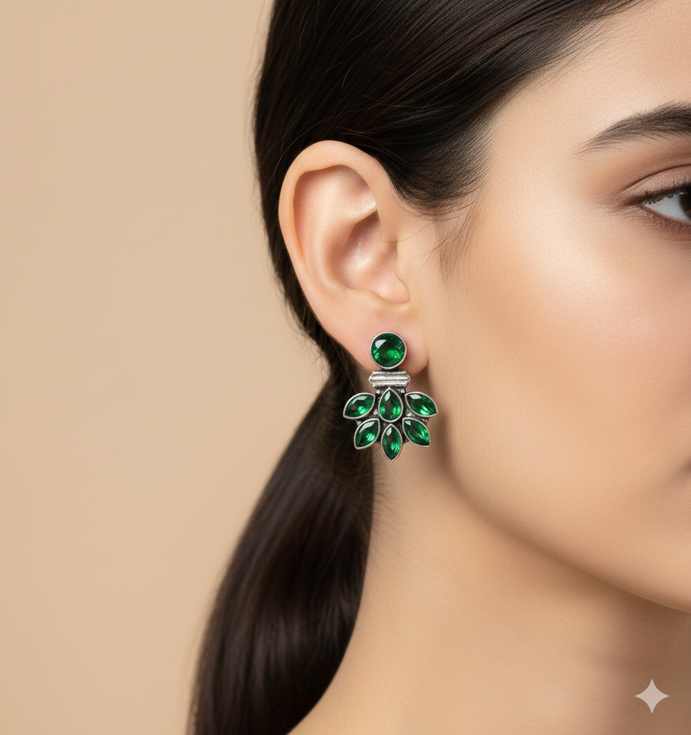 Adorn your ears with the captivating Emerald Bloom Studs. These exquisite earrings feature vibrant green marquise-cut stones arranged in a delicate floral pattern, creating a sophisticated and eye-catching accessory perfect for adding a touch of nature-inspired glamour to any look.