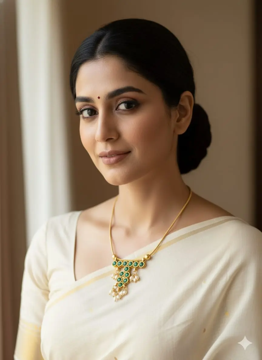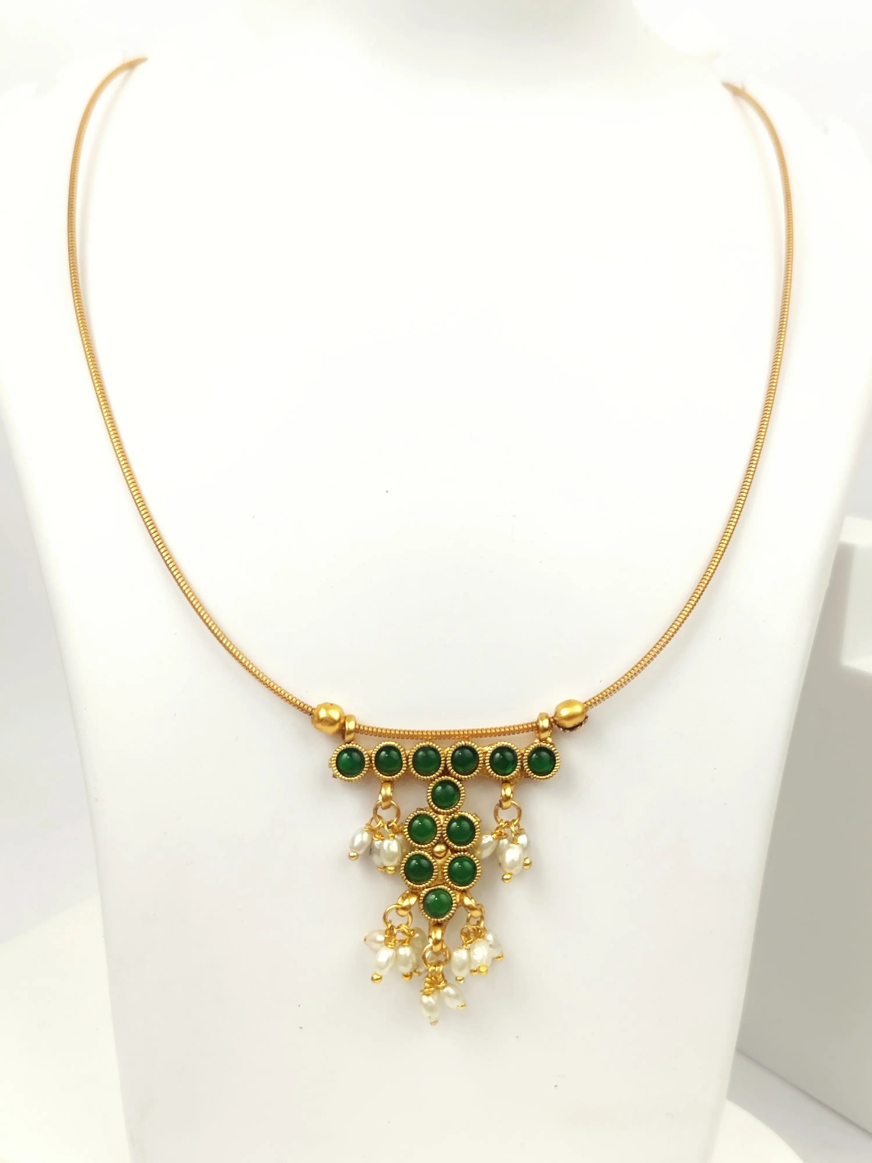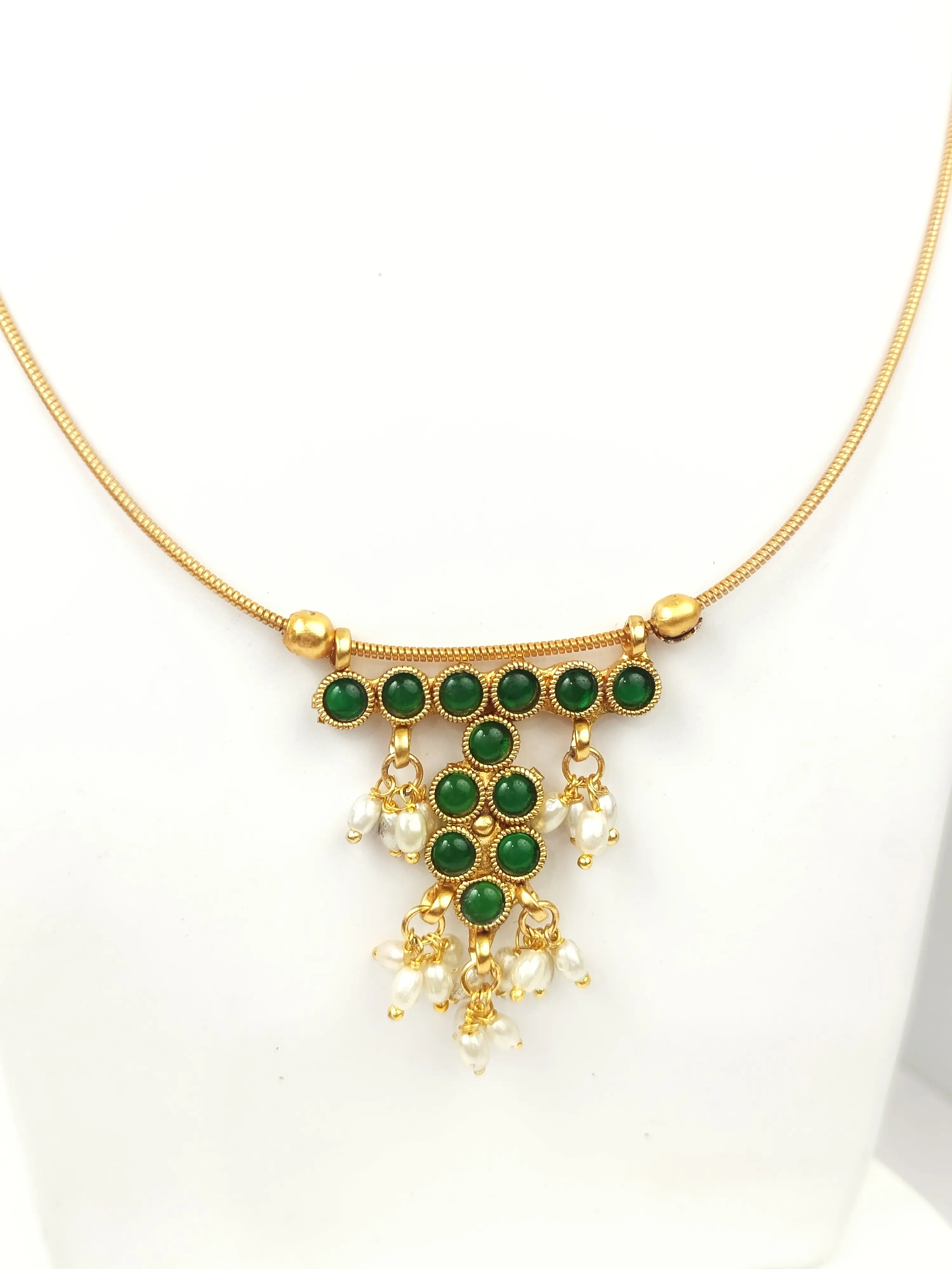 A delicate minimalist gold cable featuring a gorgeous pendant cluster of emerald green cabochons and elegant pearl drops. Lightweight and sophisticated, it offers a traditional touch ideal for daily wear or layering.