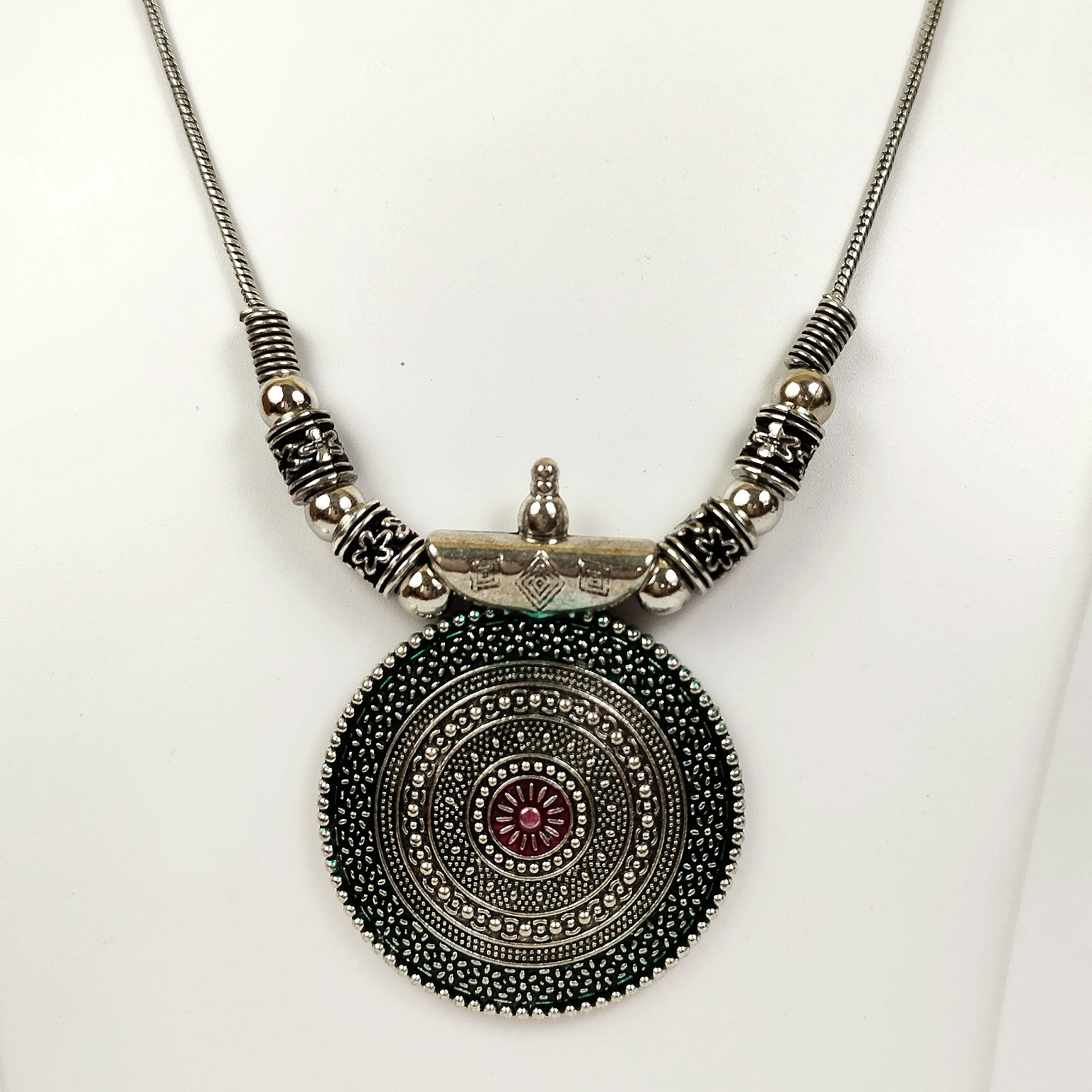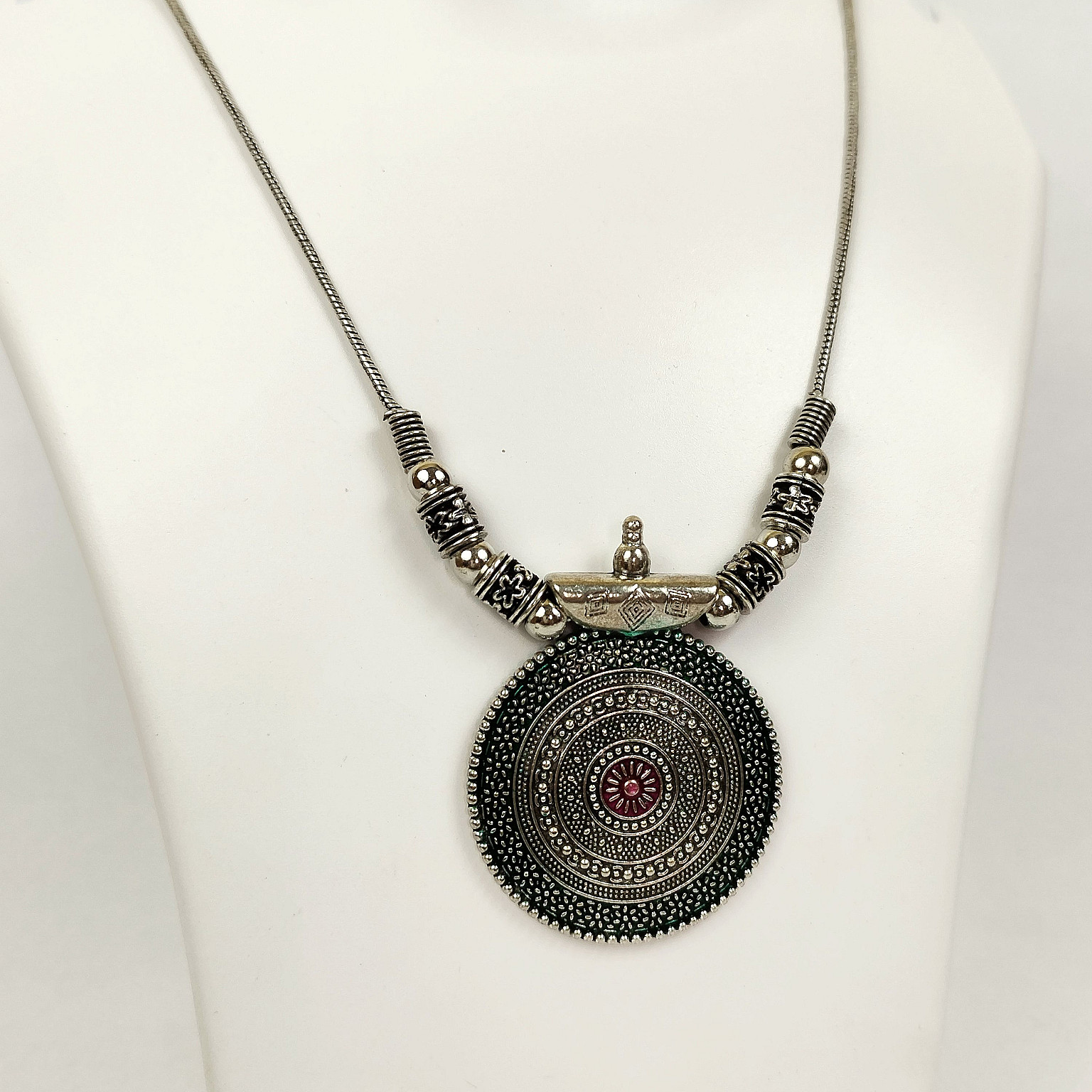 Make a statement with this oxidized silver necklace. Its large medallion pendant with a sparkling emerald-green stone at the center brings a touch of vibrant sophistication to your look.