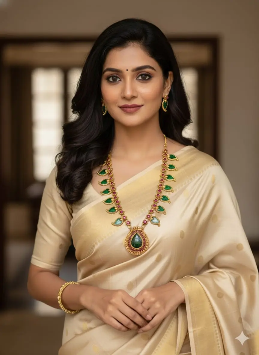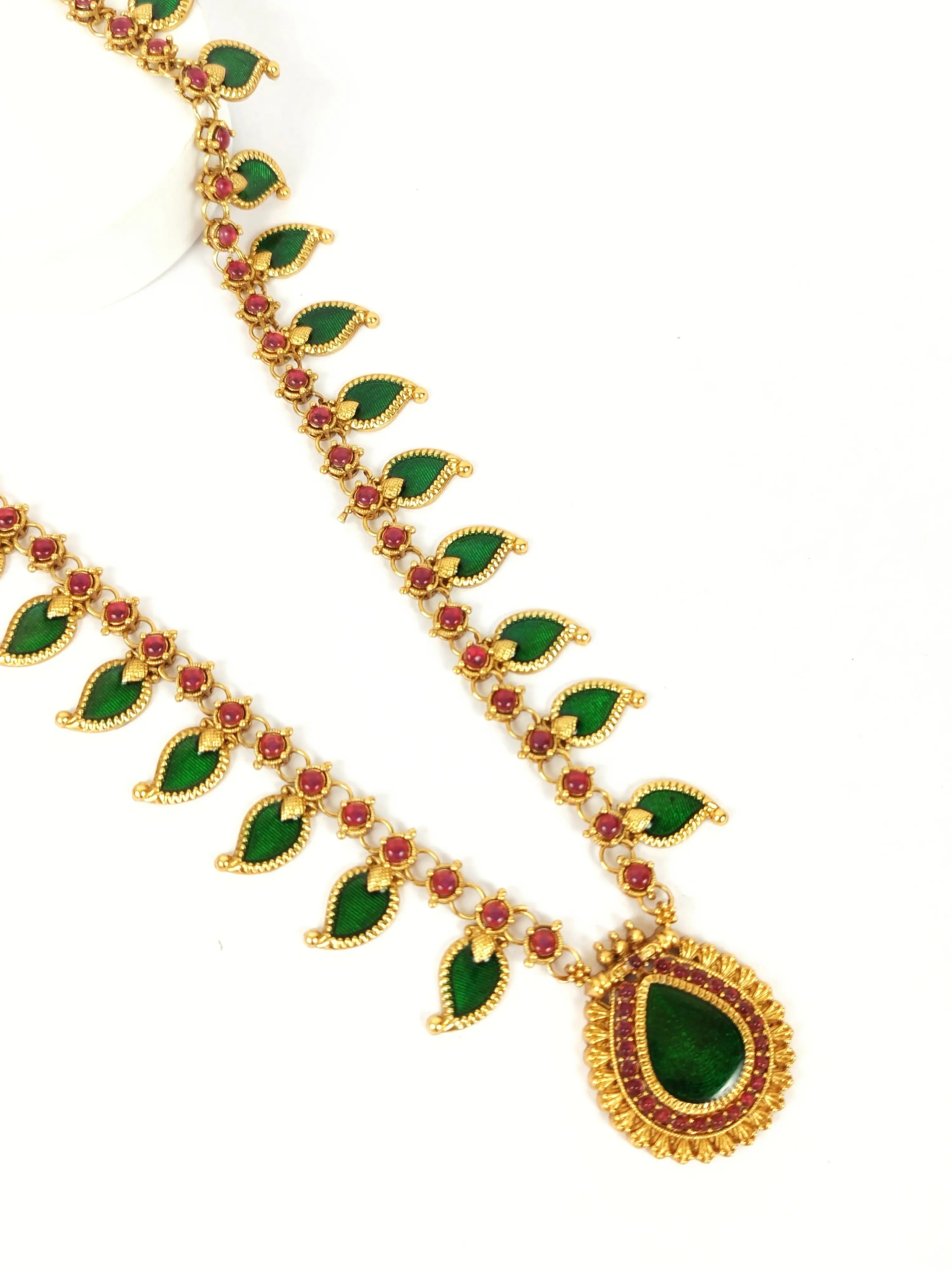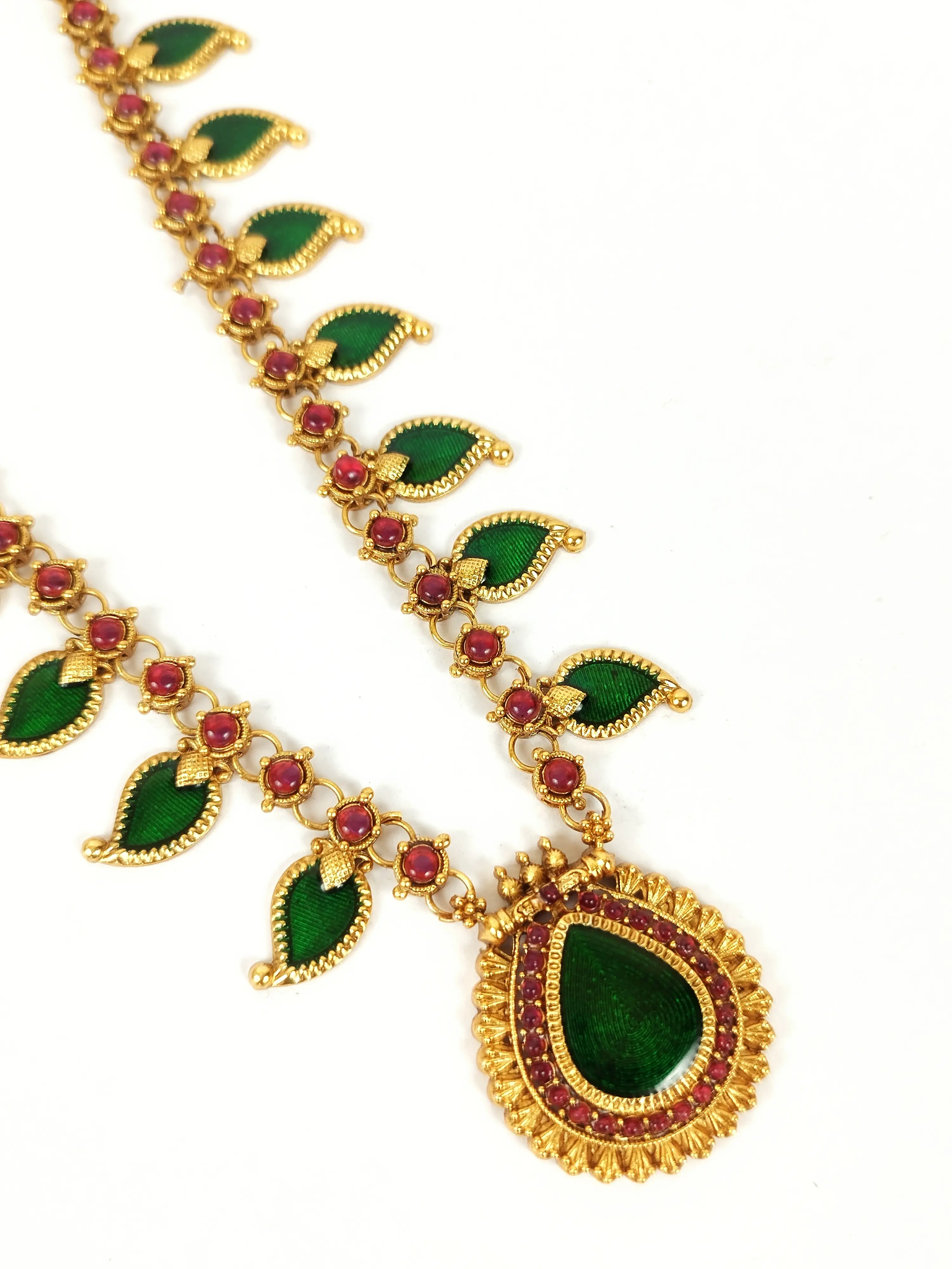 A vibrant gold-plated choker featuring beautiful, deep green enamel work on the mango leaf motifs, highlighted by ruby stones. The prominent matching pendant creates a bold and colorful statement, perfect for festive attire. Disclaimer: Product image colors may vary slightly due to lighting.