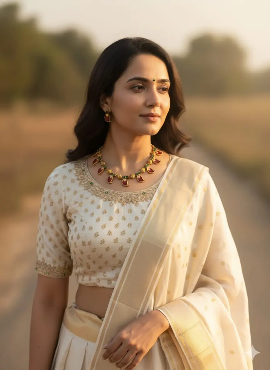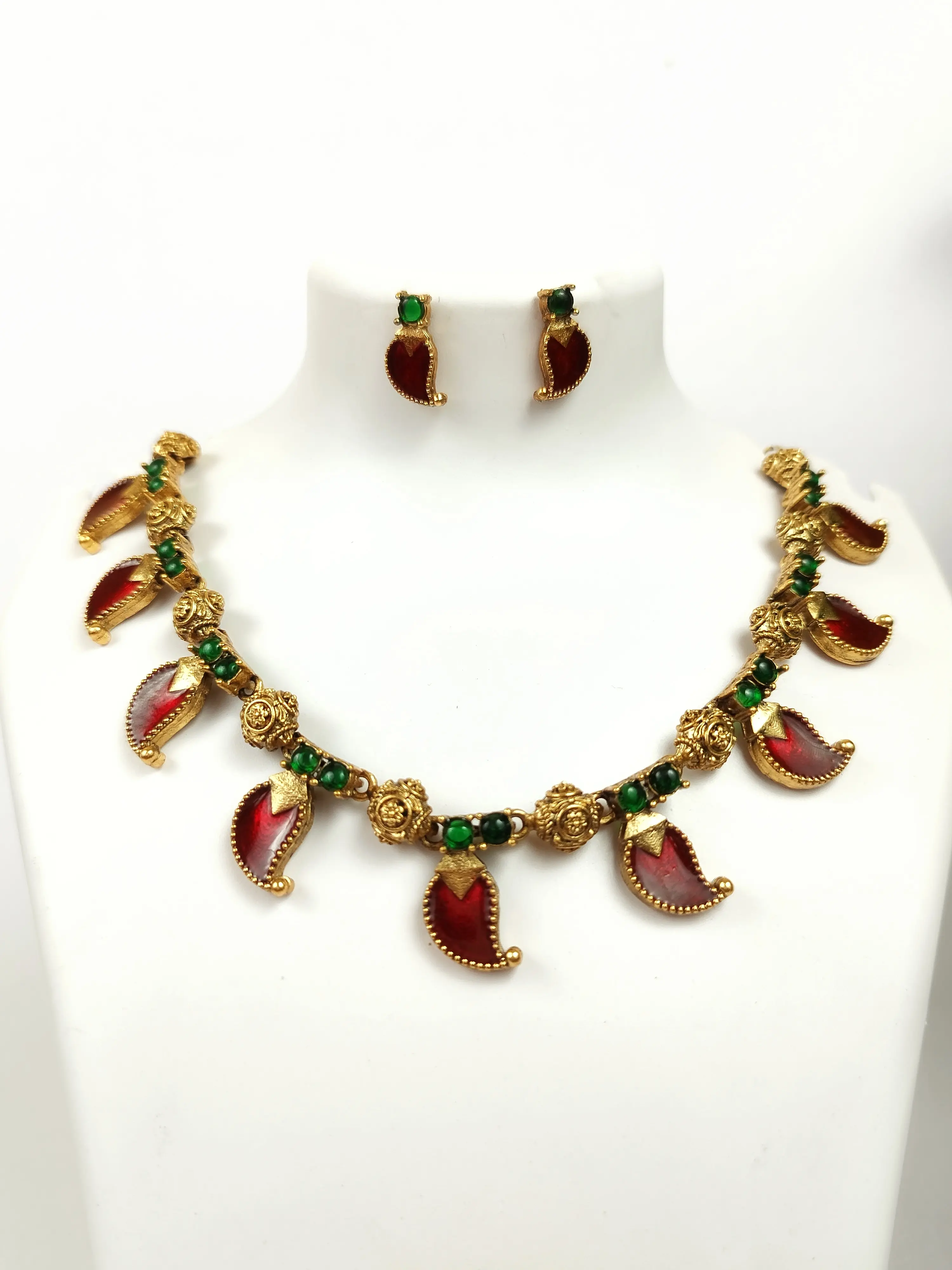 A rustic yet beautiful antique gold-finish choker featuring classic mango (paisley) motifs detailed with deep red enamel. The matching stud earrings complete this charming, ethnic look.
