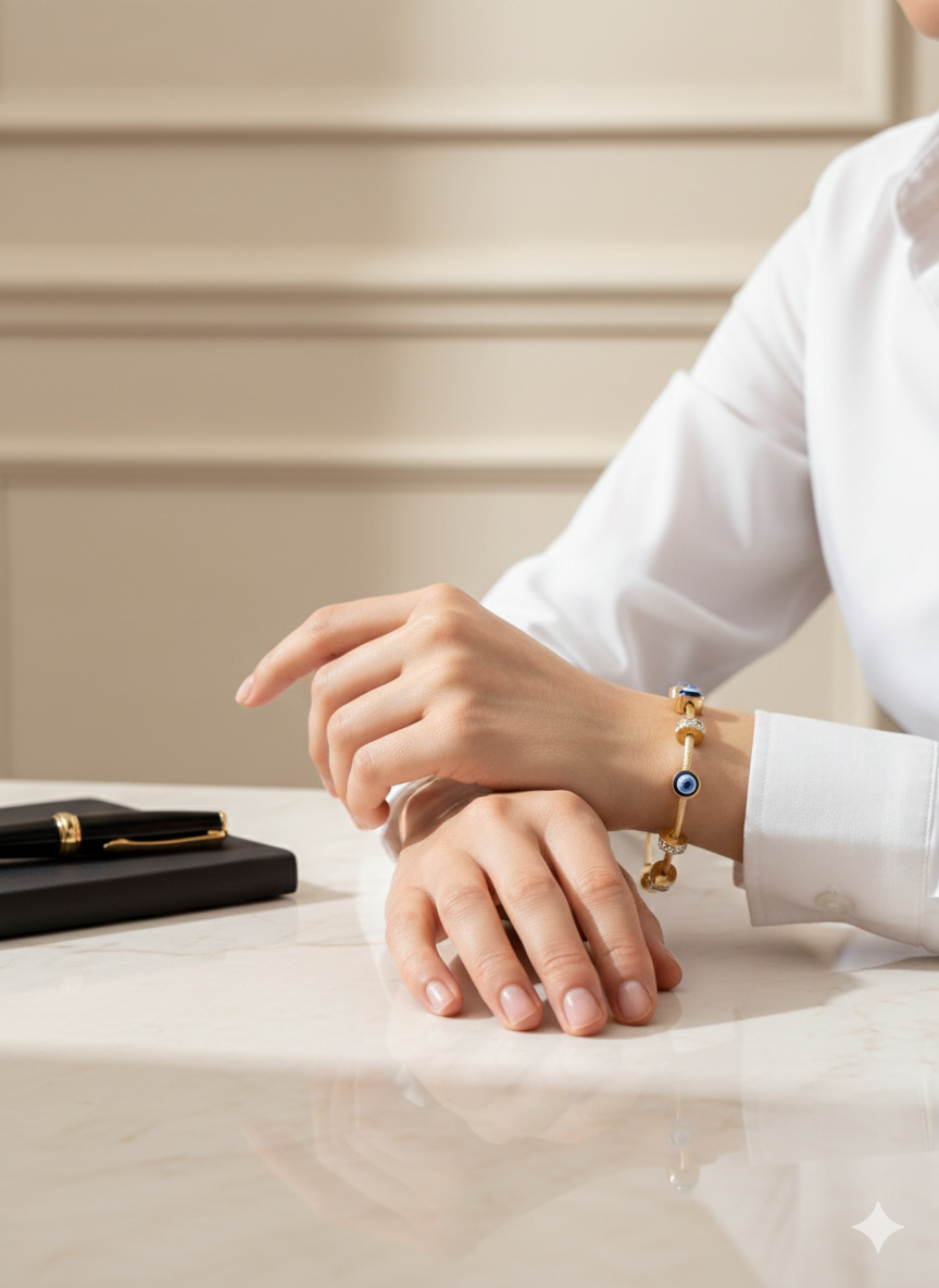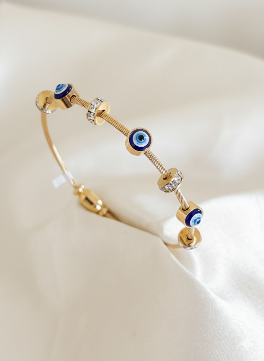 Stay stylish and protected with this Evil Eye Charm Bangle. Featuring beautifully enameled evil eye beads combined with sparkling crystal accents, this bangle is believed to ward off negativity while keeping your fashion game strong. The gold-plated design ensures durability and shine, making it suitable for daily wear. Its adjustable fit allows comfort for all wrist sizes. A thoughtful gift option for loved ones, symbolizing care, protection, and good vibes. Perfect for stacking with other bangles or wearing solo as a chic accessory.