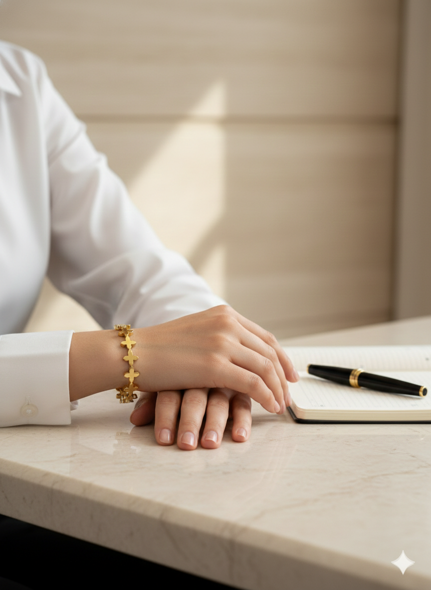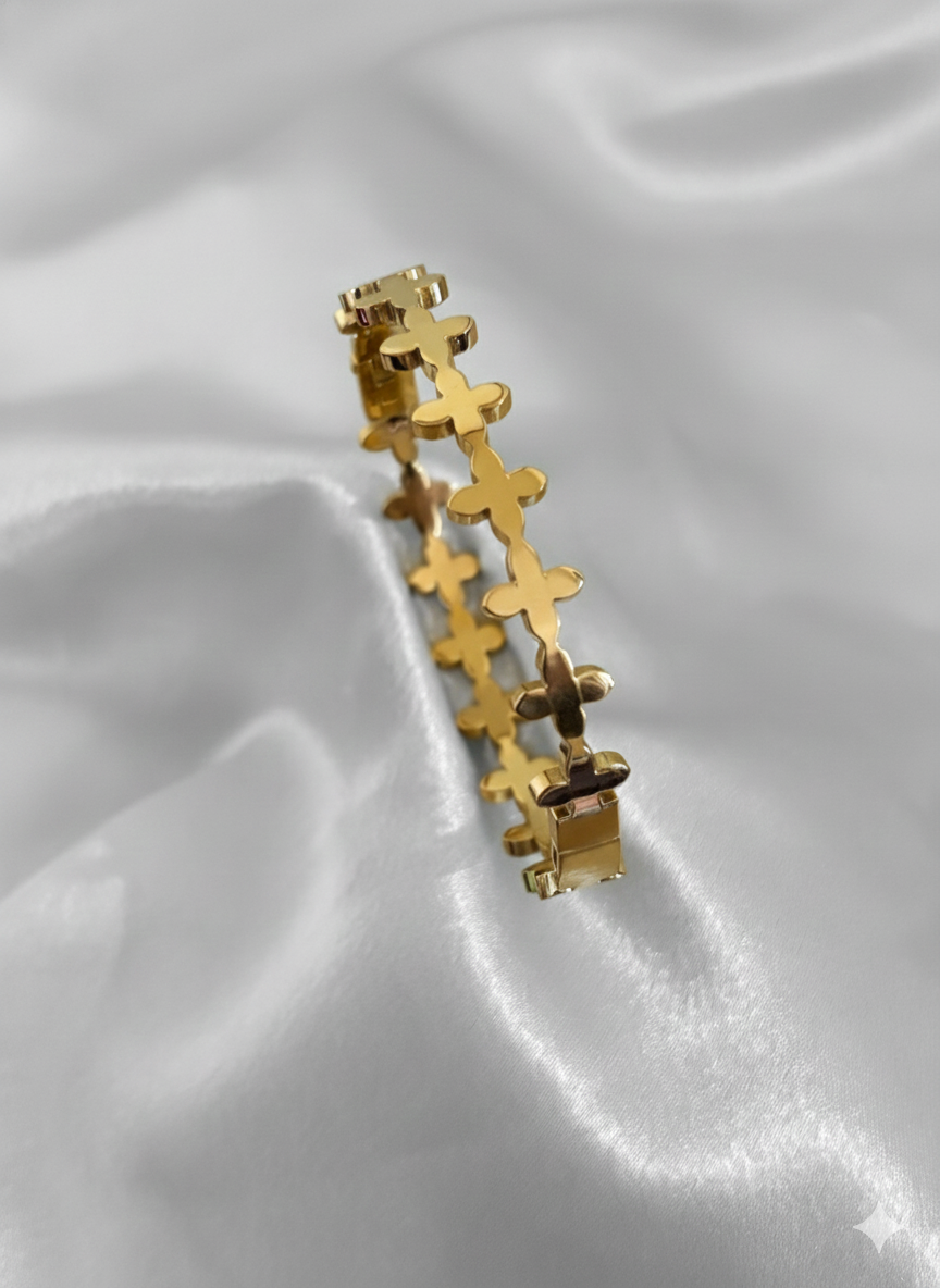 Celebrate faith and fashion with this beautifully crafted gold eternity bangle. Featuring a continuous sequence of polished cross links, this piece offers a sophisticated way to wear religious symbolism. The high-shine finish and secure box clasp ensure durability and style for daily wear