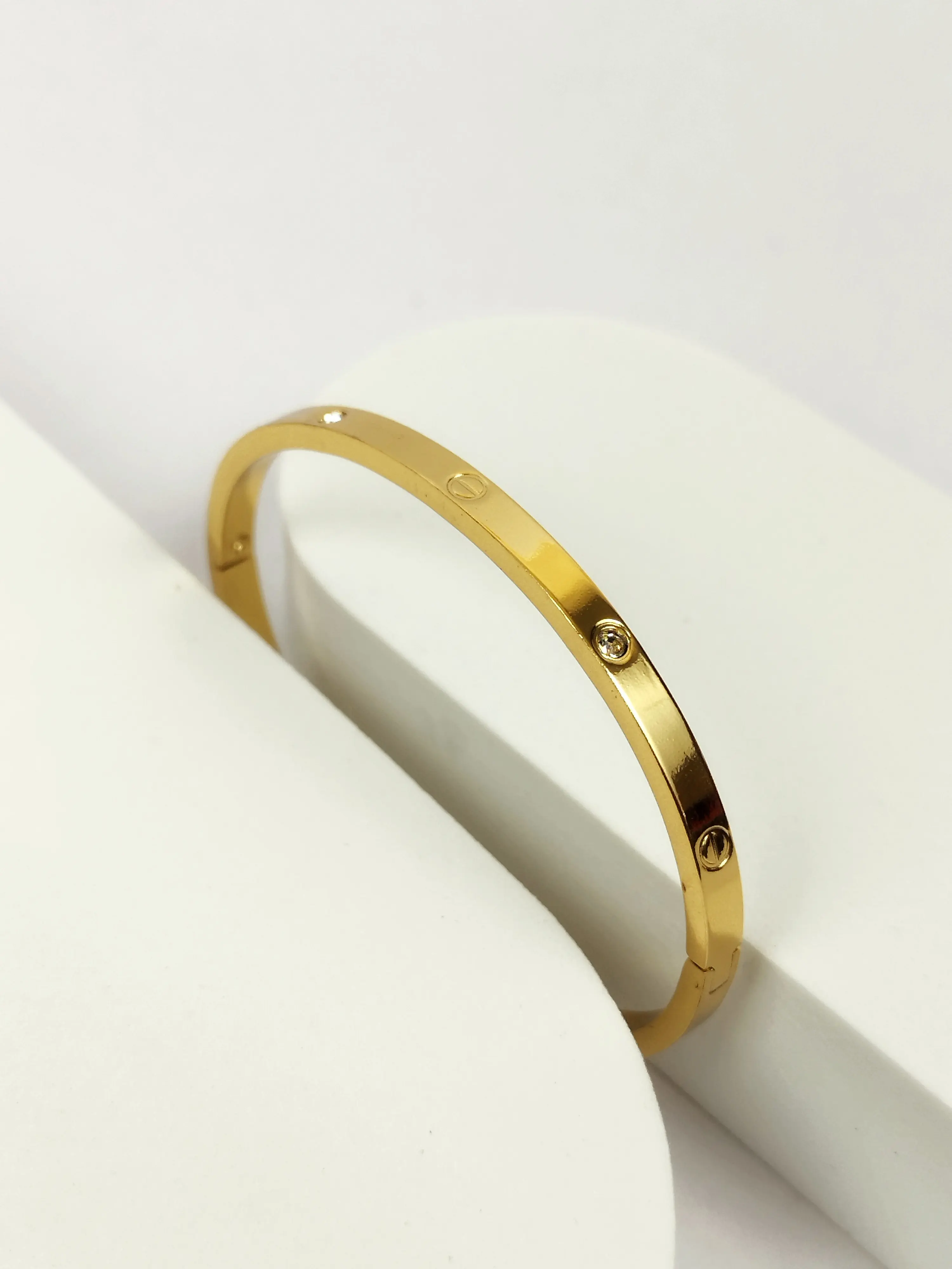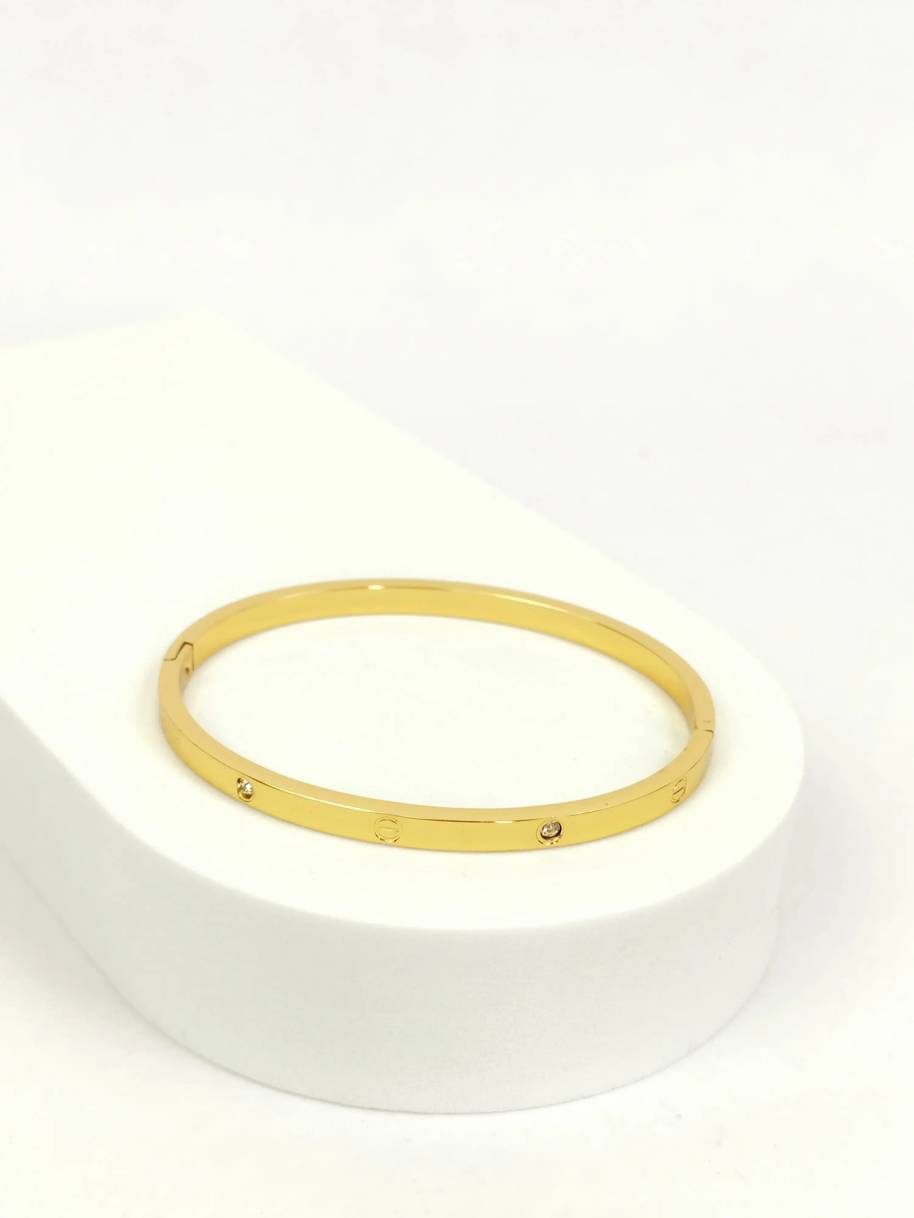 A sleek and minimalist piece for the modern jewelry lover. This gold bracelet features a clean, open-end design that is both contemporary and comfortable. It is subtly accented with three delicate cubic zirconia stones, providing just the right amount of sparkle for a refined and polished look