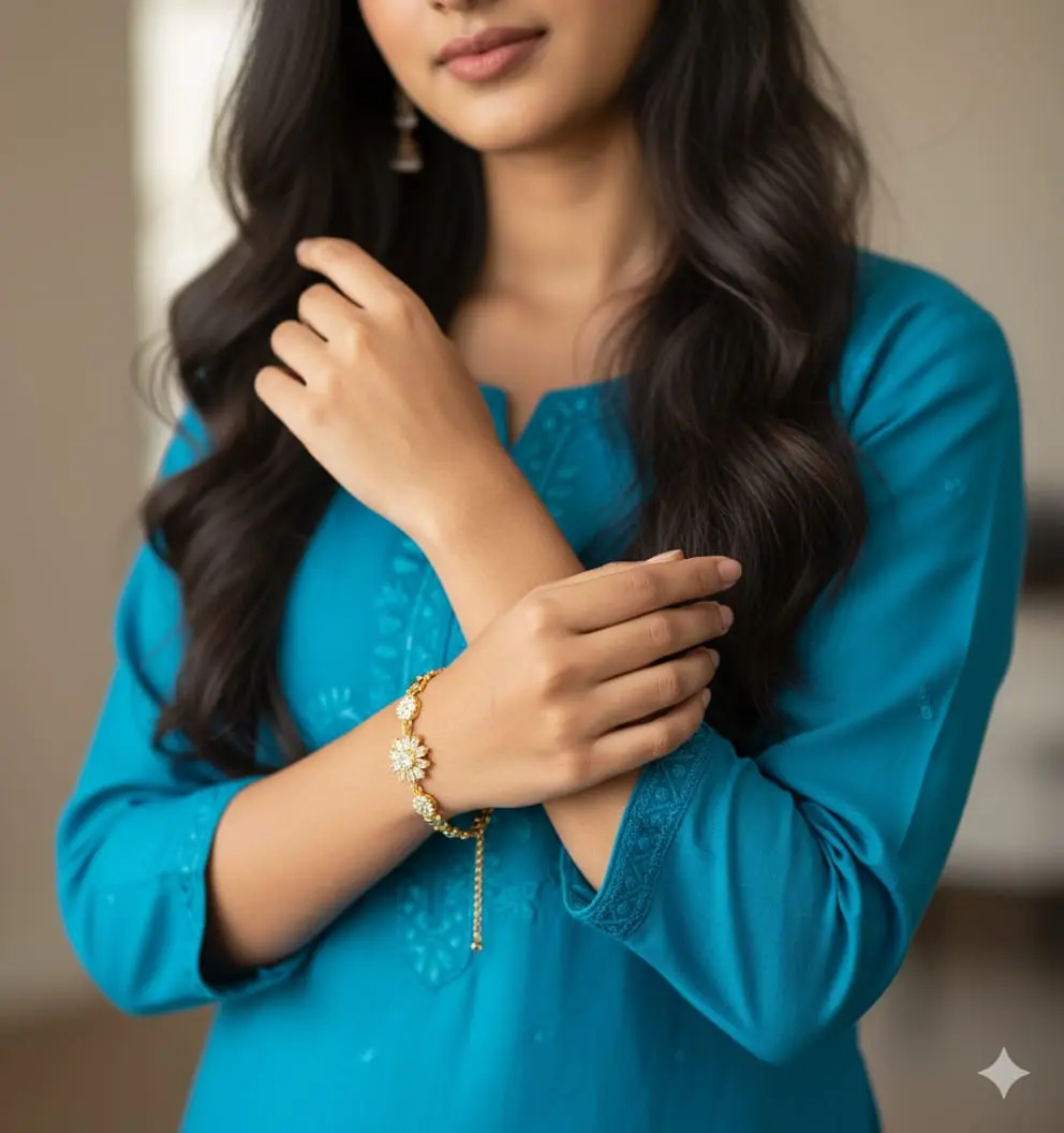 This elegant gold-toned bracelet features a unique design of delicate leaves and a sparkling floral centerpiece, making it a sophisticated accessory for any outfit.