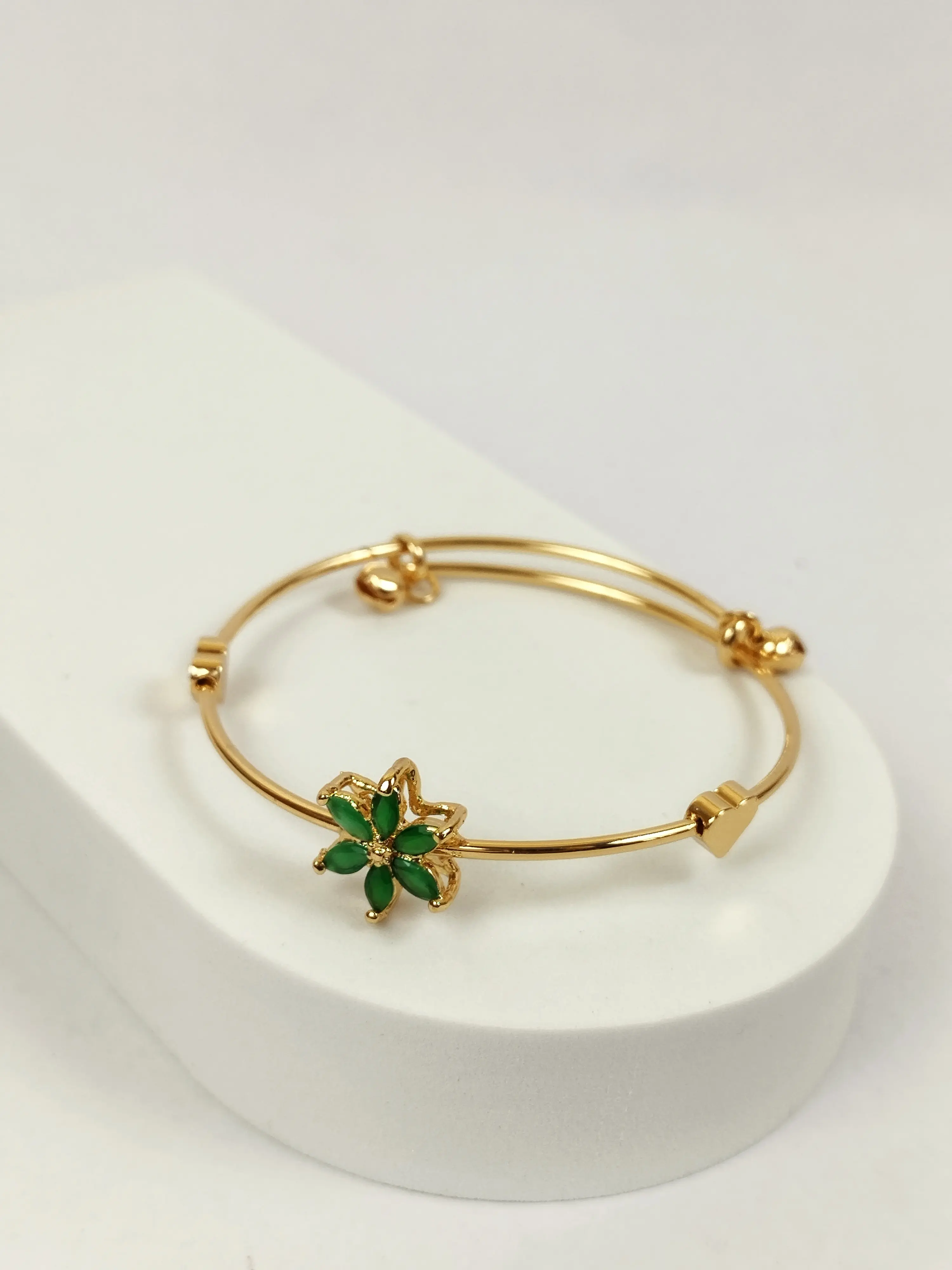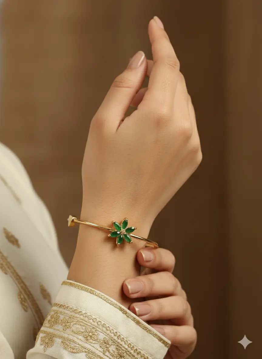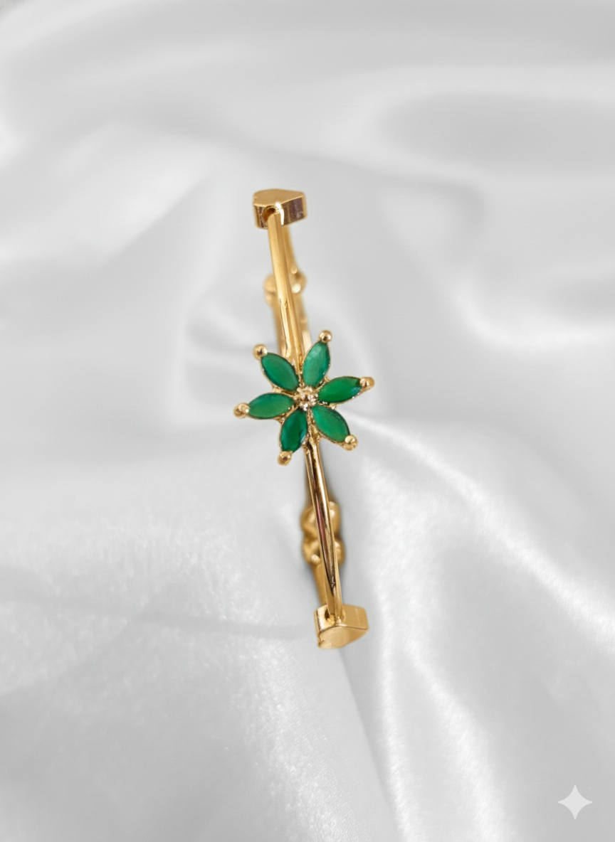 Bring nature-inspired elegance to your collection with this Green Floral Bangle Bracelet. The vibrant green floral centerpiece stands out beautifully against the polished gold-plated band, symbolizing growth and harmony. Designed for comfort and style, this bracelet is perfect for everyday wear as well as festive occasions. Pair it with sarees, kurtis, or even western outfits for a fresh, stylish vibe. A versatile piece that combines tradition with modern fashion, making it an ideal gift for jewelry lovers.