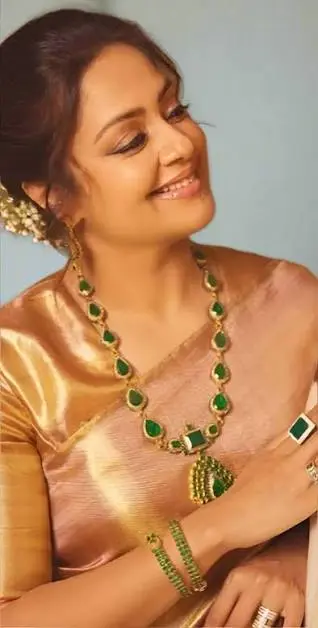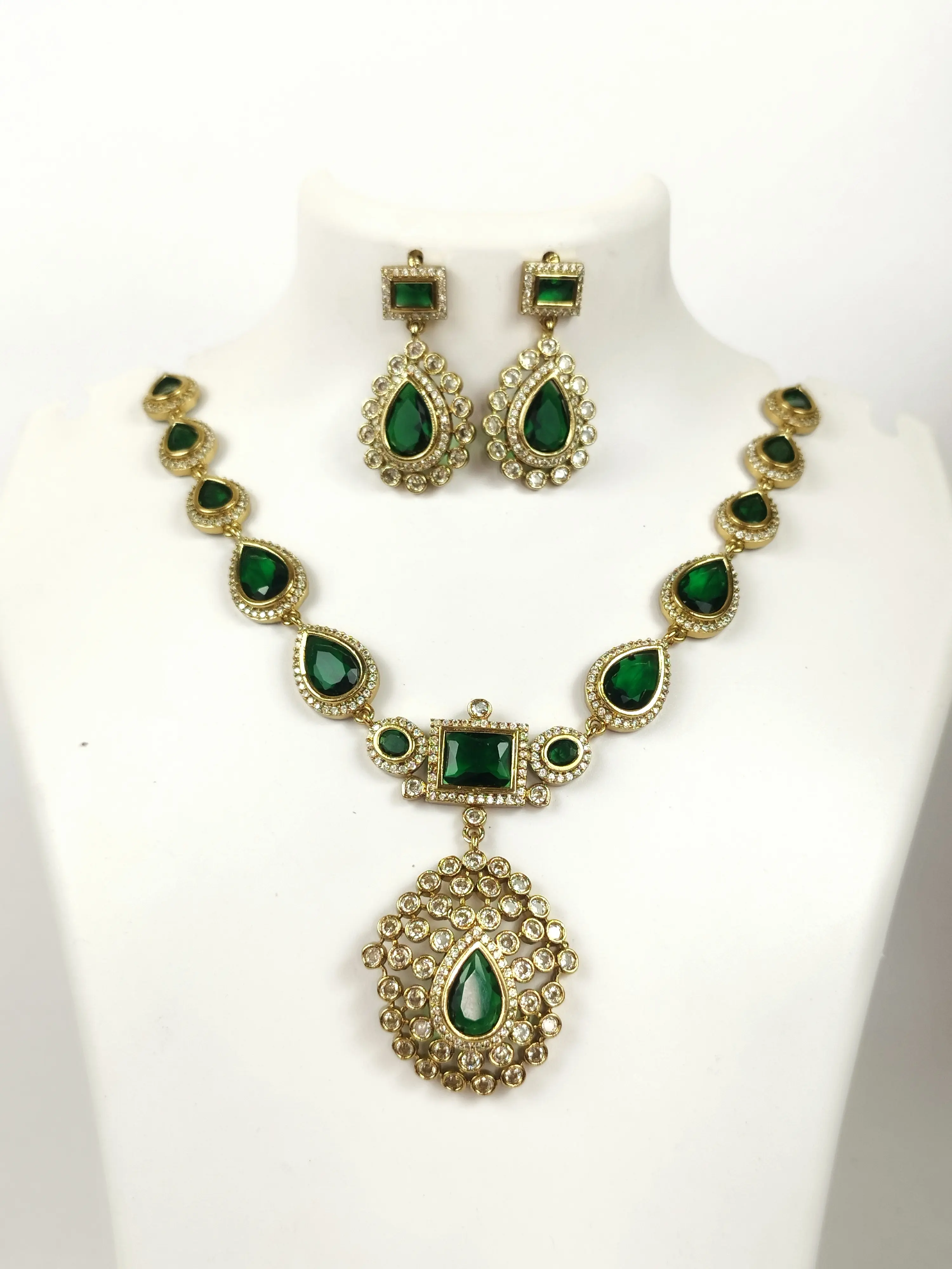 Command attention with this luxurious gold-finish set. It features brilliant green emerald stones in various shapes, beautifully framed by sparkling white accents, culminating in a magnificent cluster pendant. Ideal for bridal and major events.