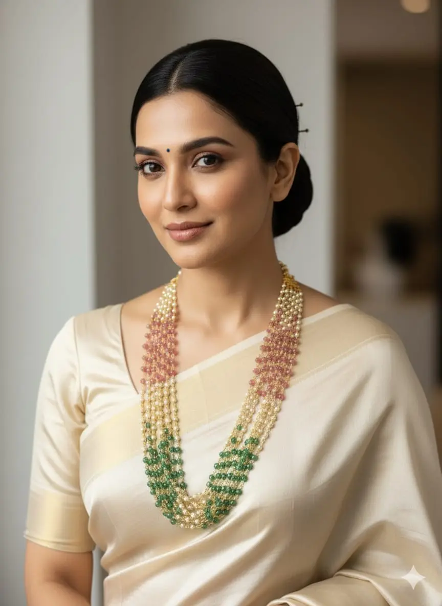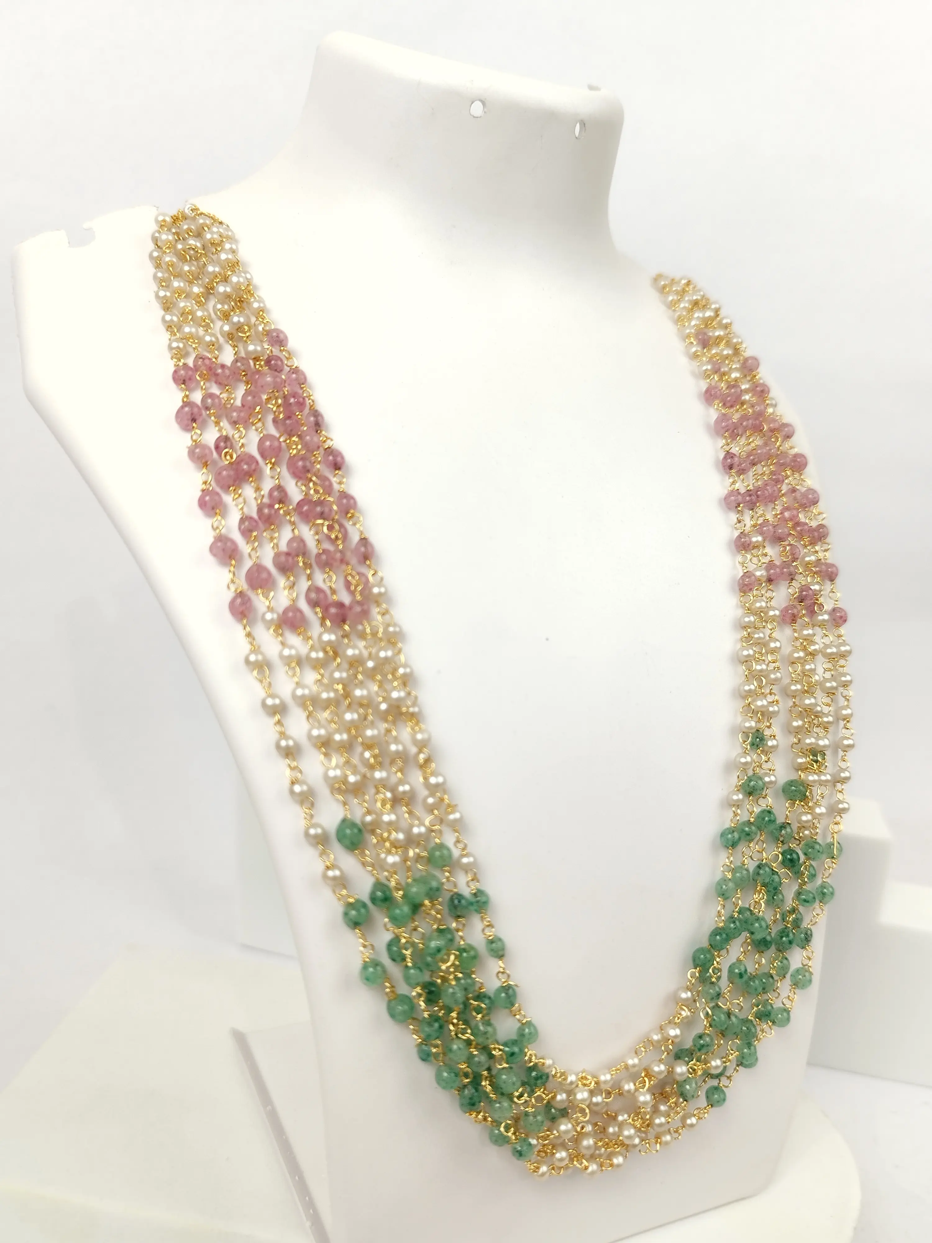 A beautiful multi-strand necklace transitioning smoothly from pastel pink to vibrant emerald green faceted beads, interspersed with lustrous white pearls. This unique ombre effect makes it a fresh and highly versatile piece for fusion wear.