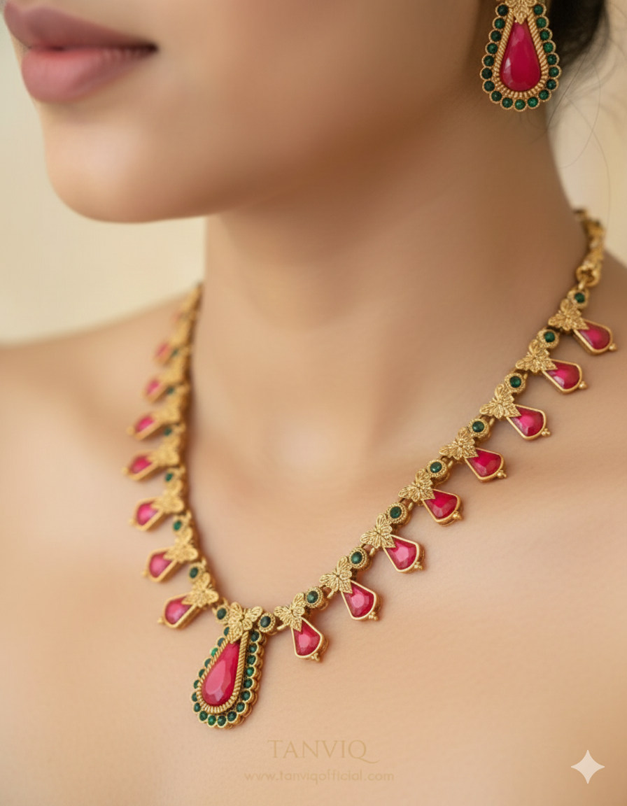 Temple Artistry Meets Timeless Style. Get this stunning design in 2 lengths! . Feast your eyes on the breathtaking craftsmanship of the TANVIQ Heritage Pendant Set. From the detailed Goddess idol to the gorgeous chain links studded with green accents and the matching Jhumkas, this set is a masterpiece.