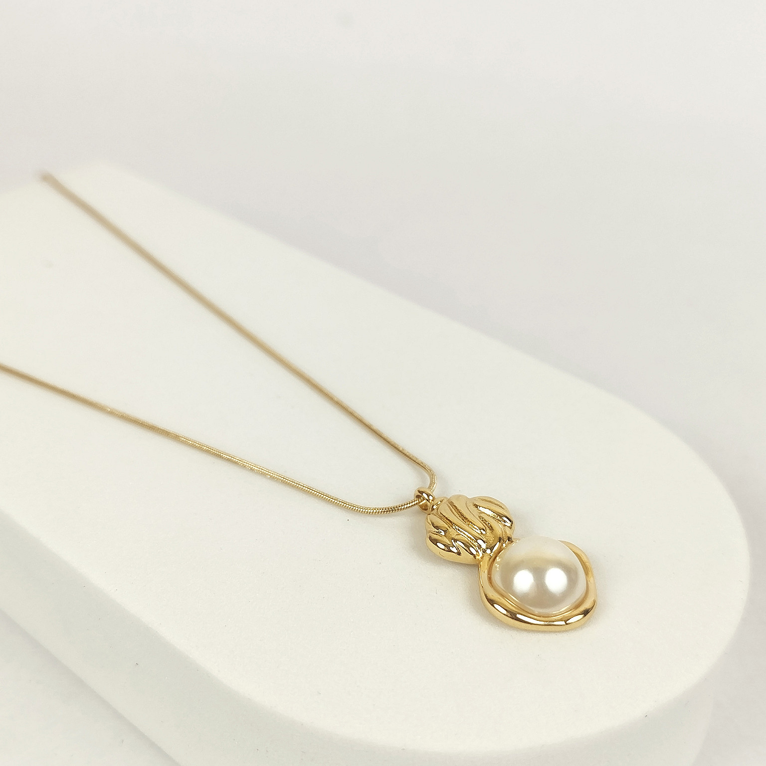 A classic with a modern twist. This chic necklace features a smooth gold chain and a radiant pearl nestled in a sculpted, teardrop-shaped setting. It's a sophisticated piece that works for any occasion.
