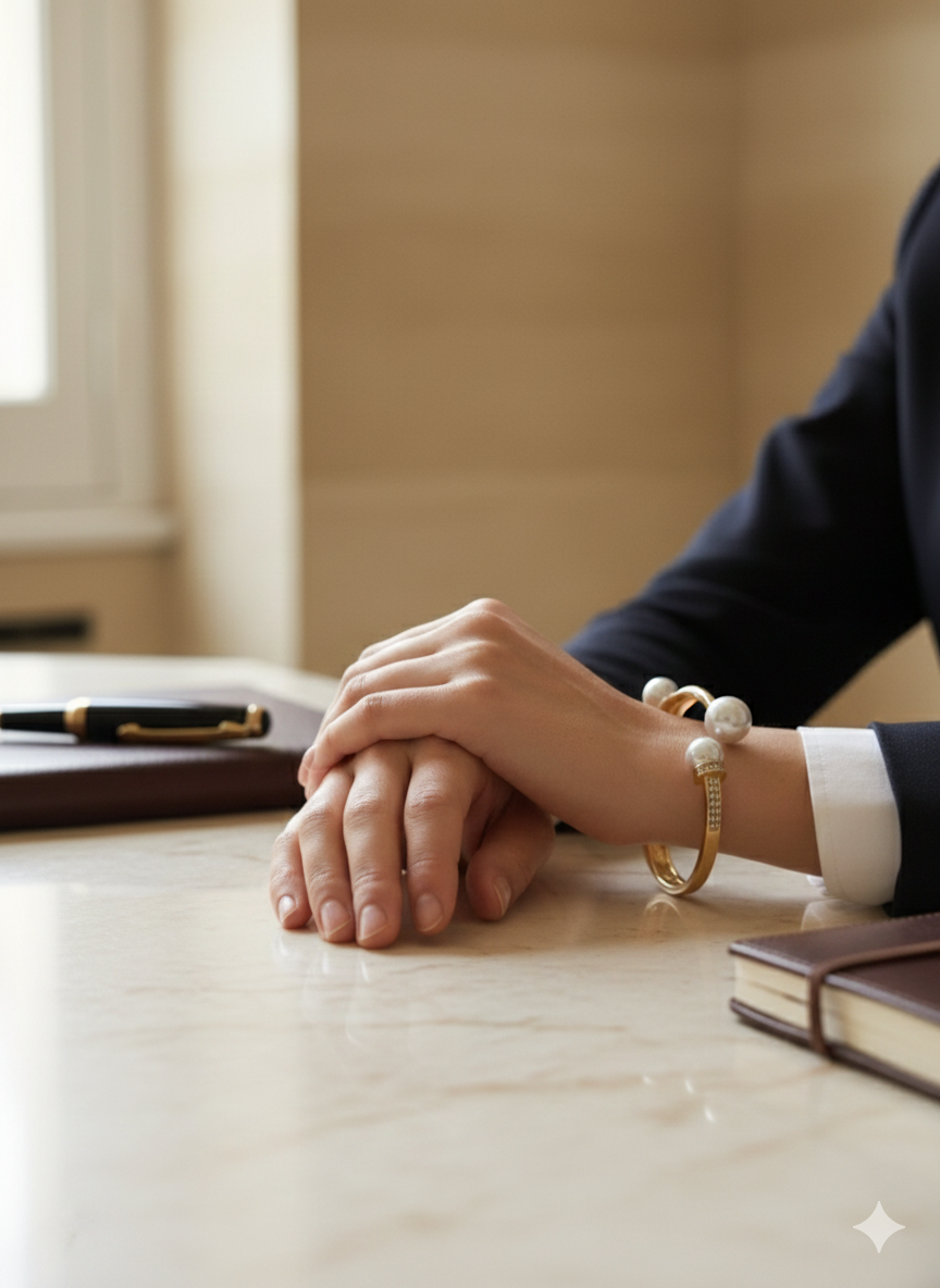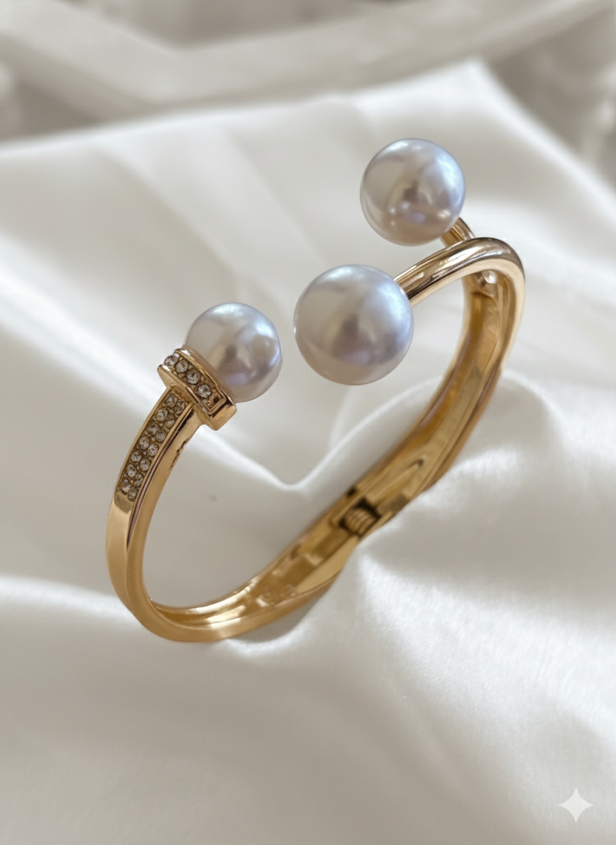 Capture modern luxury with this unique triple-pearl open bangle. Featuring three large, lustrous pearls and a crystal-encrusted terminal, this bypass-style cuff is a true showstopper. The open-end design allows for a slight adjustment to fit most wrist sizes comfortably