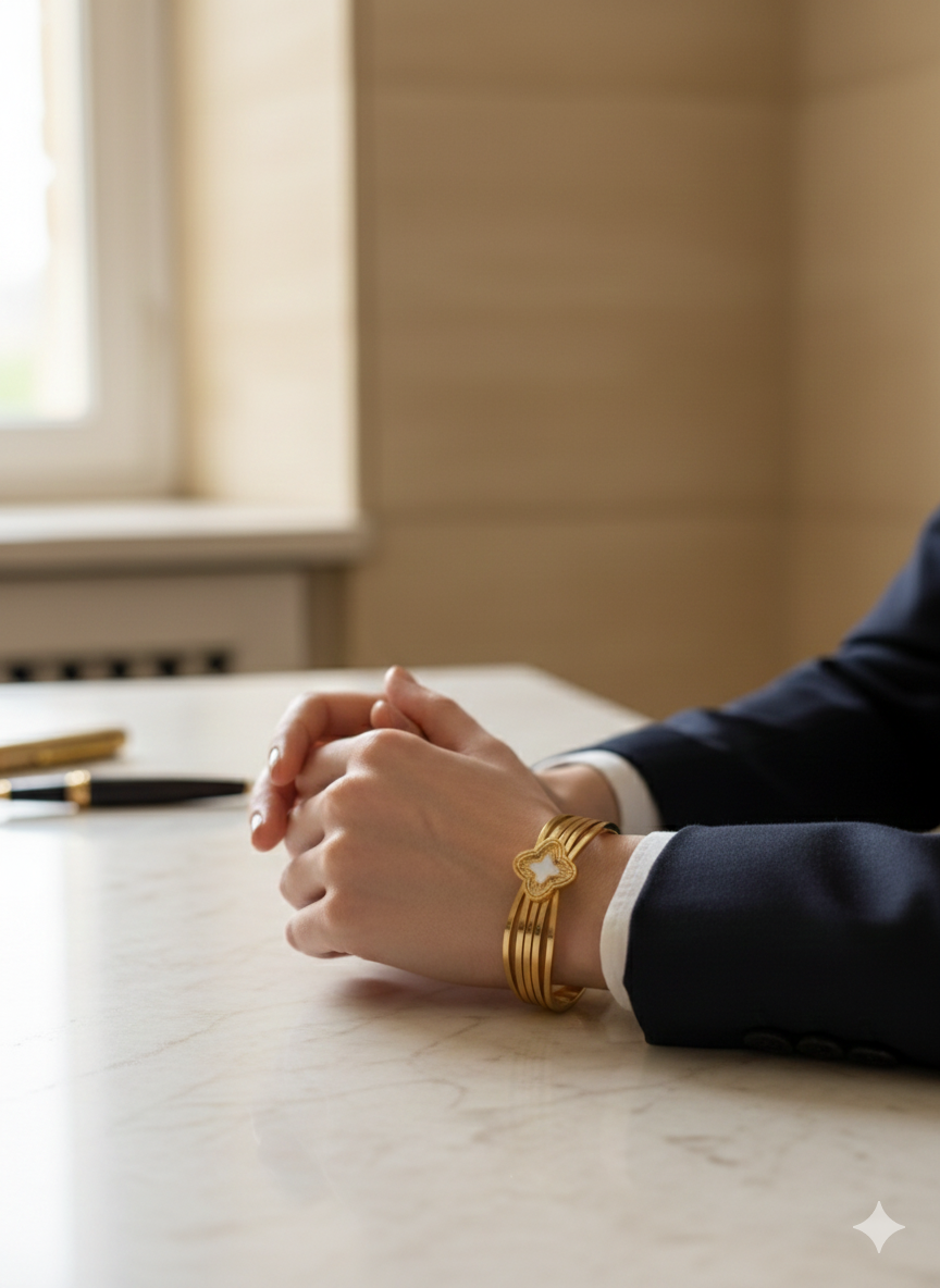 Make a bold statement with our Luxury Multi-Strand Clover Bangle. This designer-inspired piece features five sleek, parallel gold bands held together by a central Mother of Pearl clover charm. Crafted from high-quality stainless steel with a rich 18K gold PVD plating, this bracelet is water-resistant and tarnish-proof, designed for daily elegance. The secure hinged clasp allows for easy wear, while the minimalist yet tiered silhouette adds instant sophistication to any office or evening ensemble