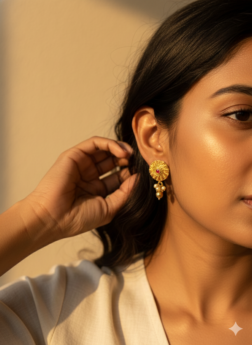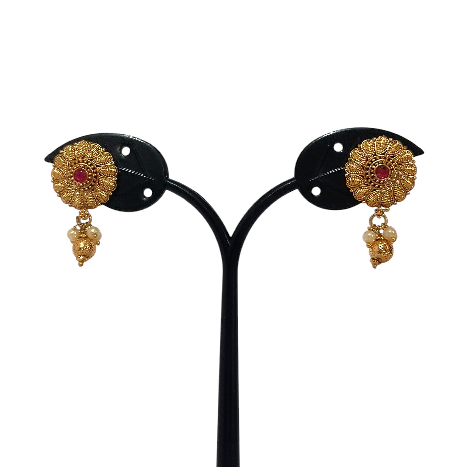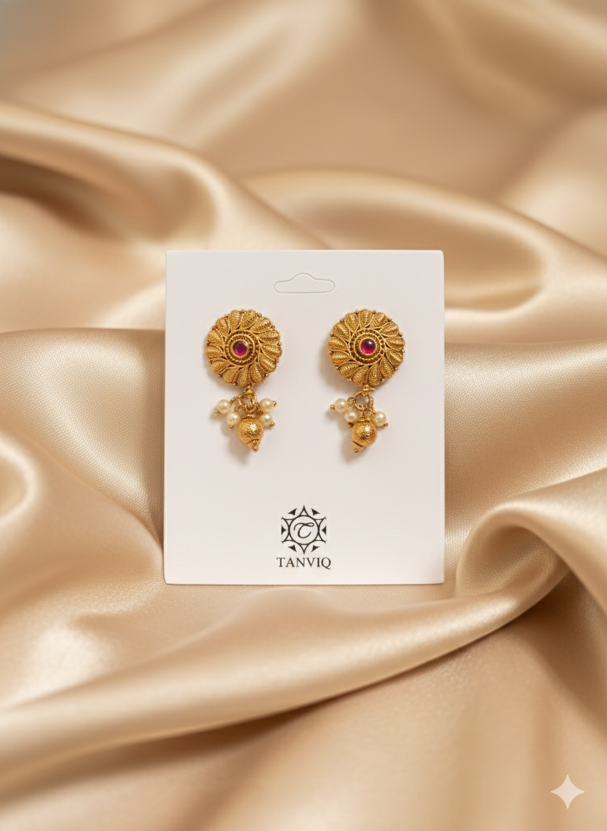 Inspired by traditional temple jewelry, these beautiful golden stud earrings feature an intricate filigree marigold design with a striking ruby red stone at the center and a small pearl drop. A timeless accessory for festive occasions