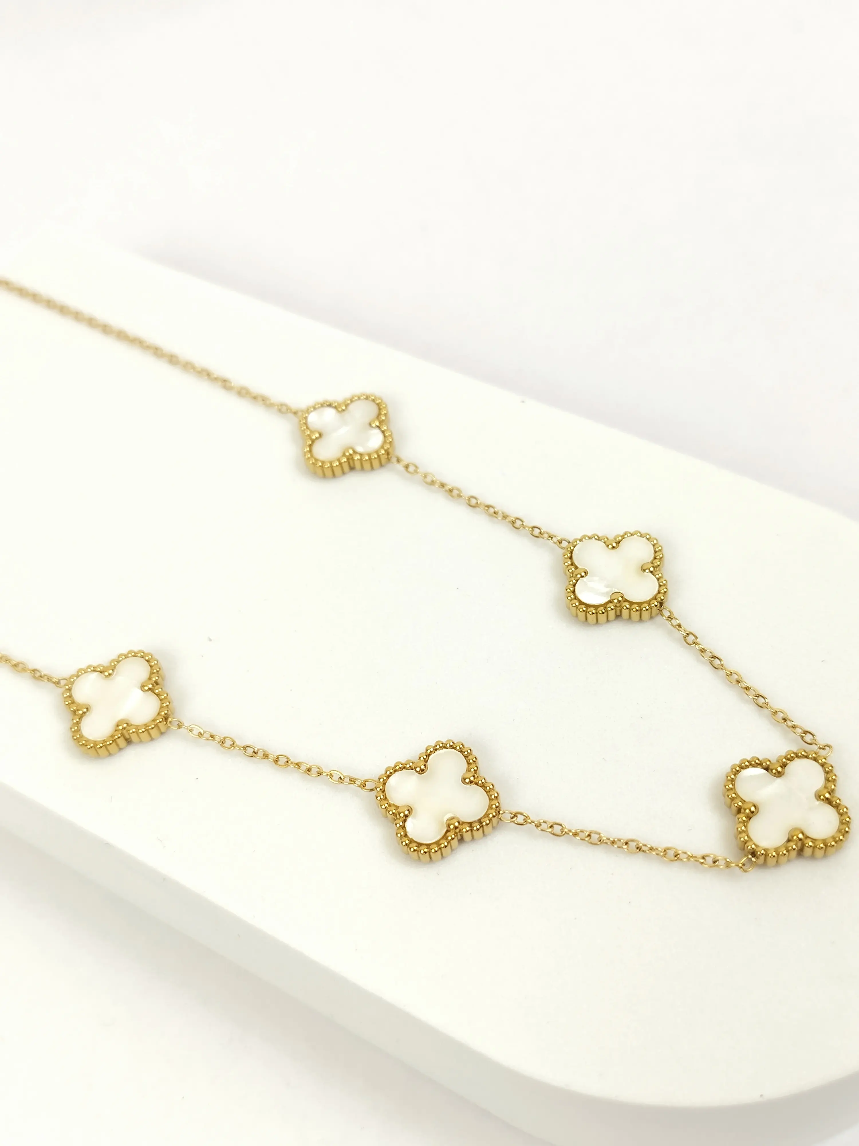 Find your lucky charm with this elegant clover Anti Tarnish Chain. The gold-toned Anti Tarnish Chain features multiple white mother of pearl clover charms, creating a classic and refined piece with a timeless feel.