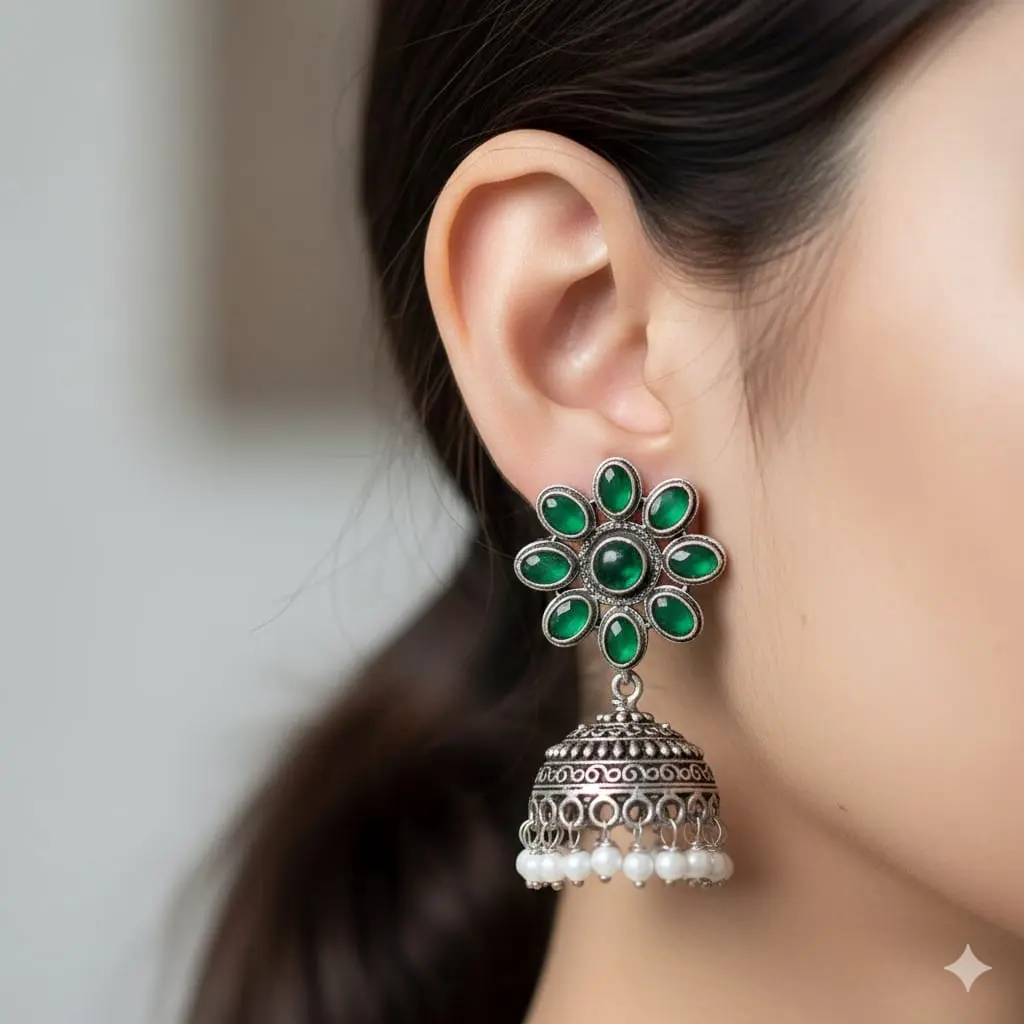 Description: Featuring a striking floral stud design with green stones, these oxidised jhumkas are beautifully detailed with pearl hangings. Perfect for festive occasions, traditional wear, or gifting.