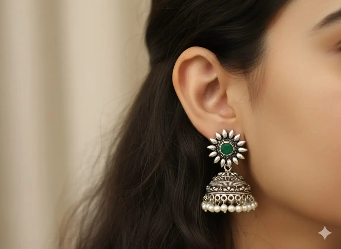 Description: Crafted in a sunflower-inspired design with a green stone center and pearl detailing, these oxidised jhumkas are perfect for adding a pop of elegance to ethnic outfits.