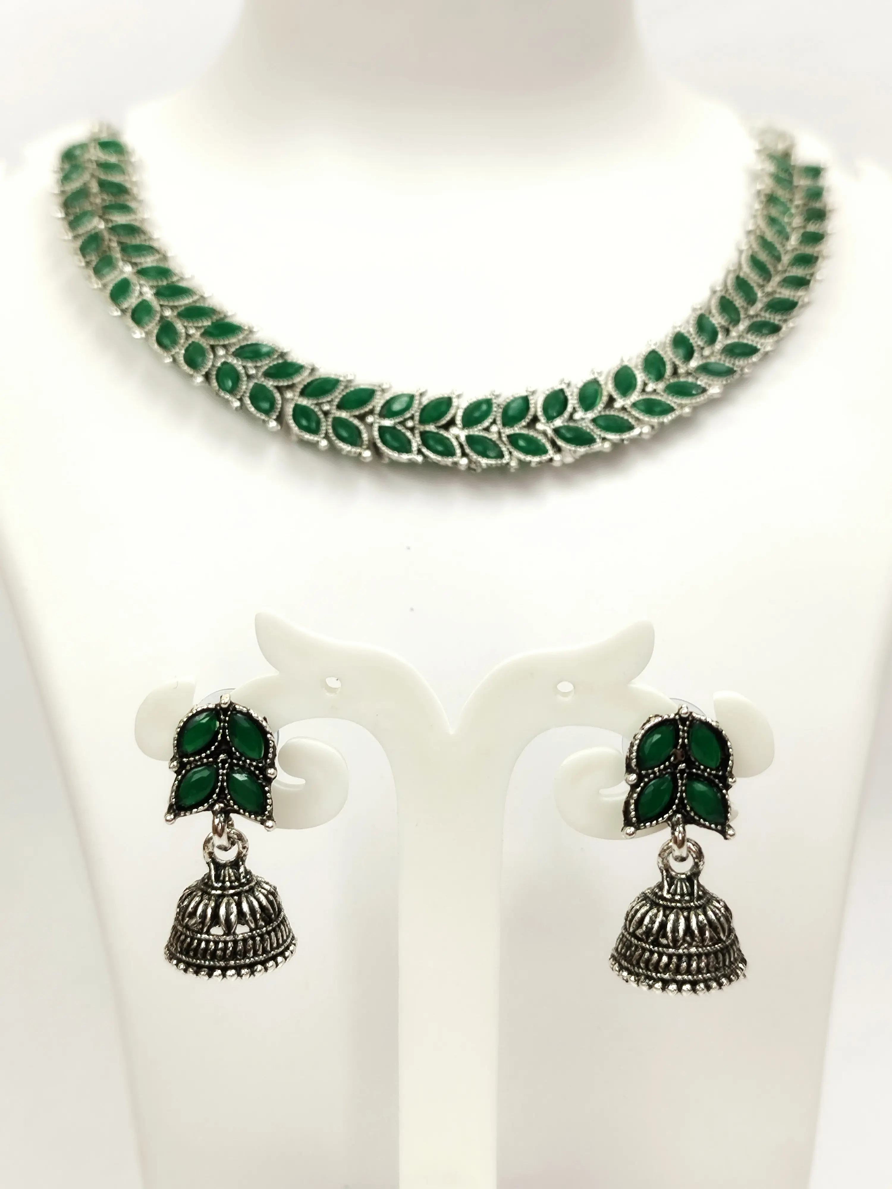 This elegant choker set features a vibrant green leafy pattern with a matching pair of silver-toned jhumka earrings. A perfect choice for adding a pop of natural color to your outfit.