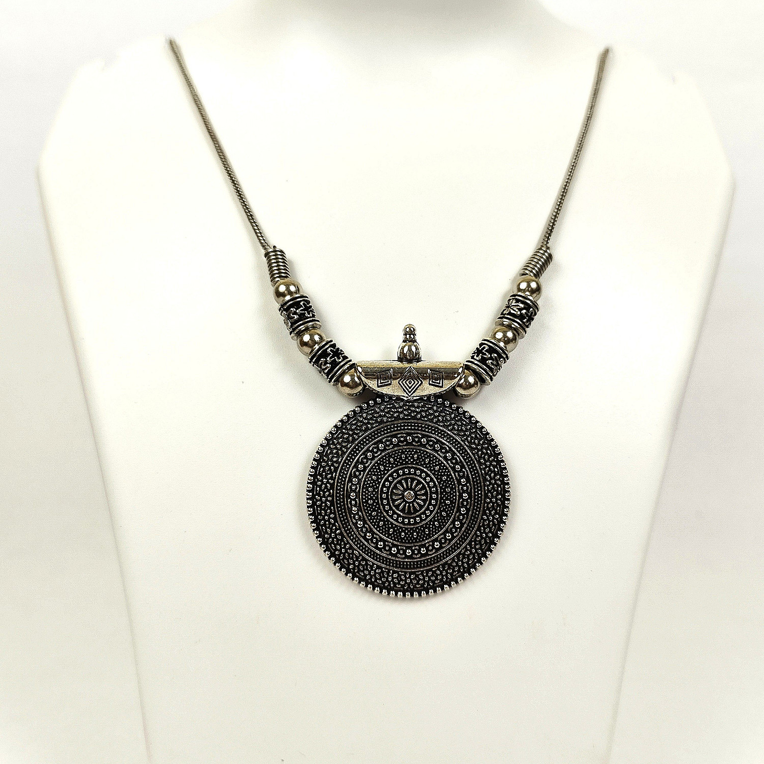 A classic yet trendy oxidized necklace featuring a detailed, circular mandala pendant. Its versatile design makes it suitable for both casual and formal occasions.