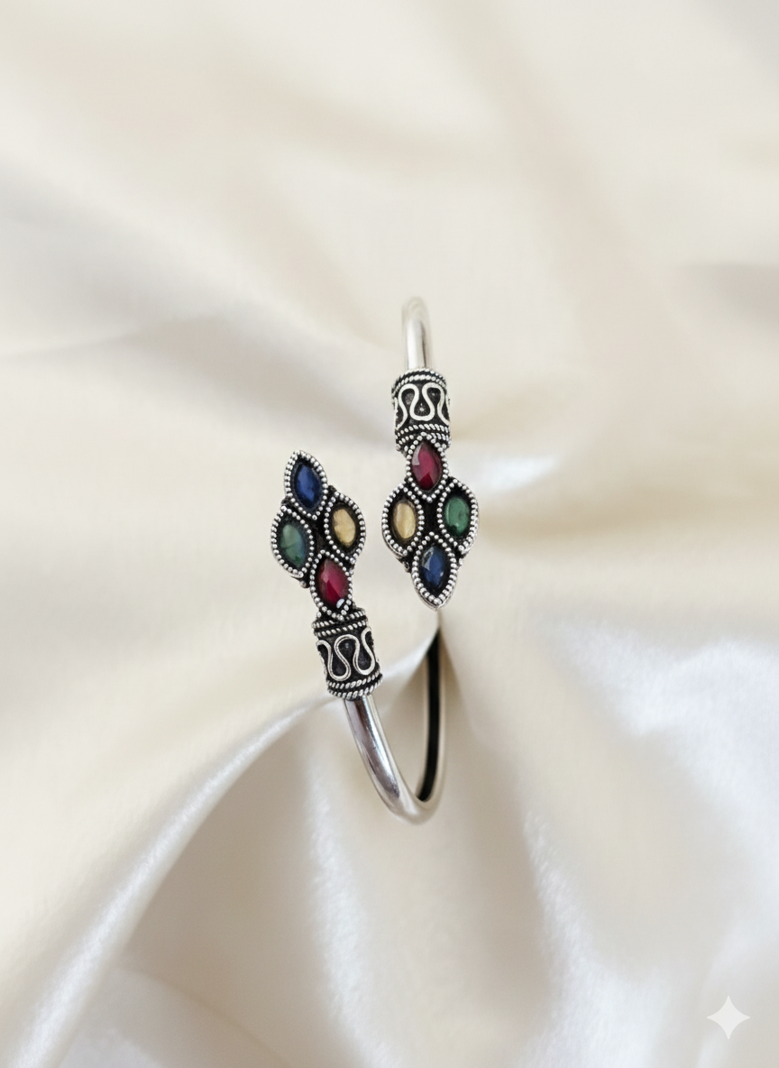 Infuse your style with bohemian charm. This antiqued silver-tone cuff features intricate tribal engravings and a bypass design tipped with marquise-cut multi color stone accents. The oxidized finish provides a vintage, handcrafted look perfect for festival or ethnic attire