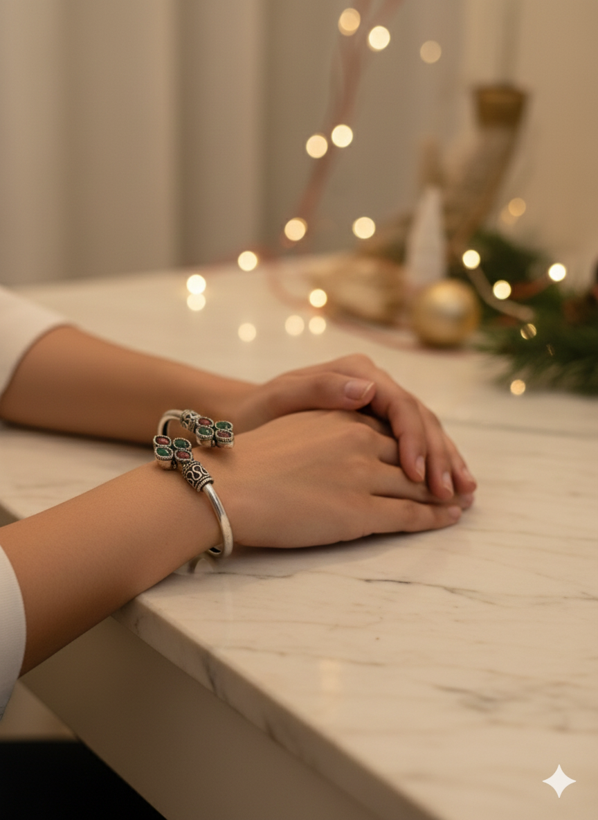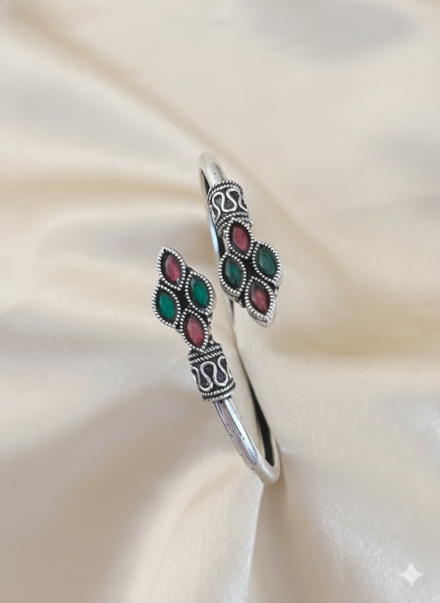Infuse your style with bohemian charm. This antiqued silver-tone cuff features intricate tribal engravings and a bypass design tipped with marquise-cut red and green gemstone accents. The oxidized finish provides a vintage, handcrafted look perfect for festival or ethnic attire