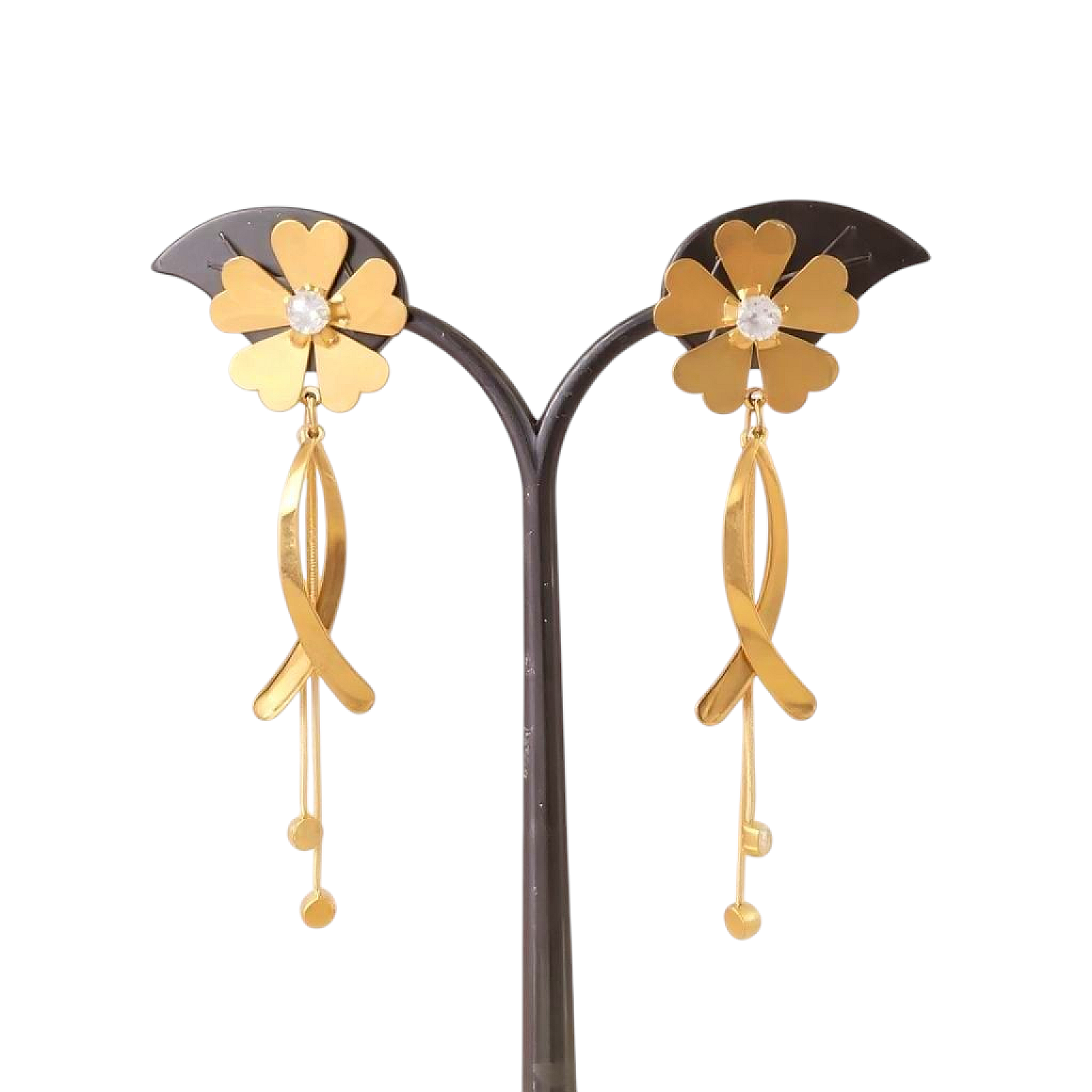 These unique earrings feature a blooming flower stud with a shimmering stone, complemented by a graceful, twisted drop that sways with every movement. Their sophisticated design and anti-tarnish finish make them an ideal accessory for any occasion.