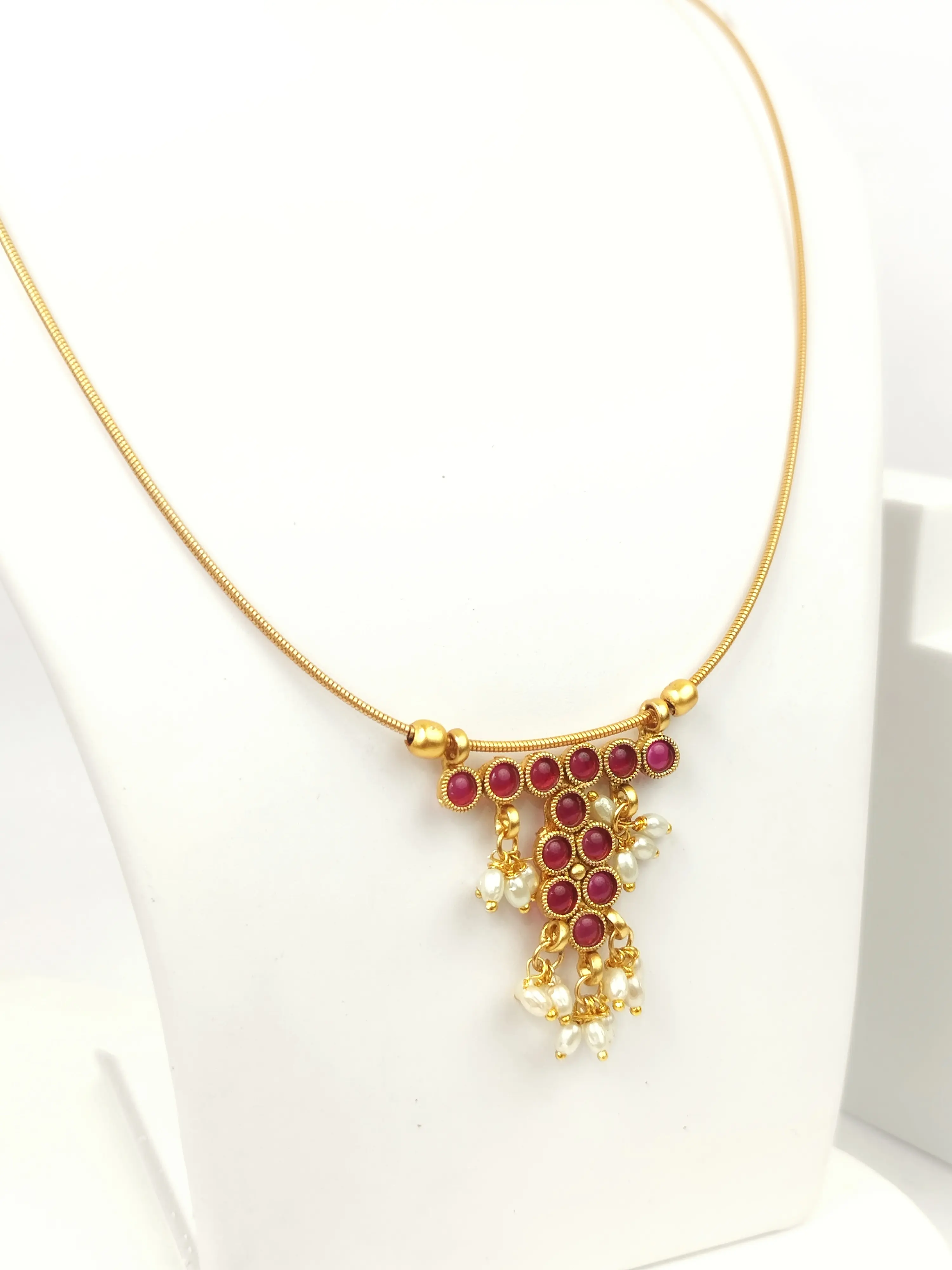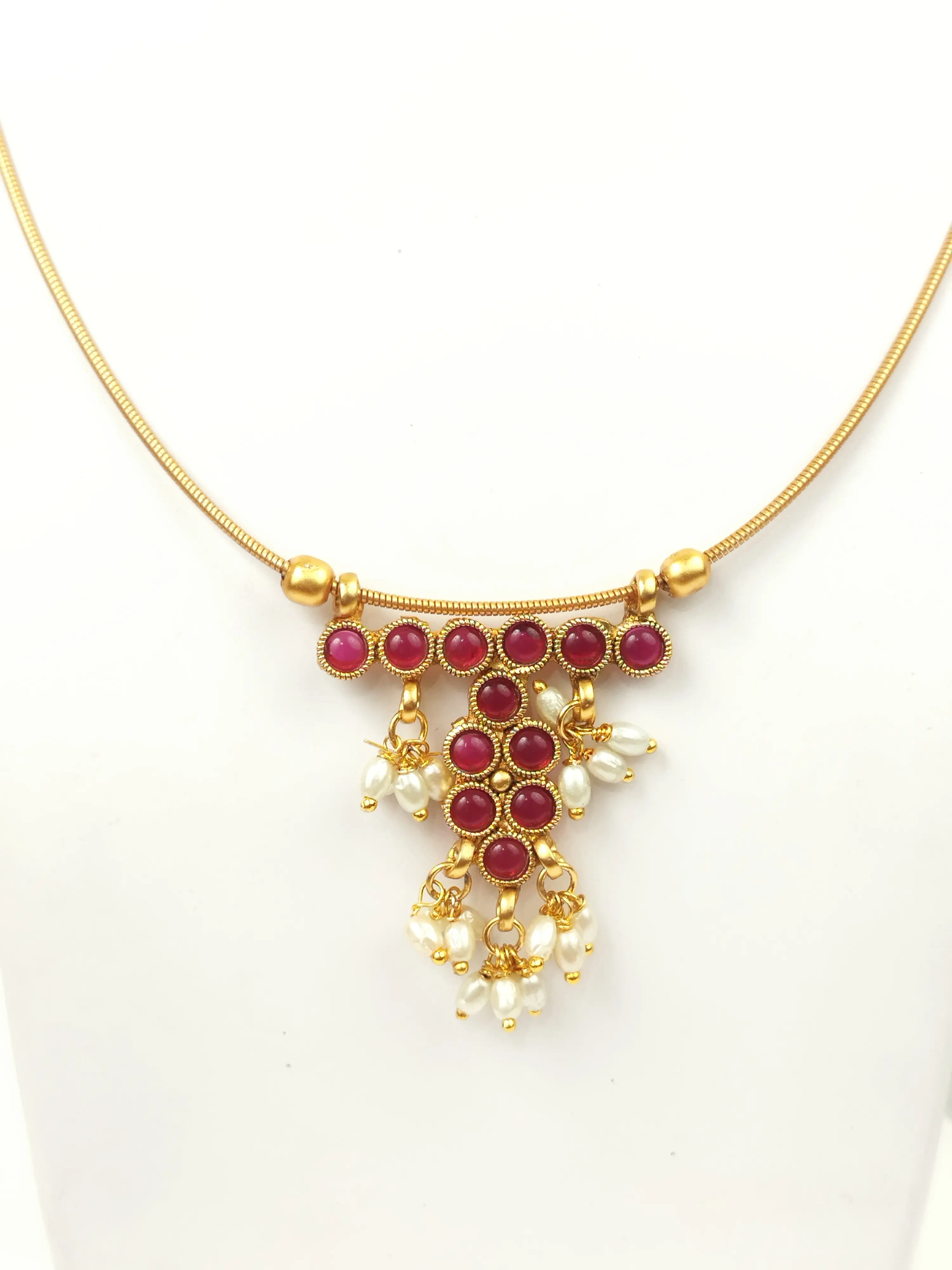 A charming gold-plated cable necklace accented by a simple pendant cluster of deep pink stones and delicate pearl drops. This everyday piece is perfect for adding a subtle pop of traditional color.