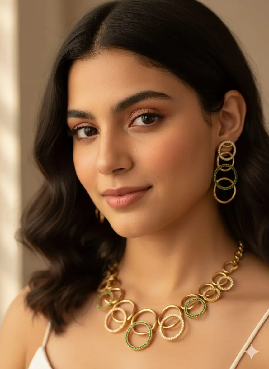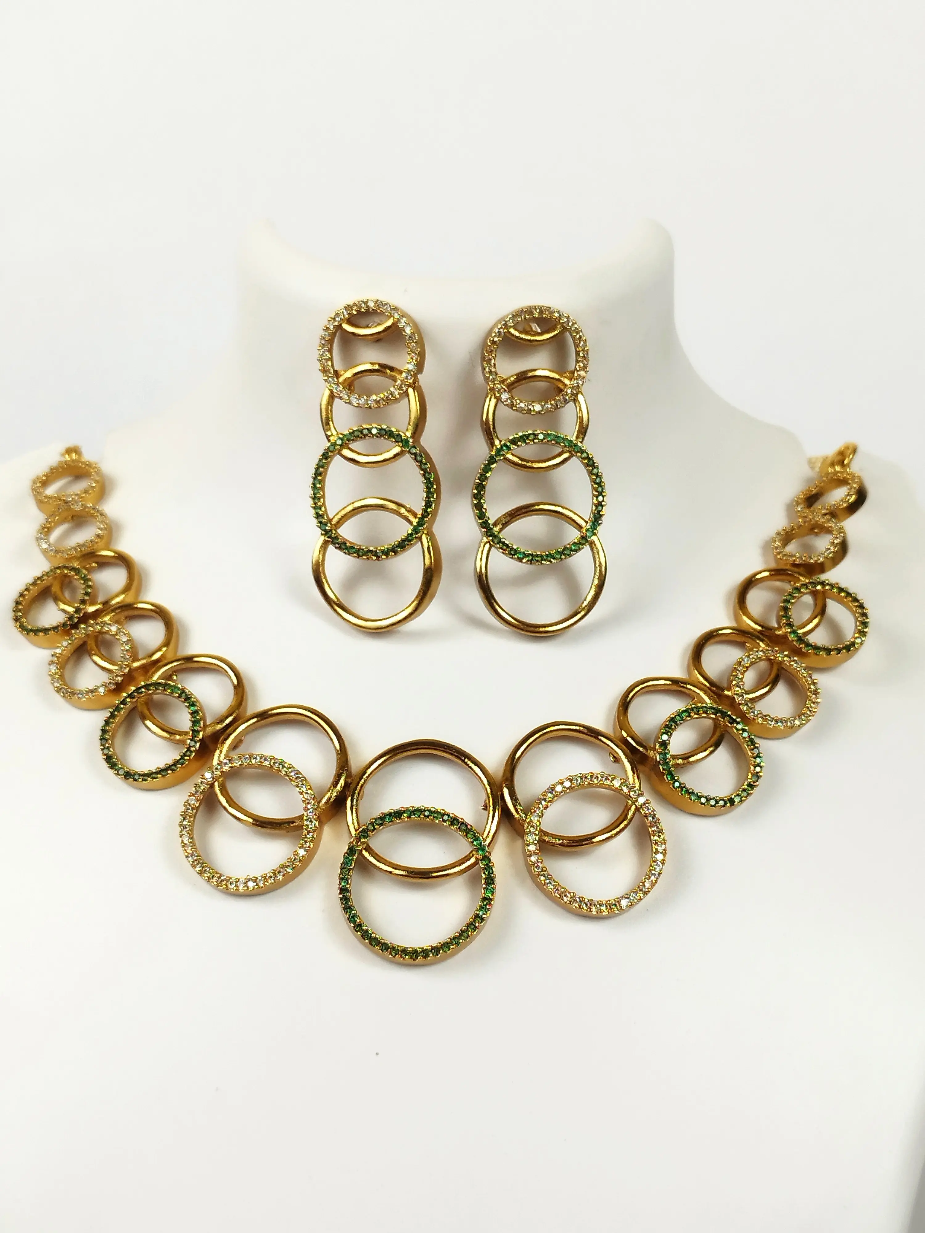 A bold and contemporary AD Stone necklace set featuring interlocking circles in gold tone. The design alternates between plain gold rings and circles studded with sparkling white and emerald light green stones. Perfect for modern evening wear or a chic fusion look.