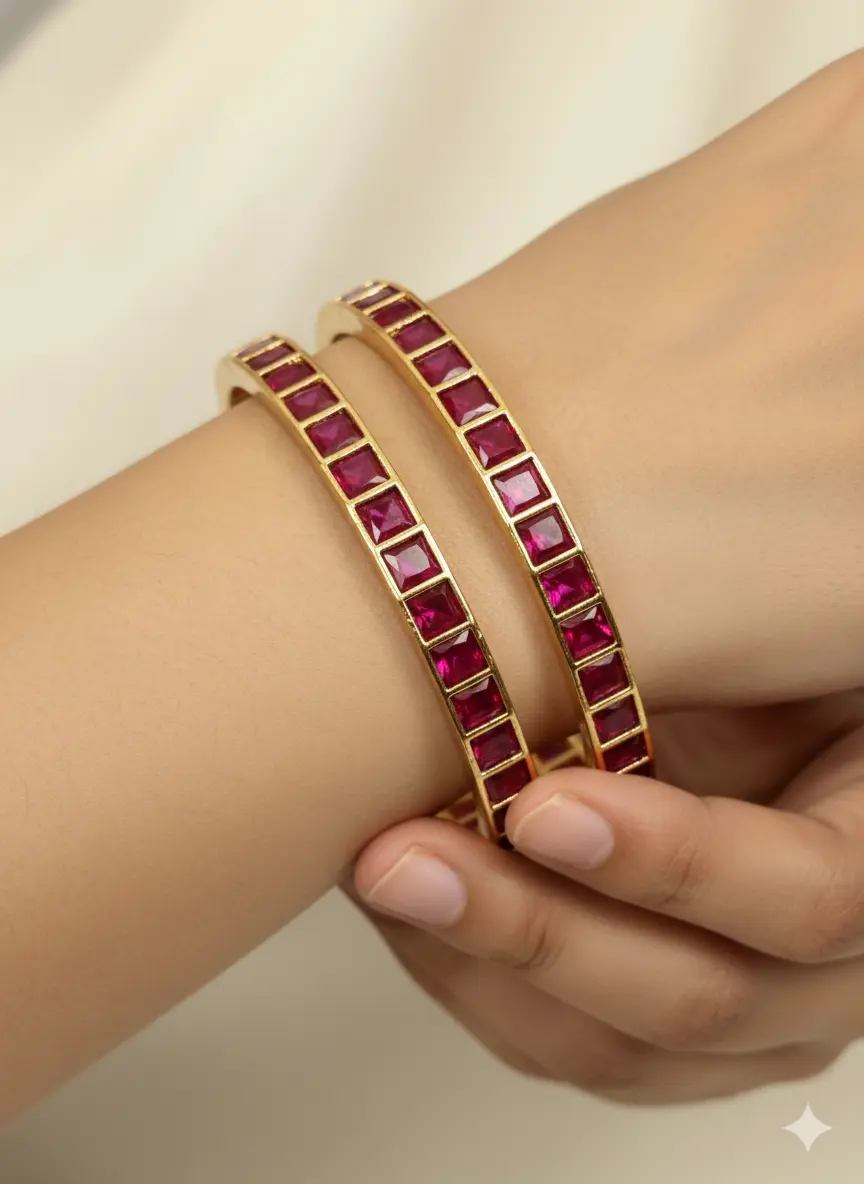 Bold yet graceful, these square-cut premium ruby bangles bring out the queen in you. A perfect blend of tradition and trend.