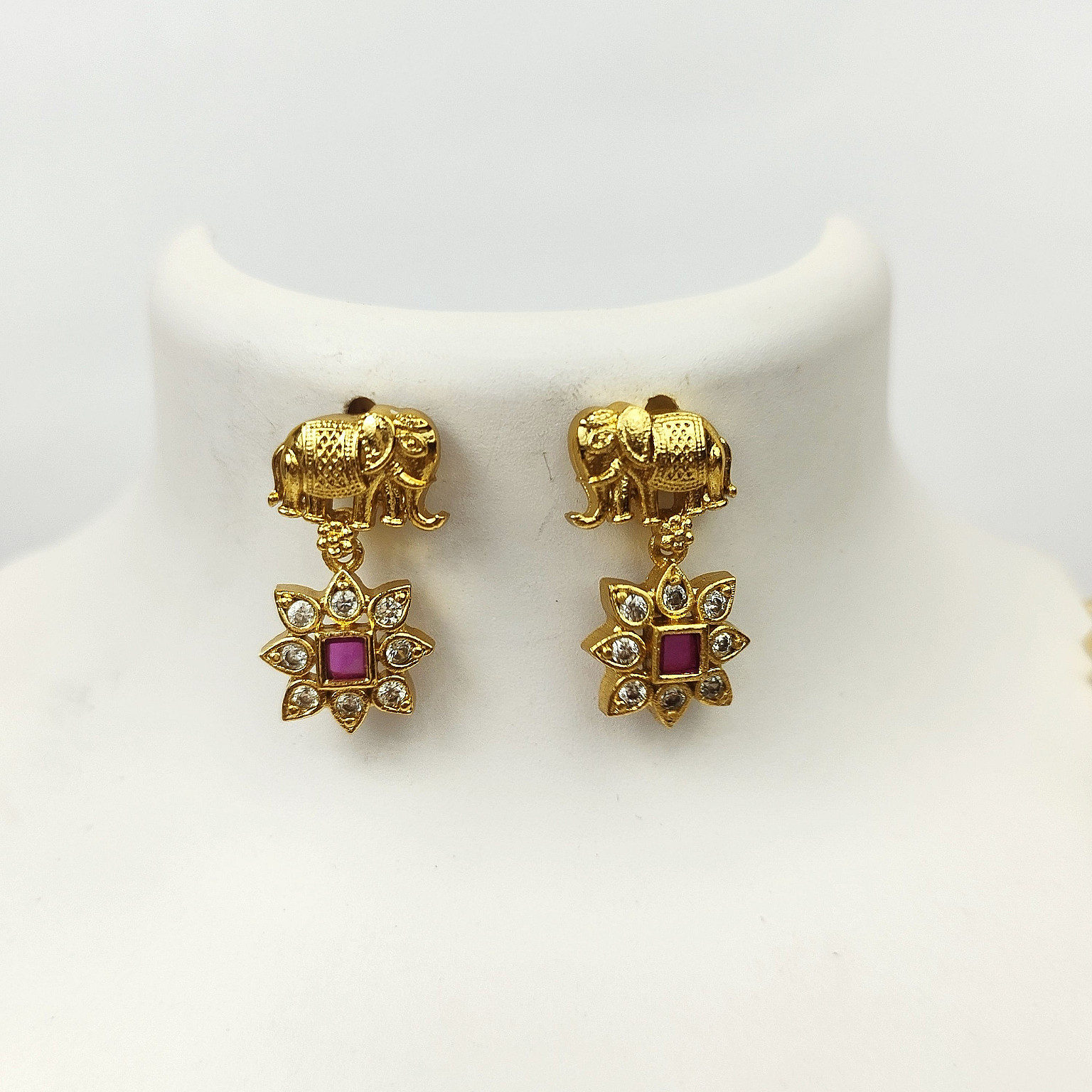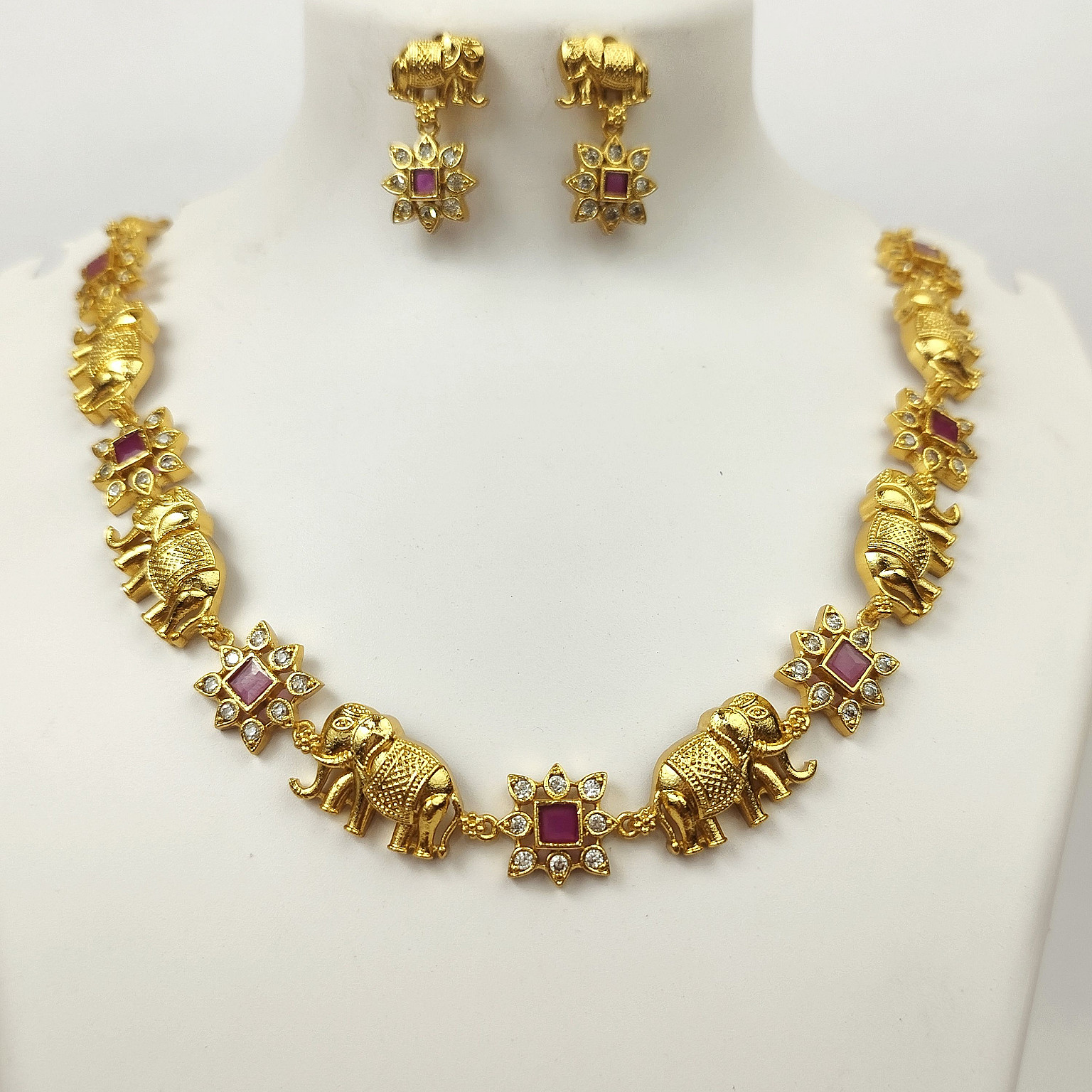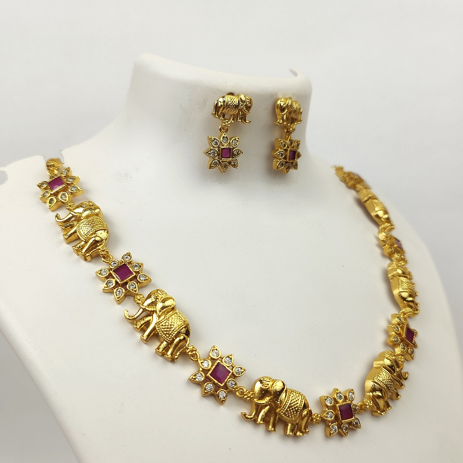 A charming matte gold finish necklace featuring detailed elephant motifs linked with sparkling floral clusters accented with ruby stones. This traditional piece symbolizes good luck and heritage.
