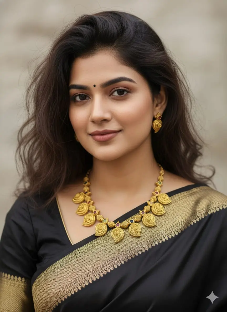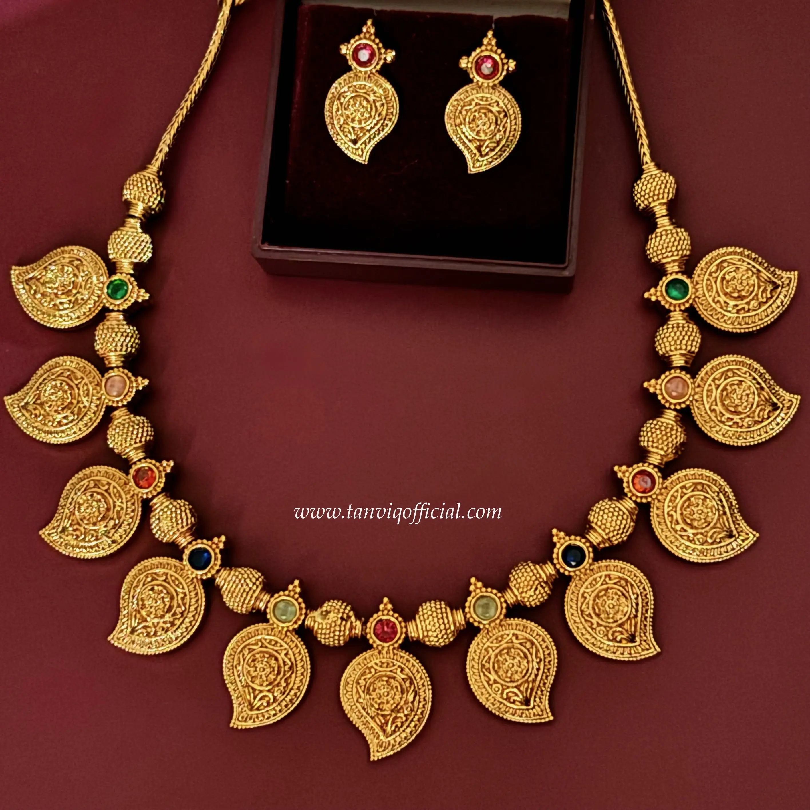 A beautiful matte gold finish choker featuring a seamless pattern of large, intricately carved mango (Aam Palli) motifs. Subtle multi-color stone accents give this set a rich, traditional appeal, perfect for South Indian attire. Disclaimer: Product image colors may vary slightly due to lighting.