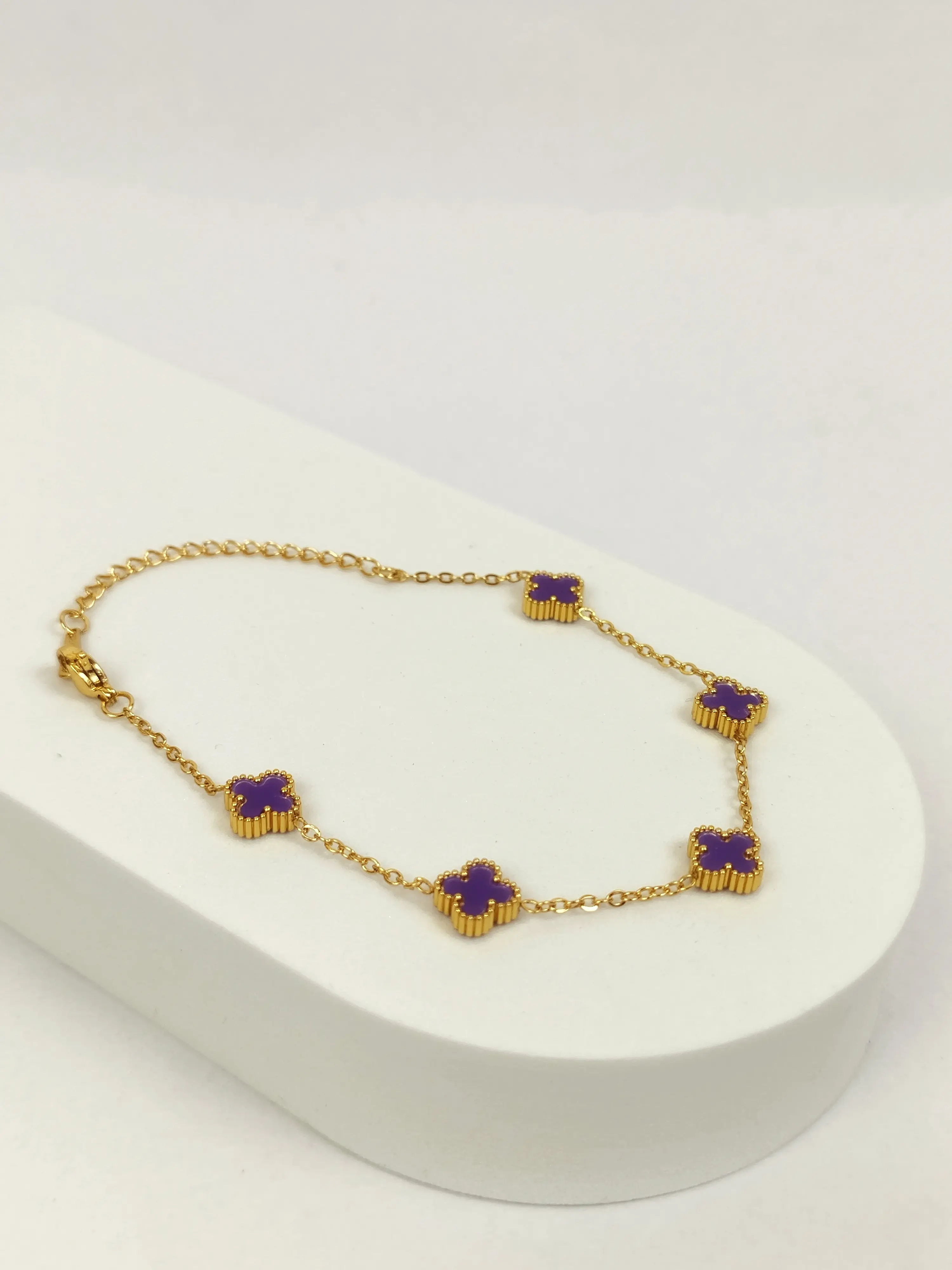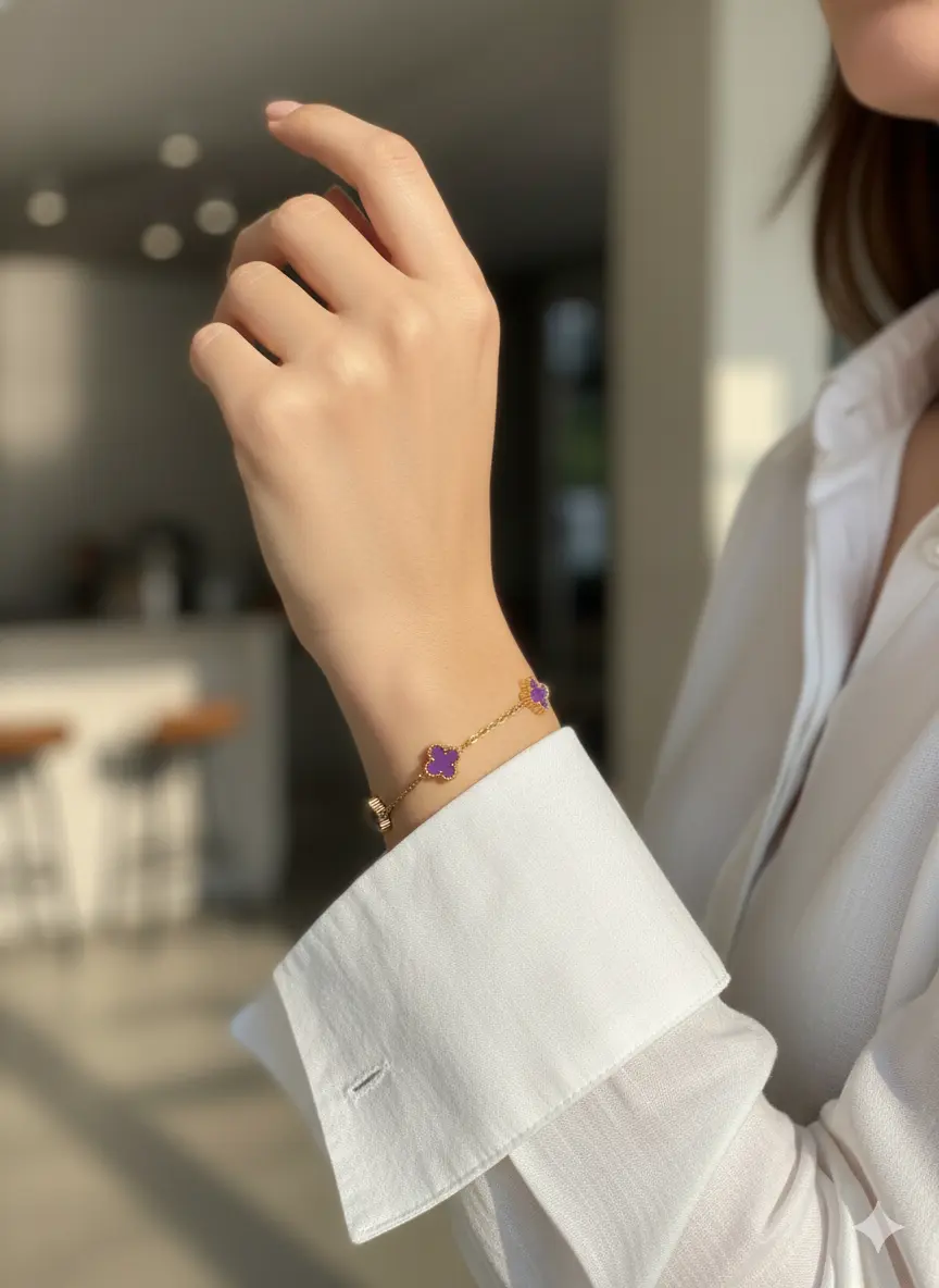 Add a pop of color and sophistication to your look with this Purple Clover Charm Bracelet. Crafted with a sleek gold-plated finish, it features delicate purple clover charms that symbolize luck and positivity. Lightweight and versatile, this bracelet effortlessly transitions from casual daytime wear to elegant evening outfits. A charming accessory for women who love minimal yet statement-making jewelry. Perfect for gifting on birthdays, anniversaries, or as a good-luck token.