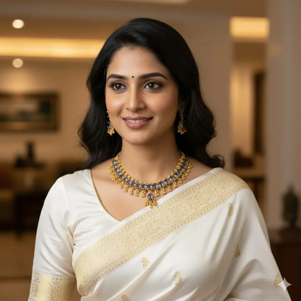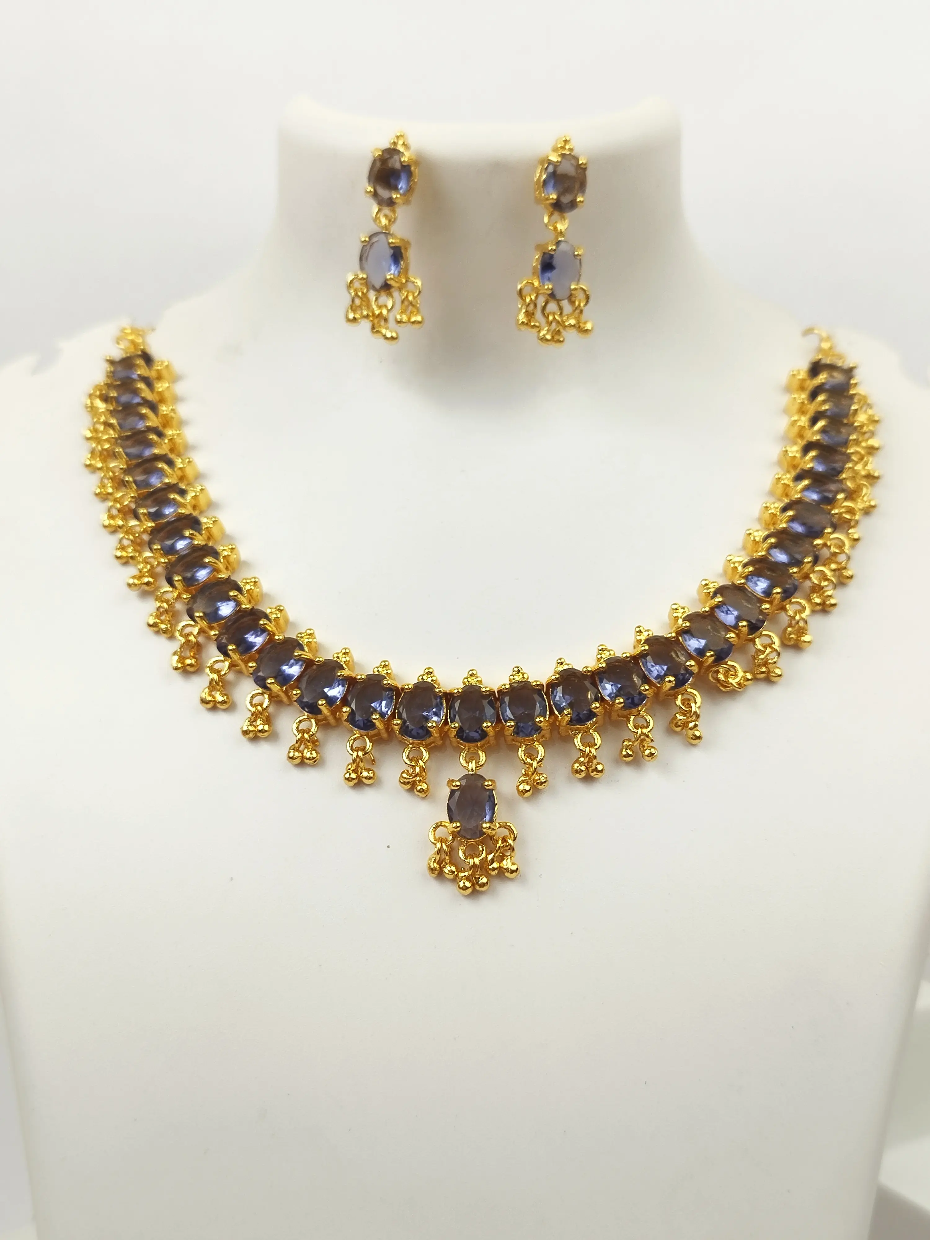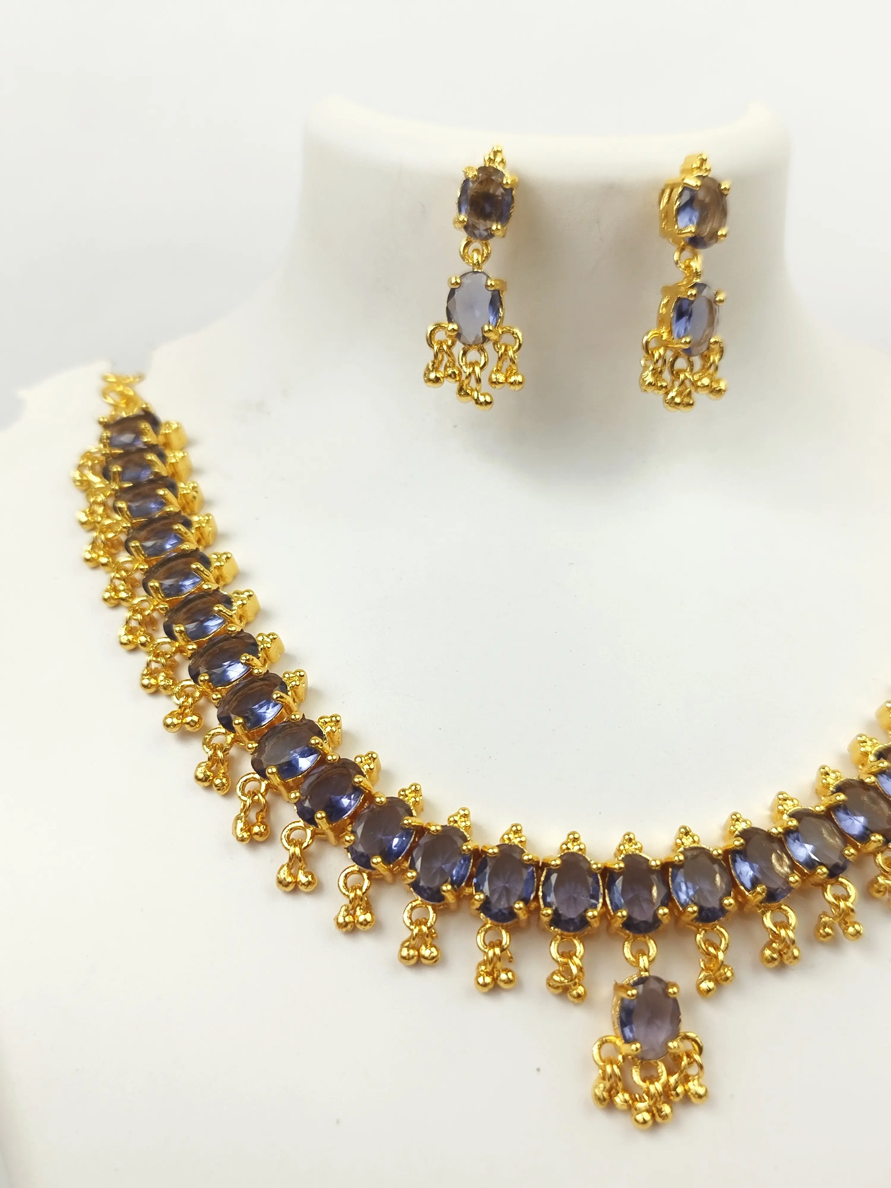 A regal gold-plated choker featuring luminous purple oval stones set in a continuous band. The matching earrings with gold bead drops complete this sophisticated and colorful set. Disclaimer: Product image colors may vary slightly due to lighting.