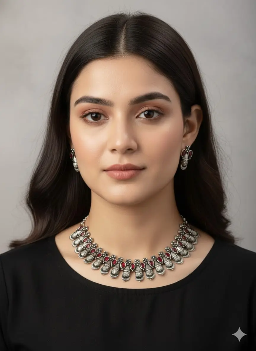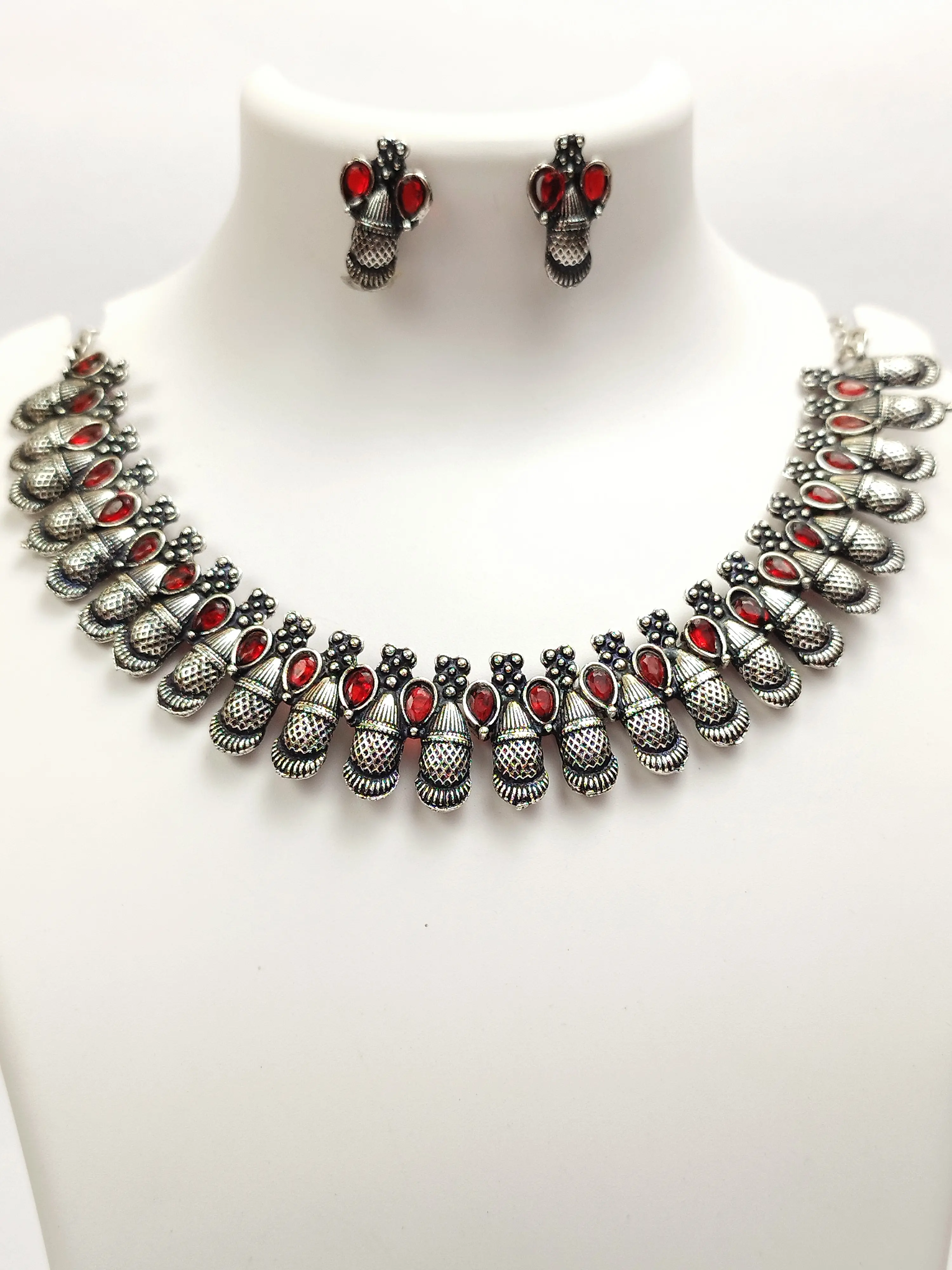 Embrace traditional charm with this oxidized silver necklace adorned with red stones. The set includes matching jhumka earrings for a festive and graceful appearance.