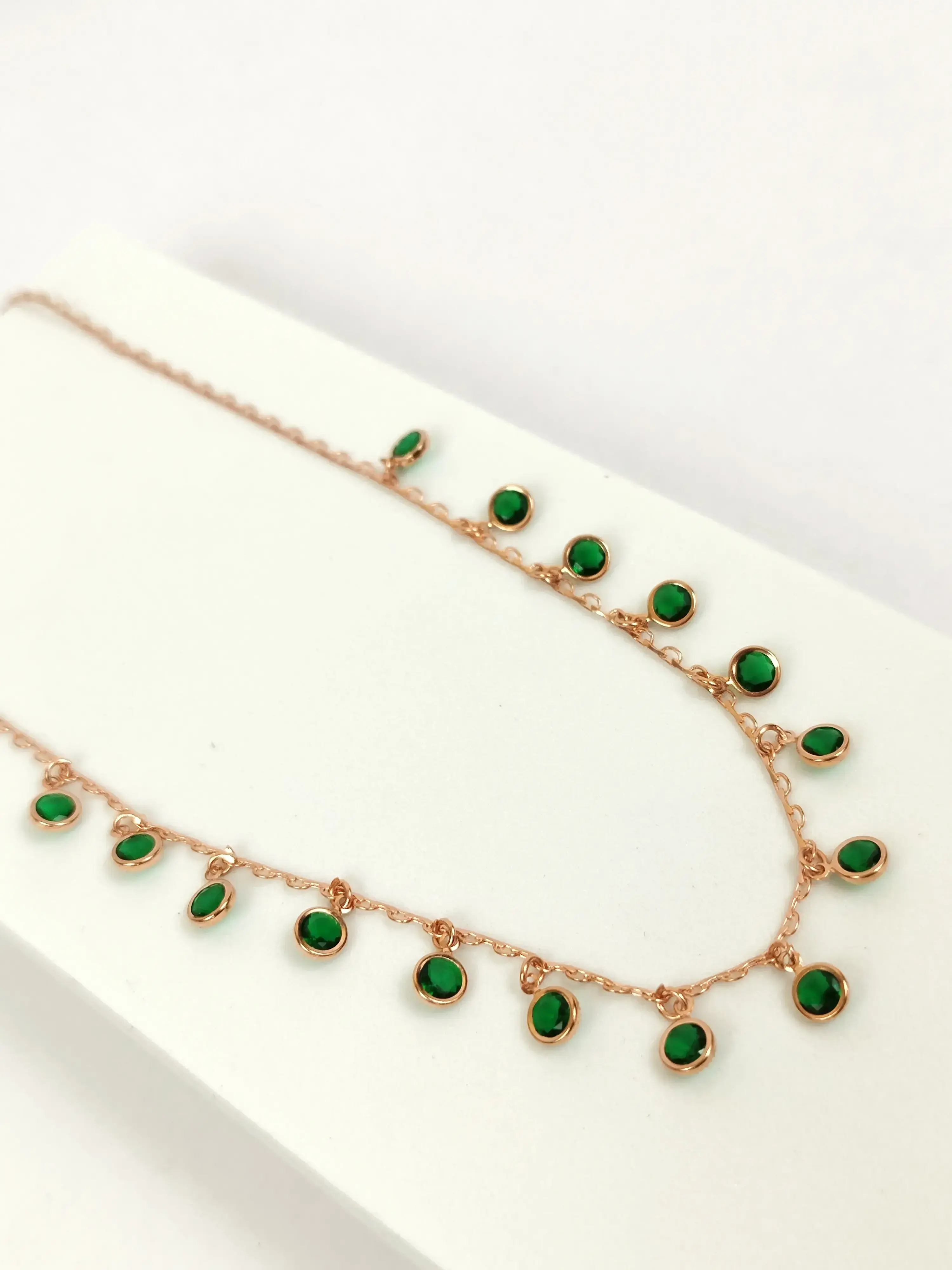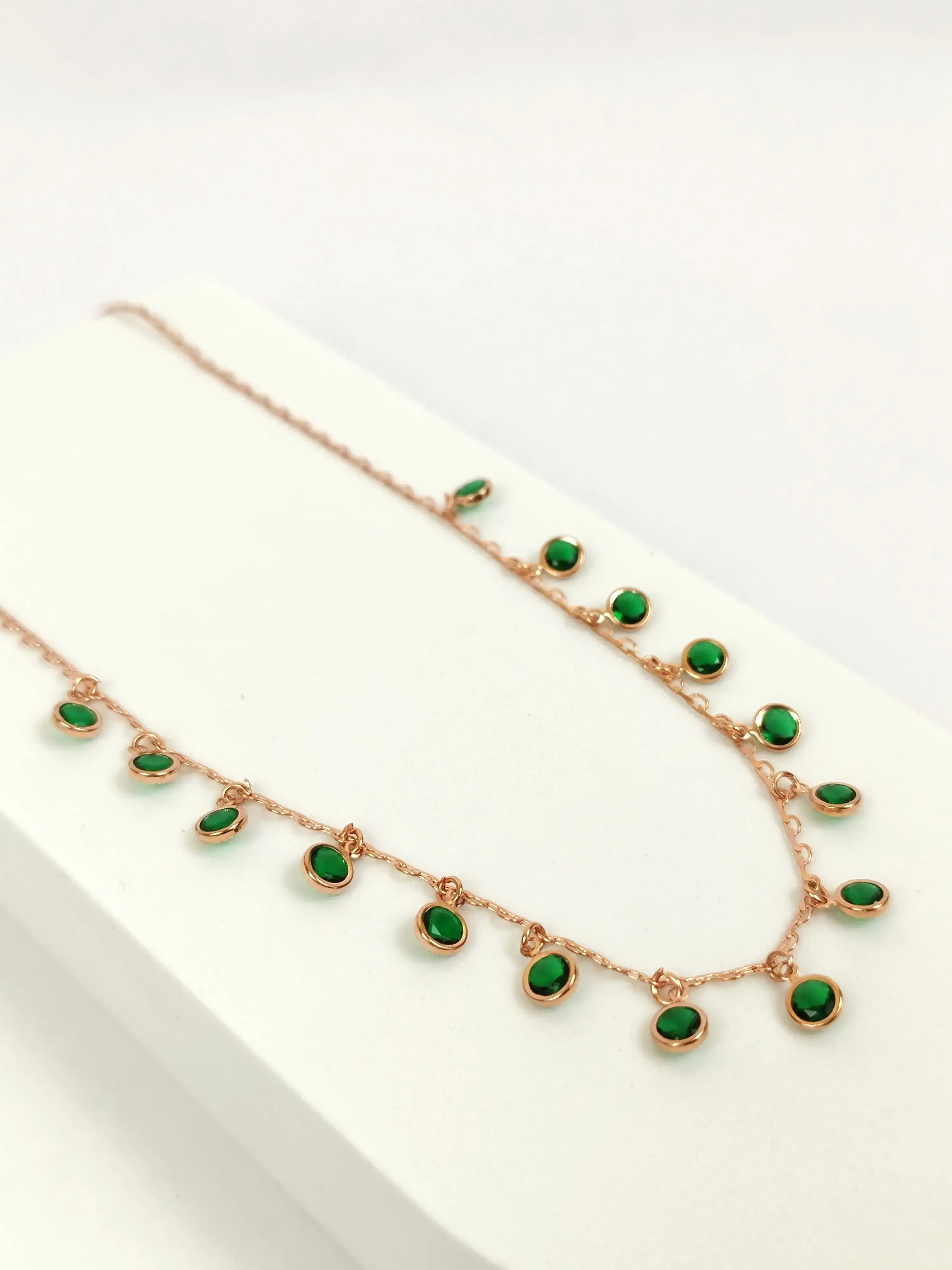 This stunning neckpiece features a delicate, lustrous rose gold anti-tarnish chain. The elegant design is highlighted by a cascade of multiple bezel-set emerald-green droplets, creating a graceful, flowing effect. The vivid green gems are perfectly complemented by the warm rose gold tone, adding a vibrant touch of color and sophistication to any look. Lightweight and durable, this chain is designed to maintain its brilliance without tarnishing, making it a perfect everyday luxury.