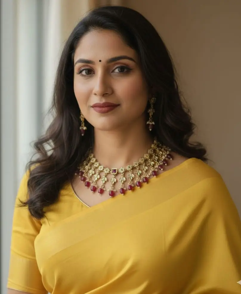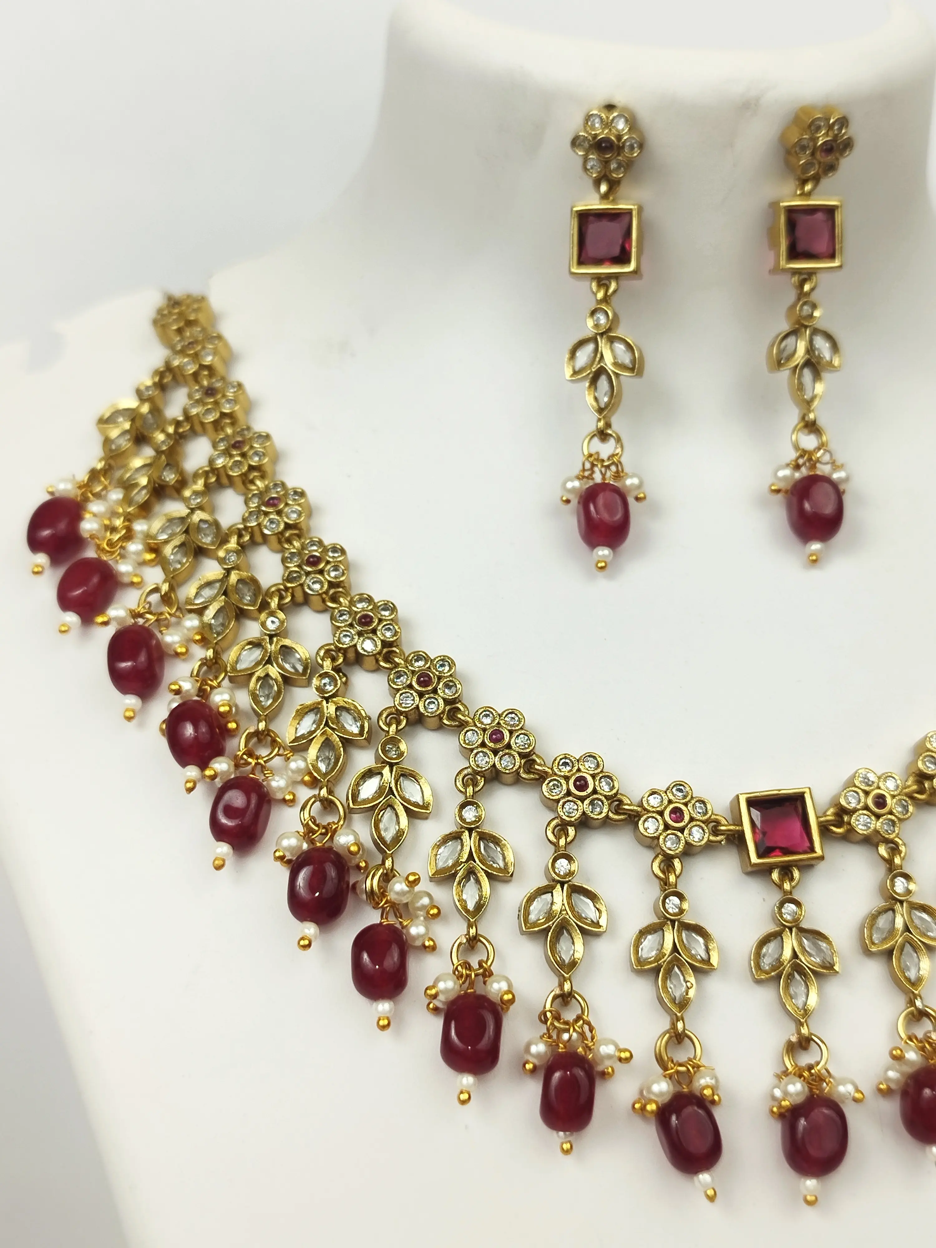 An exquisite gold-plated choker featuring intricate floral links with sparkling AD stones. The design is elegantly finished with dangling deep ruby beads and tiny pearls. The matching earrings with ruby drops are perfect for a rich, festive look.