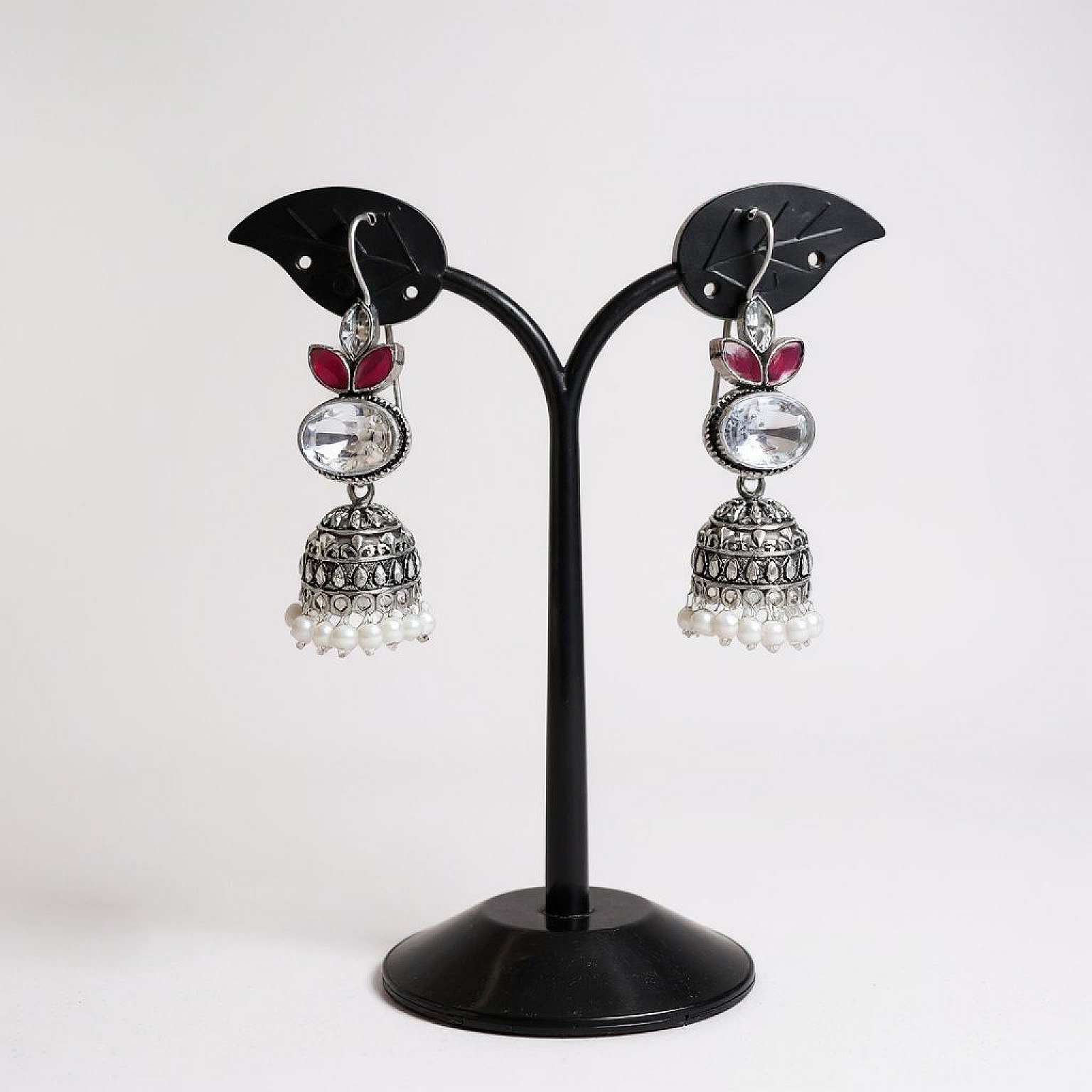 A fusion of modern and traditional design, these striking oxidized silver jhumkas feature a bold, clear stone and a deep red accent. The pearl drops add a classic touch, making them an ideal choice for a sophisticated ethnic look.