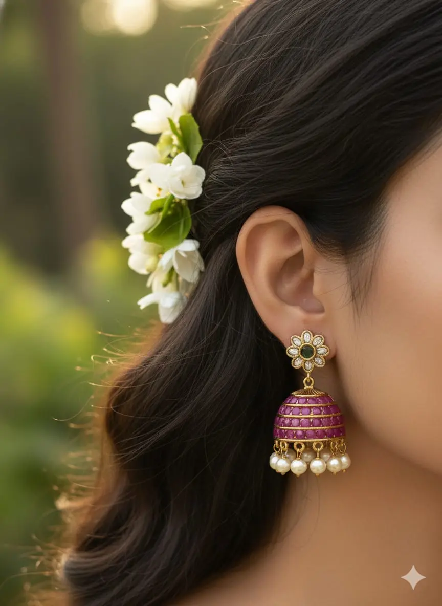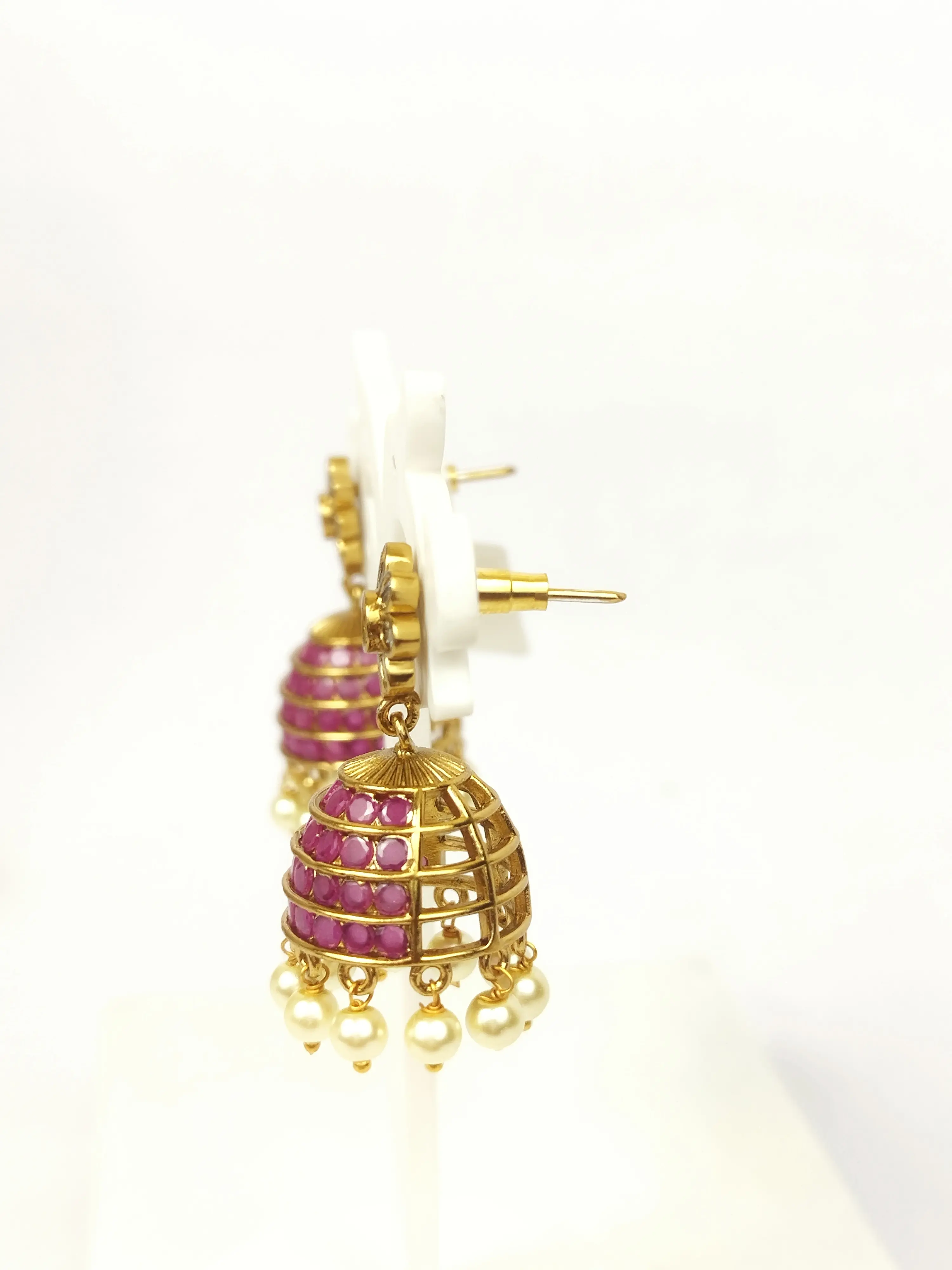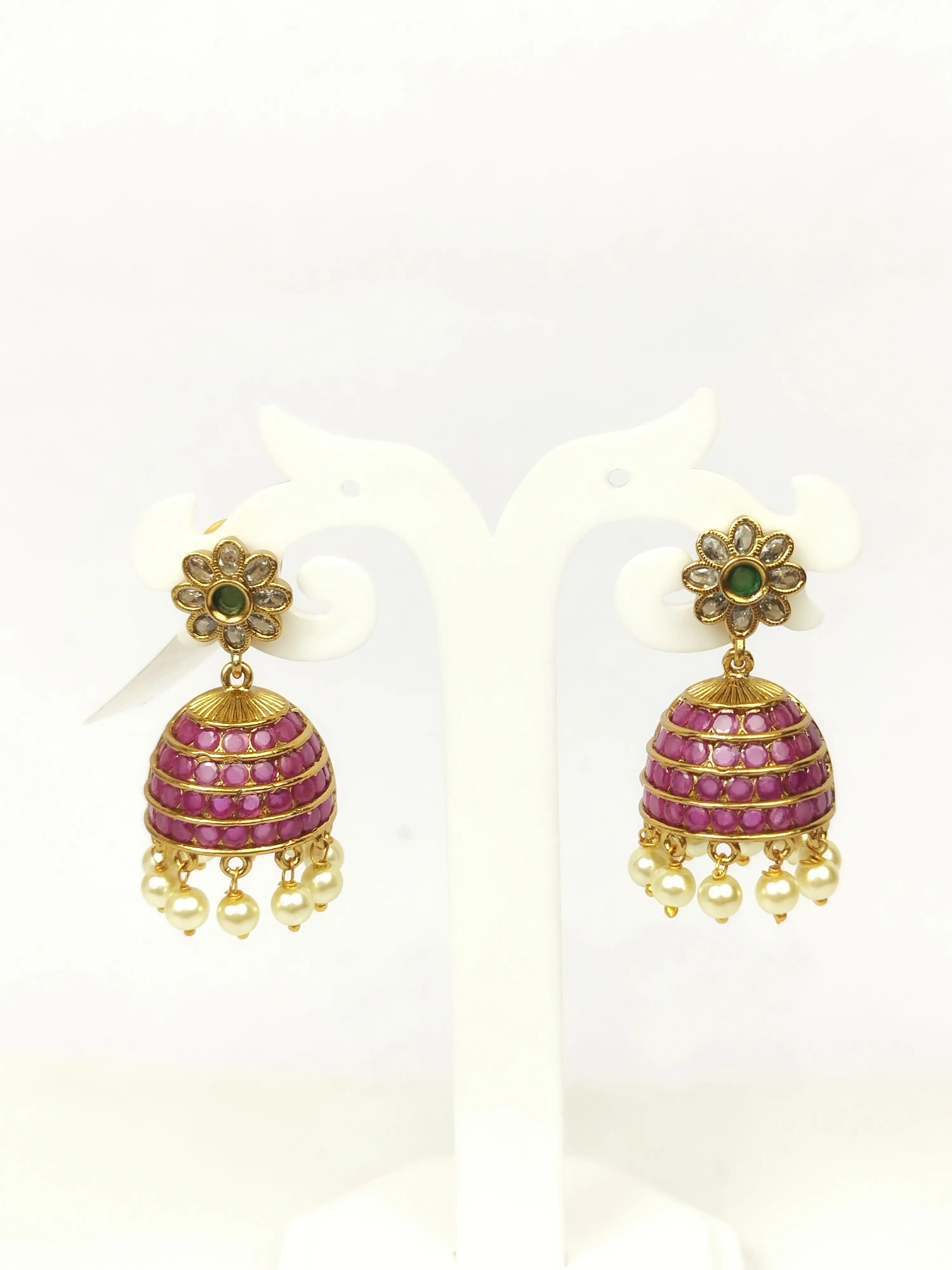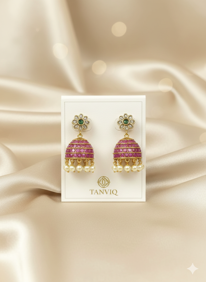 Stunning traditional jhumkas with a floral stud and an elaborate dome fully paved with brilliant ruby-red stones. Finished with a fringe of soft pearls, these earrings offer a rich, statement look for any celebration.
