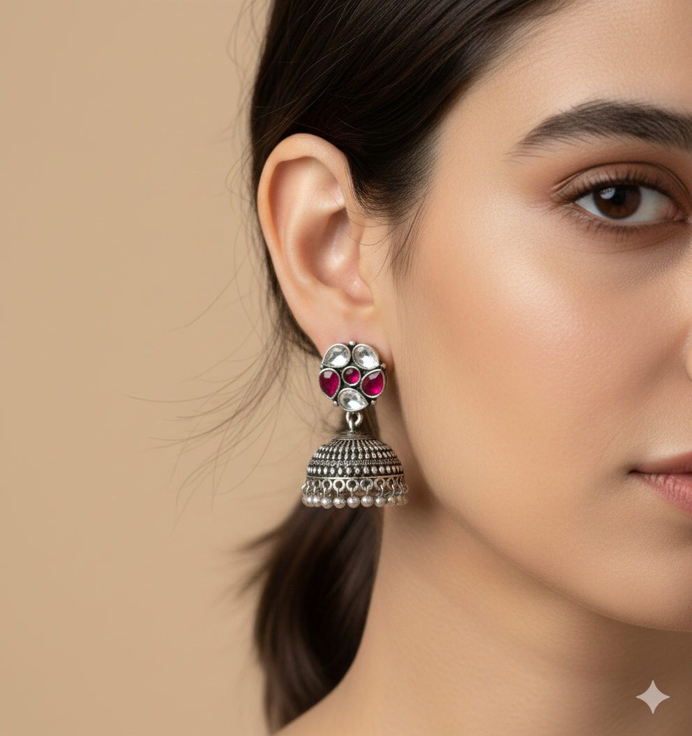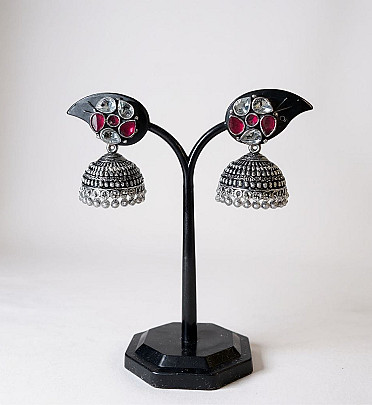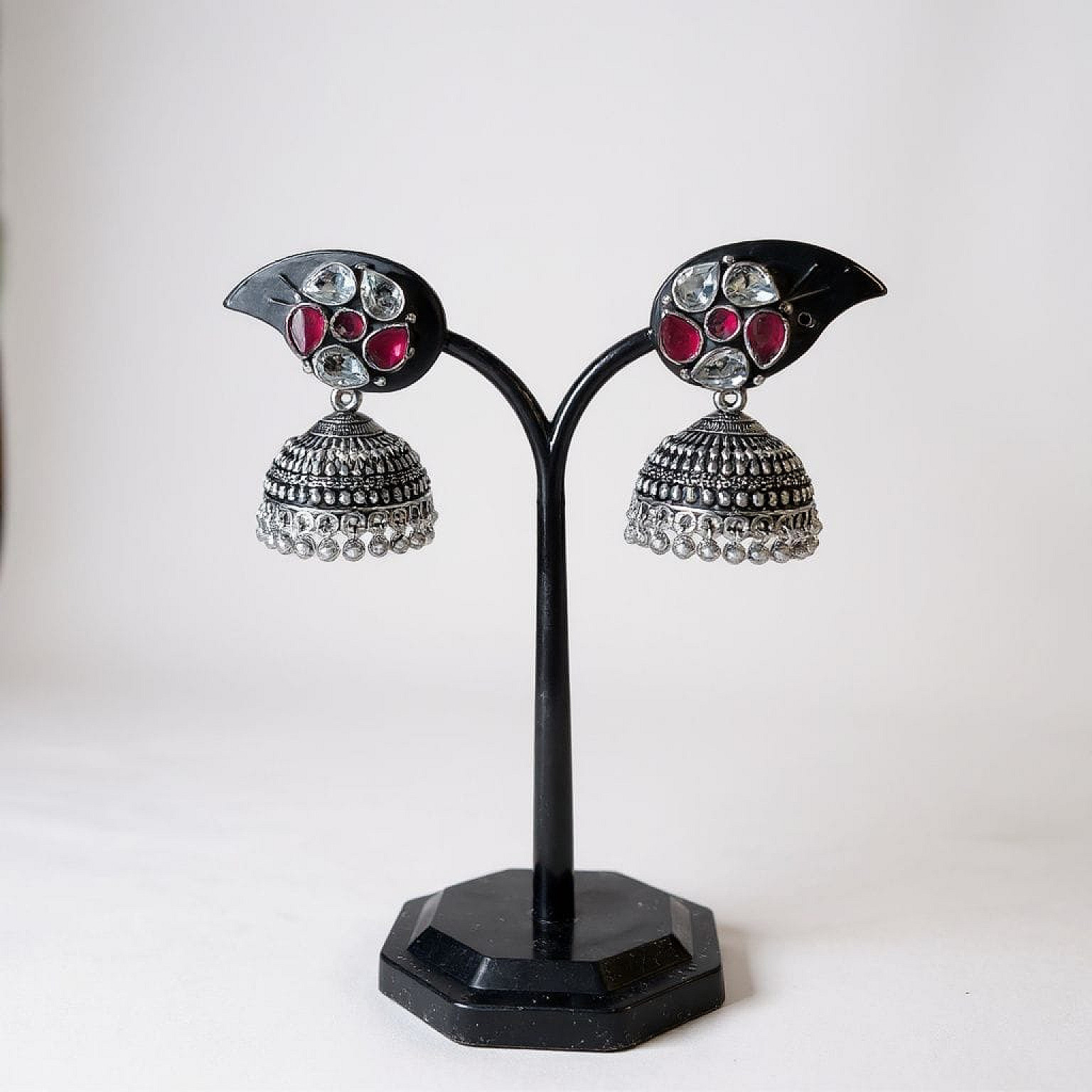 Elegant oxidized Jhumkas with ruby-red floral stones and white crystal detailing, finished with pearl drops for a timeless festive look.