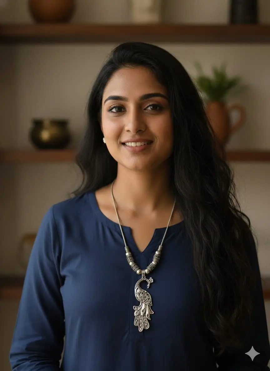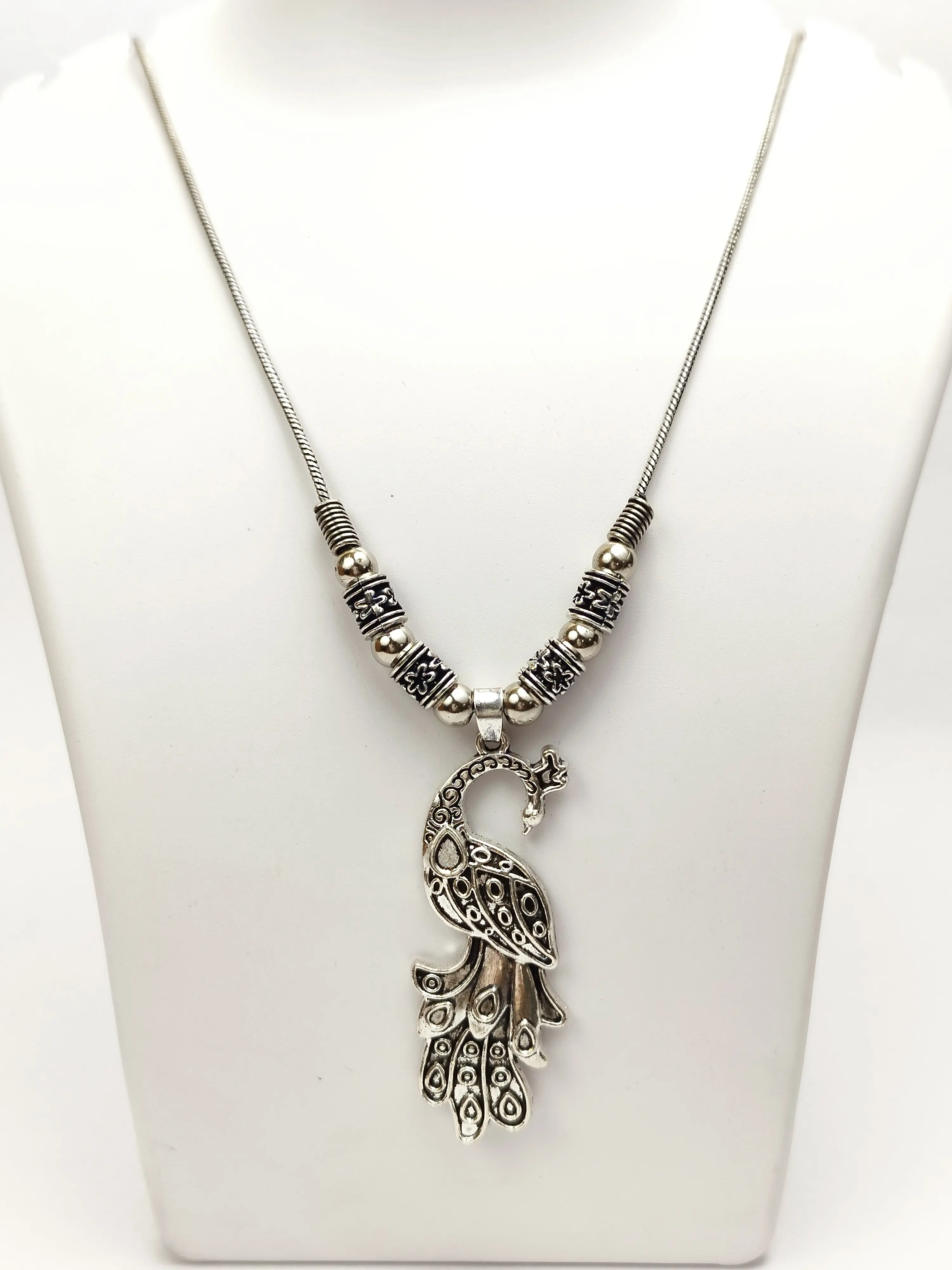 A charming oxidized silver necklace featuring a beautifully crafted peacock pendant. The intricate design captures a traditional essence, making it an ideal accessory for ethnic wear.