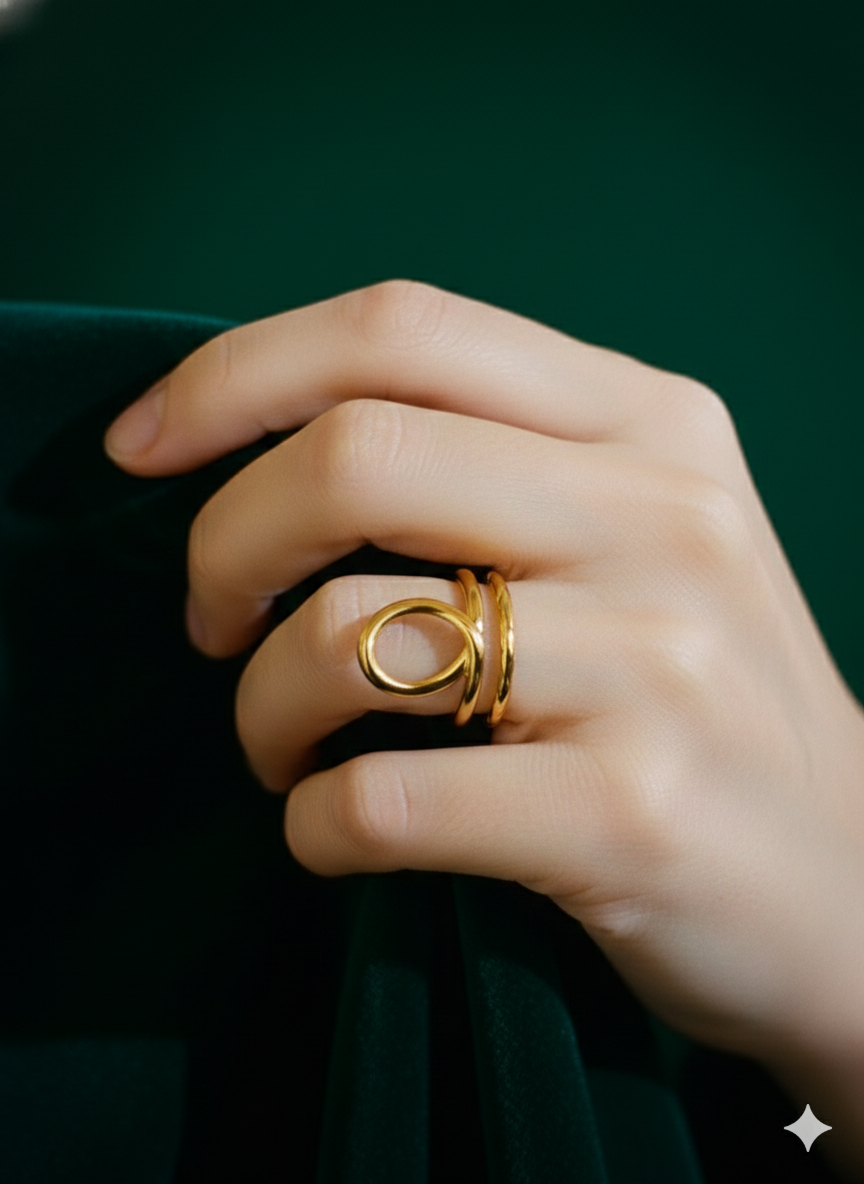 Stand out with the Solstice Ring. Featuring a unique vertical loop that sits elegantly above the band, this piece elongates the hand and offers a sophisticated, high-fashion look. Fit: Fully Adjustable
