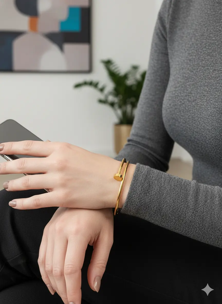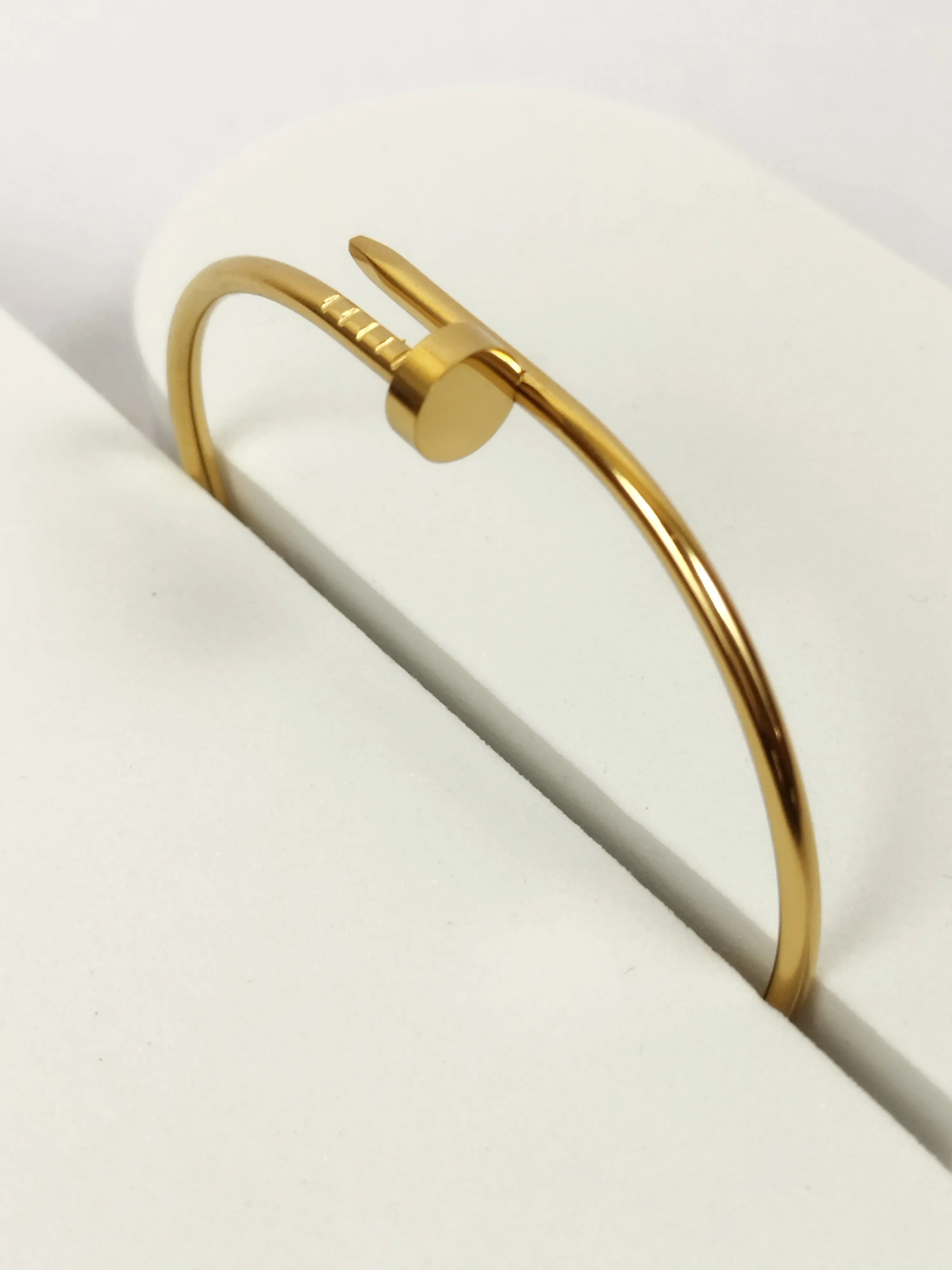 A fusion of bold design and luxurious detail, this Polished Gold & Pavé Nail Bangle is a statement piece. The structured gold-toned bangle is designed to look like a bent nail, with one end adorned in a pavé of brilliant cubic zirconia. It’s an edgy yet glamorous accessory that adds a unique twist to any outfit.
